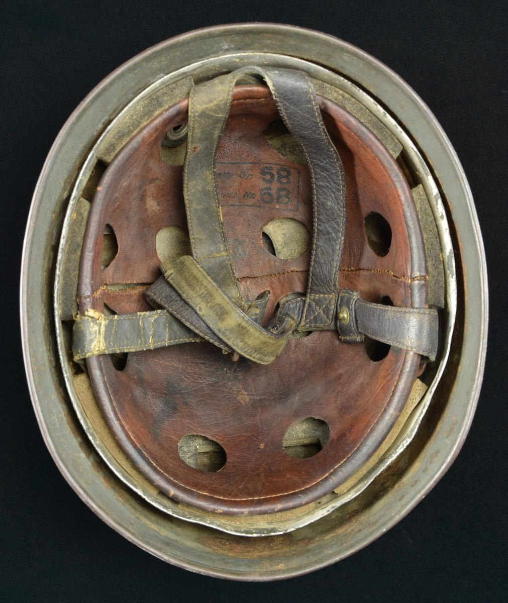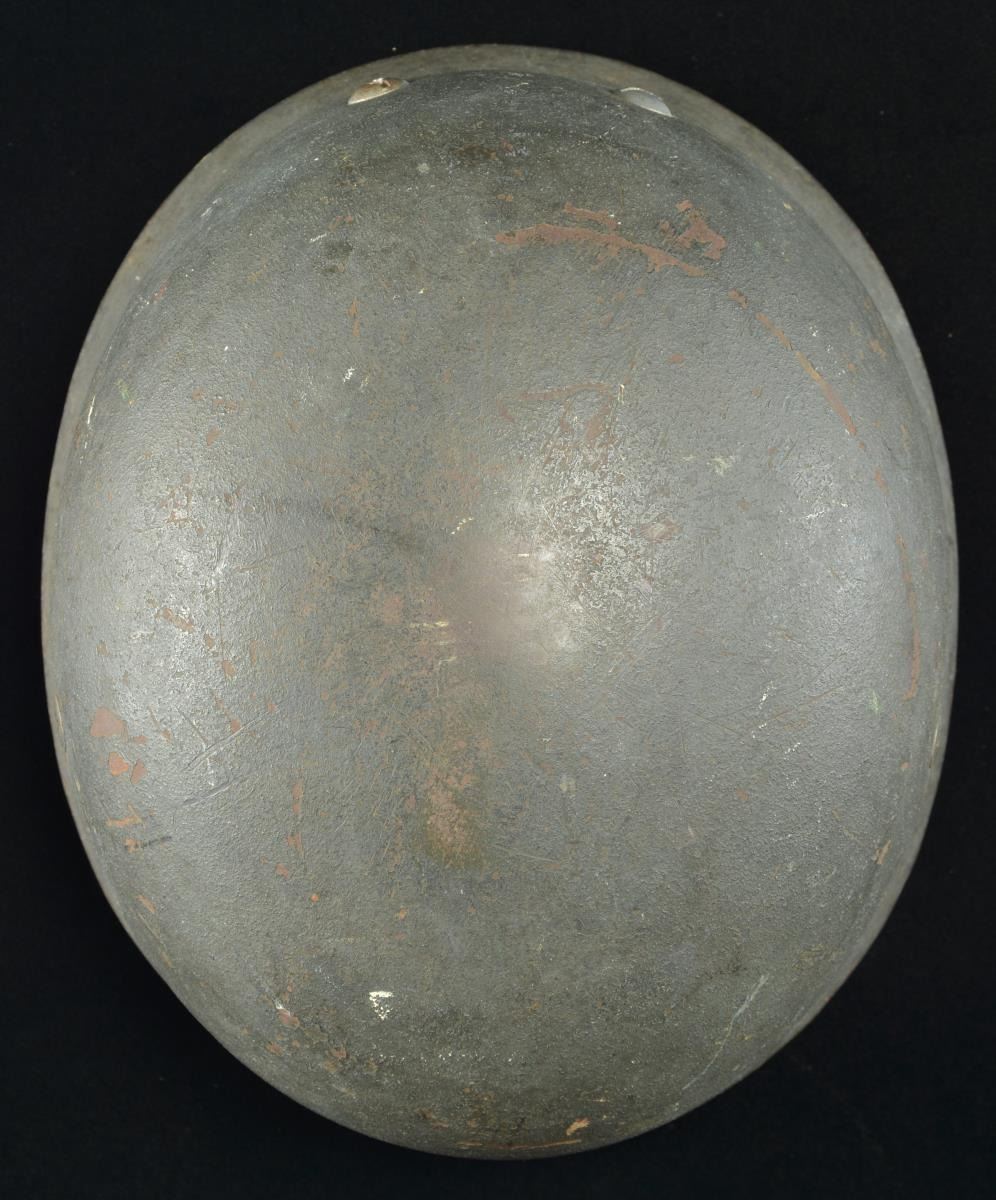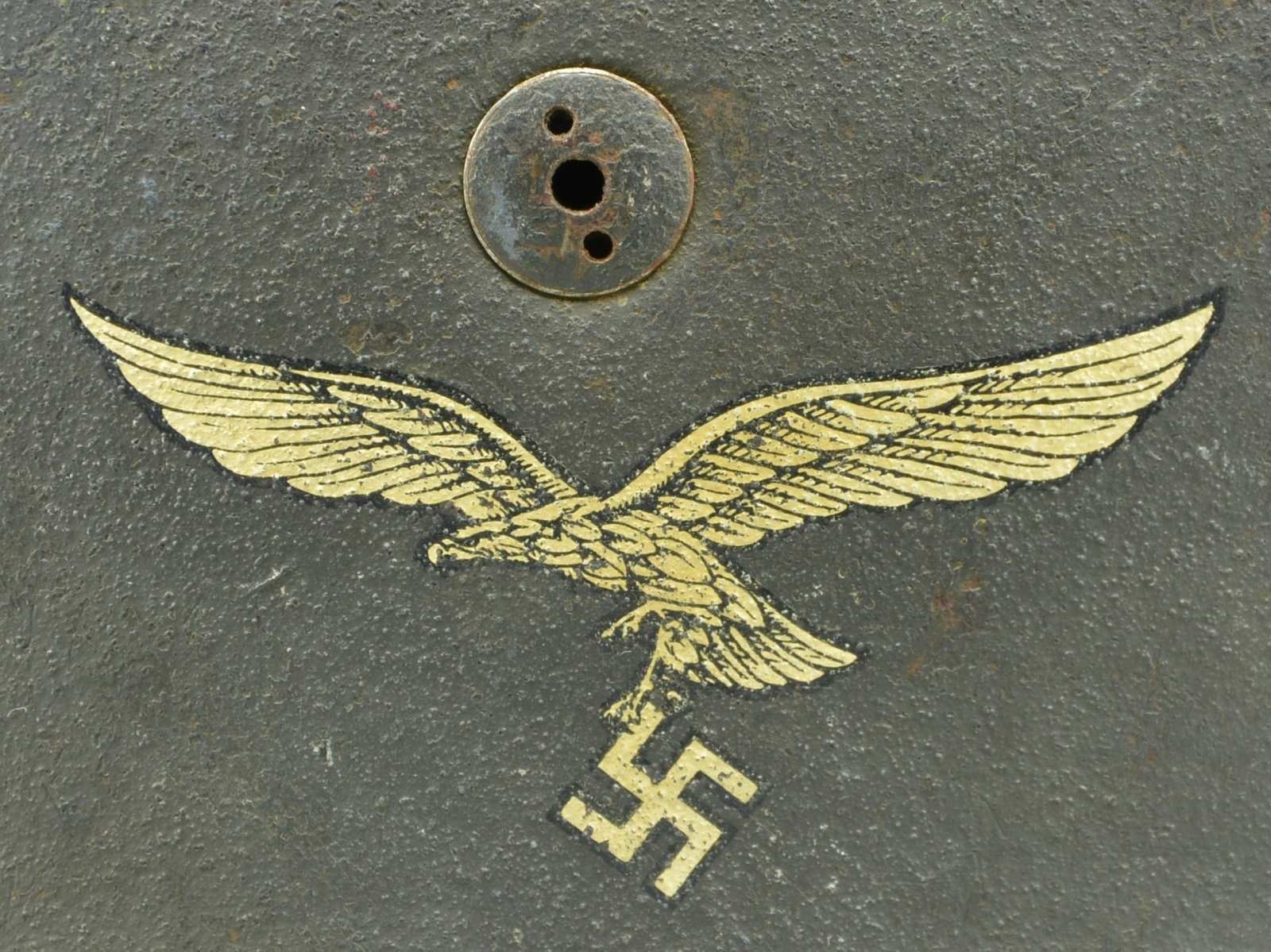 A fine original paratrooper helmet, as used by Fallschirmjager troops of the German Luftwaffe. This helmet appears to have been repainted a dark blue-green at the factory during WWII and has an original Luftwaffe decal on the left side. The helmet body is marked “ET71” on the inside left, but the batch number is difficult to read. The liner is completely original, as is the harness. The liner has worn Kopfweite & Stahlhelm marks, however, the “Gr.58” & “No.68” marks can be plainly seen. CONDITION: helmet finish is about 95%. Decal is also approx. 95%. Liner & harness show wear, but are undamaged. (02-18114-1/BF). $3,000-3,800.