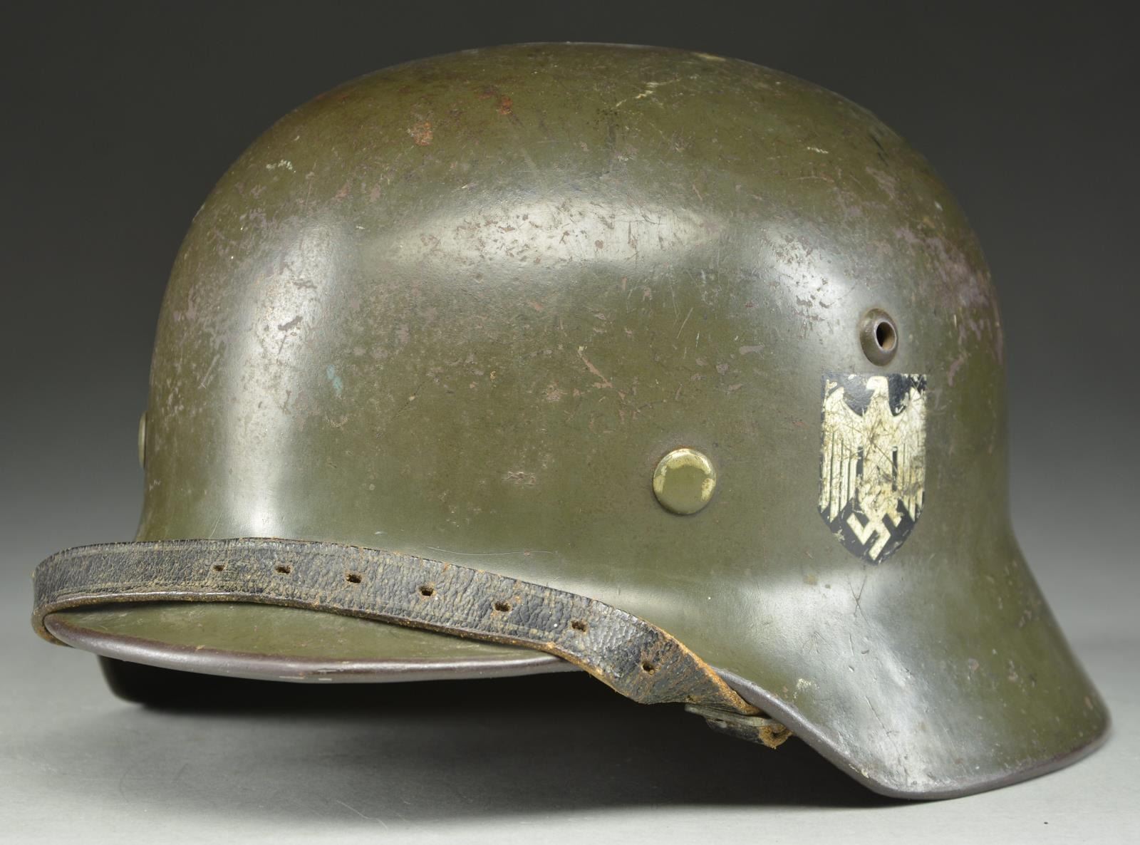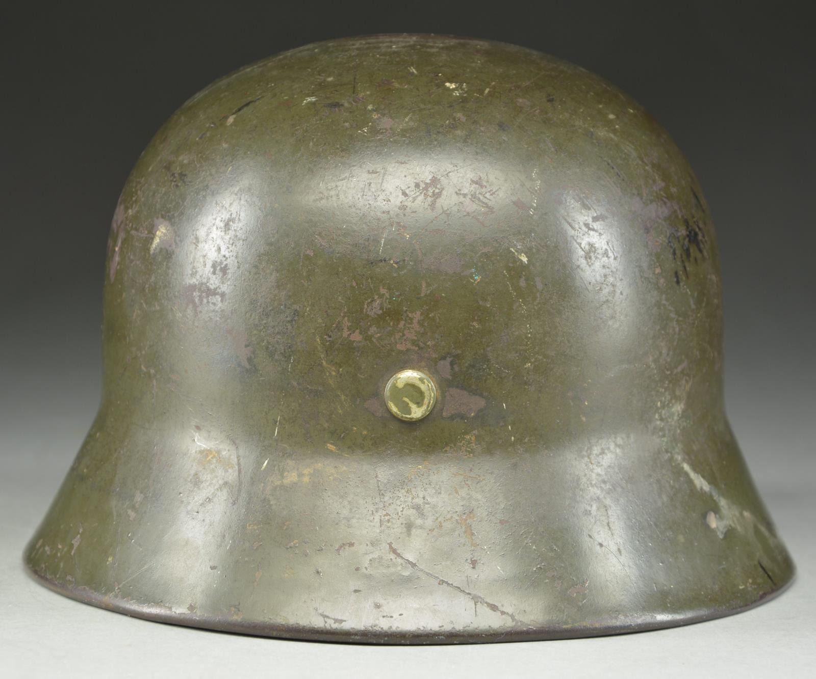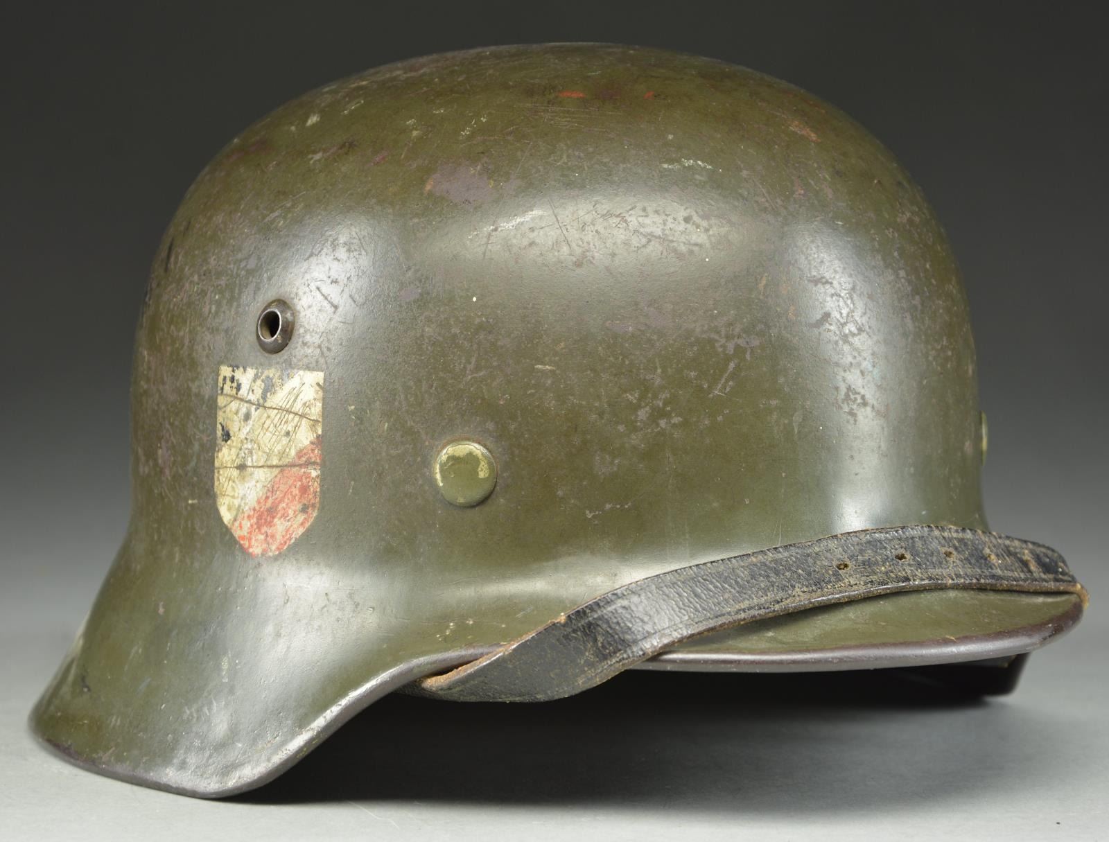 This helmet has a very dark gray-green painted finish. The left side has a Wehrmacht eagle and the right has the National Colors. The inside rear of the helmet is stamped “801” and the inside left is stamped “E.F.62”. Black leather chinstrap and brown 8-tongue size 55 leather liner. CONDITION: helmet finish is approx. 90%. The Wehrmacht decal is 75% and the National Colors decal is 50%. Chinstrap and liner show light to moderate wear. PROVENANCE: From the Lifelong Collection of Glen E. Mattox. (02-18929/BF). $600-900.