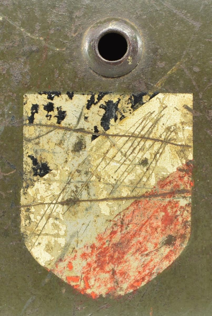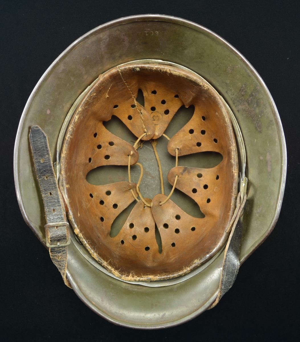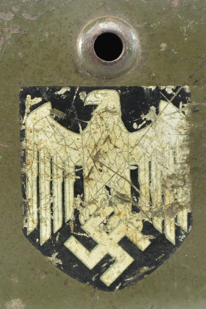 This helmet has a very dark gray-green painted finish. The left side has a Wehrmacht eagle and the right has the National Colors. The inside rear of the helmet is stamped “801” and the inside left is stamped “E.F.62”. Black leather chinstrap and brown 8-tongue size 55 leather liner. CONDITION: helmet finish is approx. 90%. The Wehrmacht decal is 75% and the National Colors decal is 50%. Chinstrap and liner show light to moderate wear. PROVENANCE: From the Lifelong Collection of Glen E. Mattox. (02-18929/BF). $600-900.