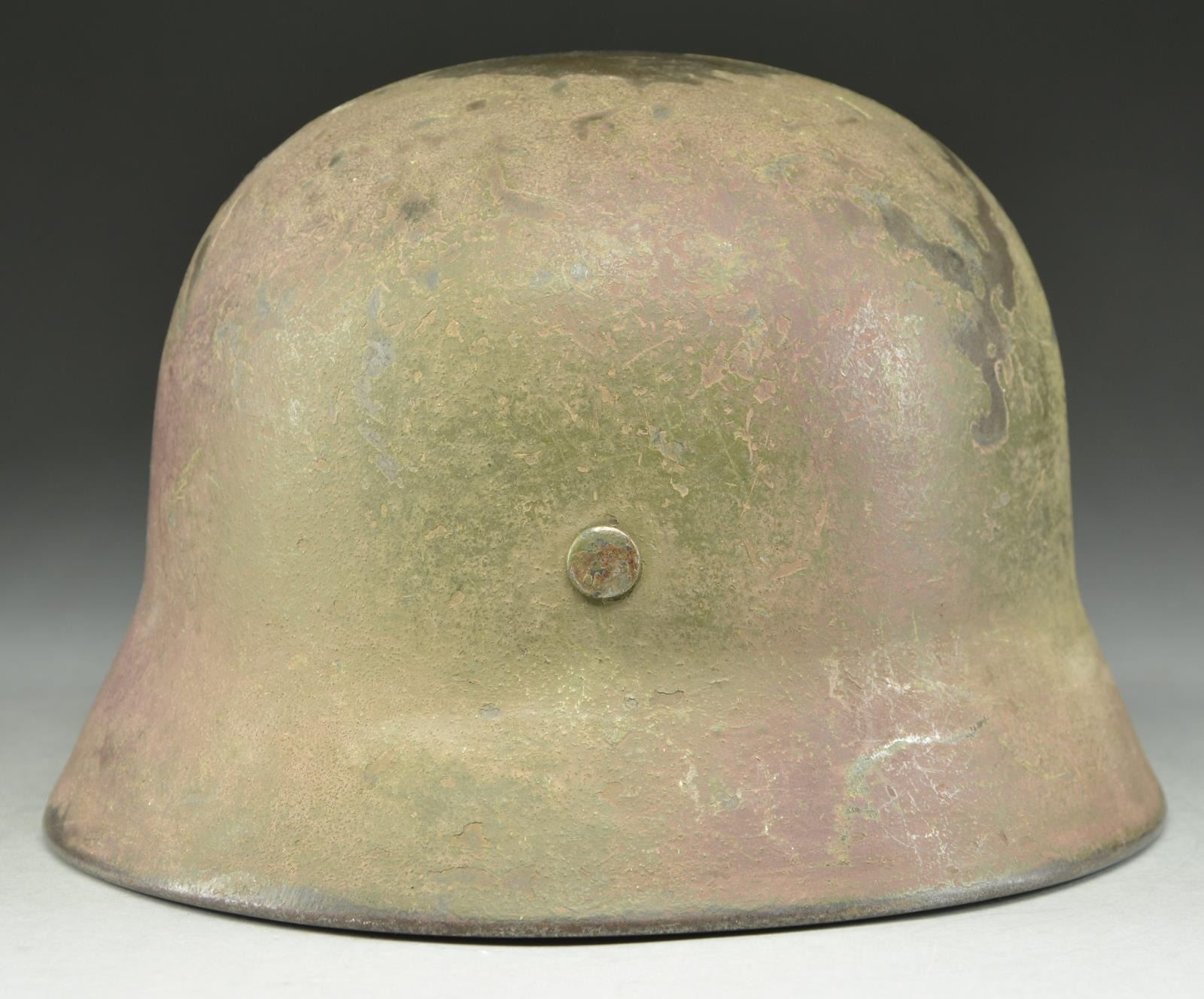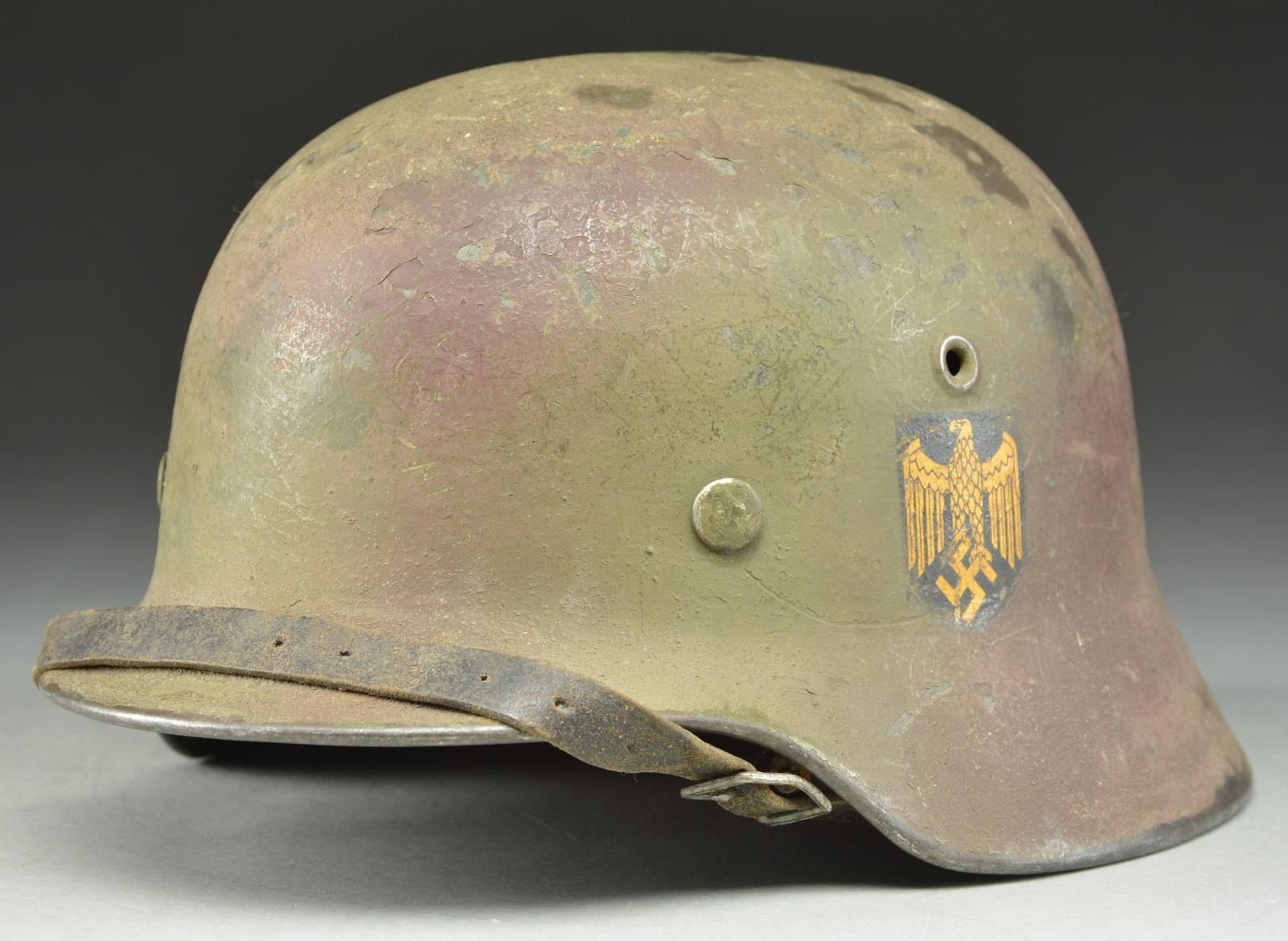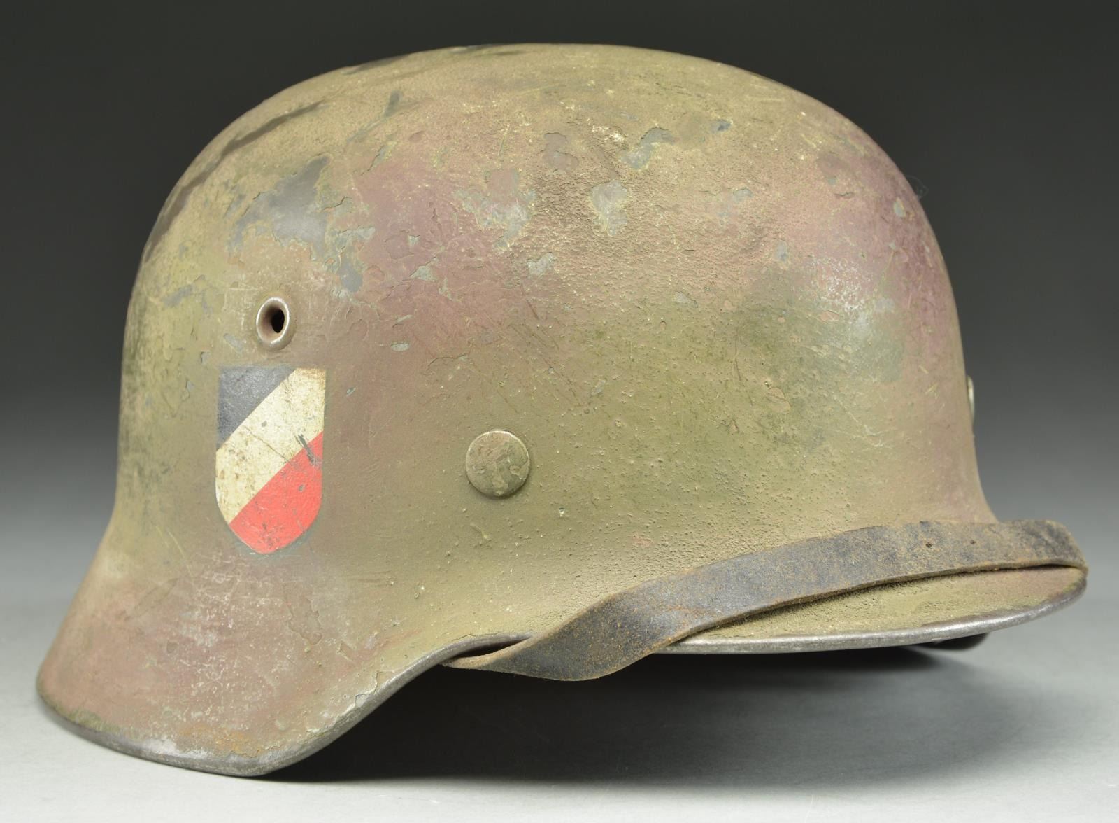 This helmet has a dark heavily sanded period finish over the original finish. The left side has a gold Wehrmacht style eagle and the right has the National Colors. The inside rear of the helmet is stamped “122_” and the inside left is stamped “ET64”. Black leather chinstrap and brown 8-tongue size 57 leather with the initials “J.W.”. CONDITION: helmet’s sanded finish is approx. 80%. The Navy/Coast Artillery decal is 90% and the National Colors decal is 90%. Chinstrap and liner show light to moderate wear. PROVENANCE: From the Lifelong Collection of Glen E. Mattox. (02-18926/BF). $1,200-1,500.