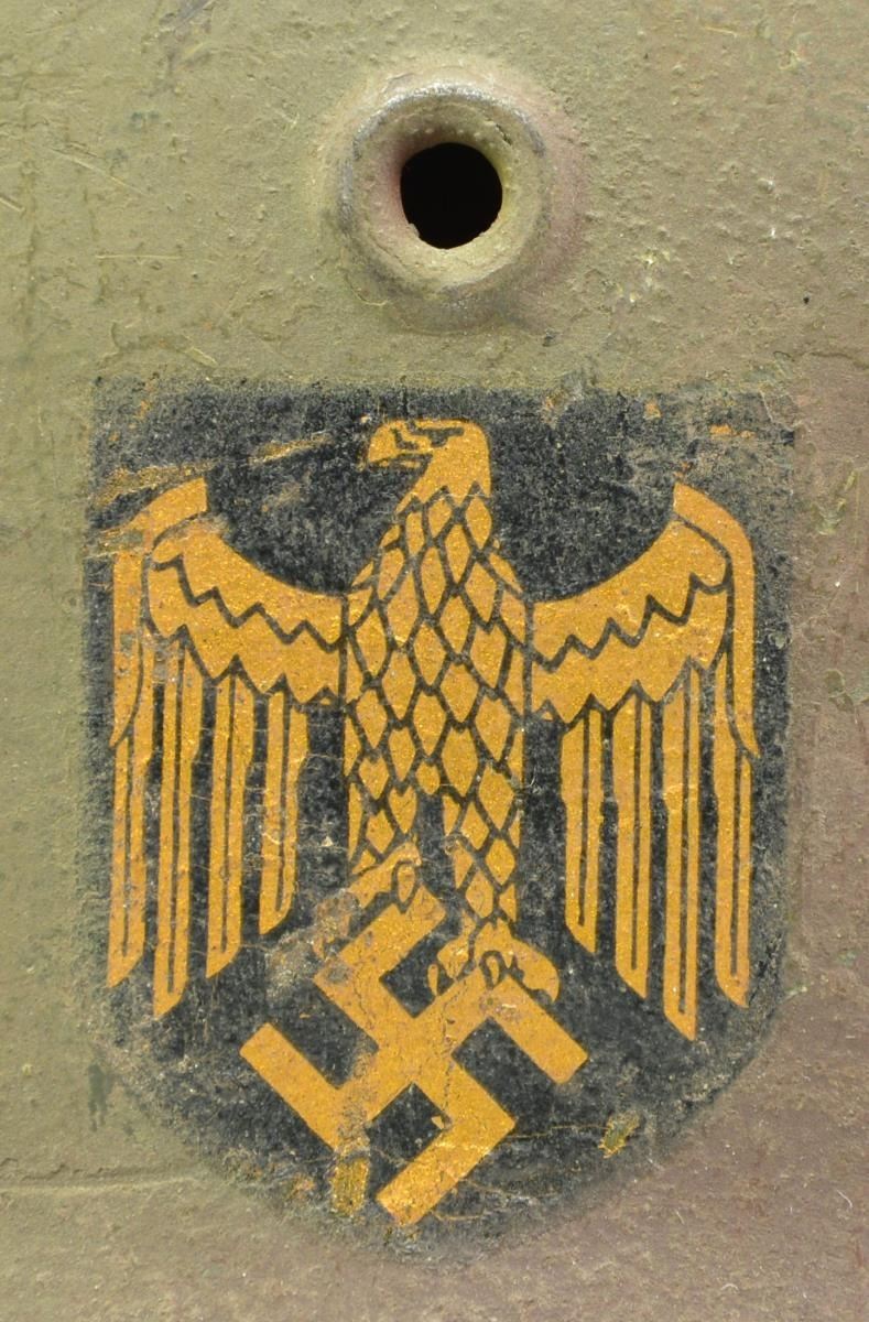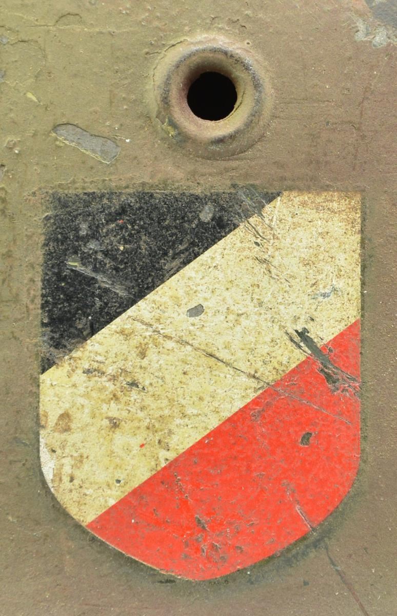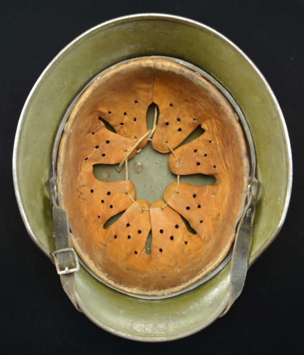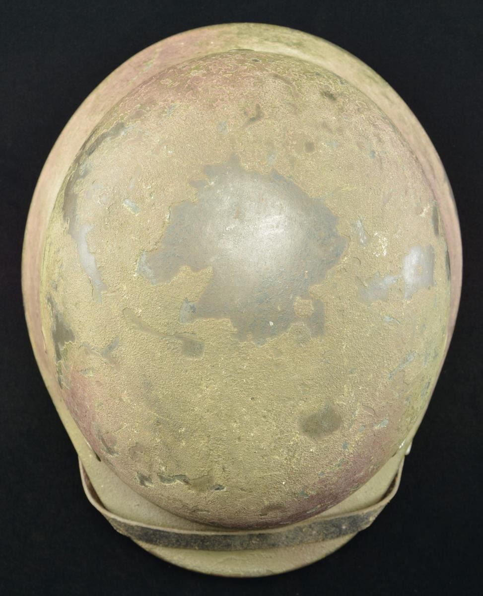 This helmet has a dark heavily sanded period finish over the original finish. The left side has a gold Wehrmacht style eagle and the right has the National Colors. The inside rear of the helmet is stamped “122_” and the inside left is stamped “ET64”. Black leather chinstrap and brown 8-tongue size 57 leather with the initials “J.W.”. CONDITION: helmet’s sanded finish is approx. 80%. The Navy/Coast Artillery decal is 90% and the National Colors decal is 90%. Chinstrap and liner show light to moderate wear. PROVENANCE: From the Lifelong Collection of Glen E. Mattox. (02-18926/BF). $1,200-1,500.