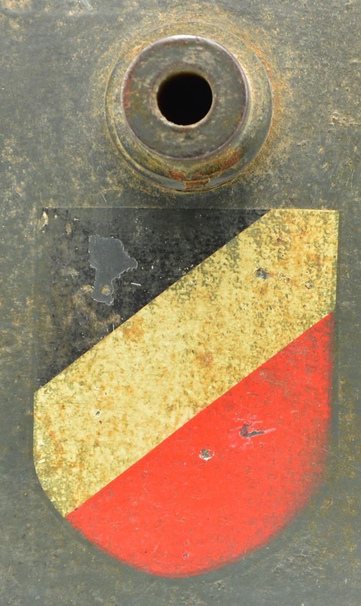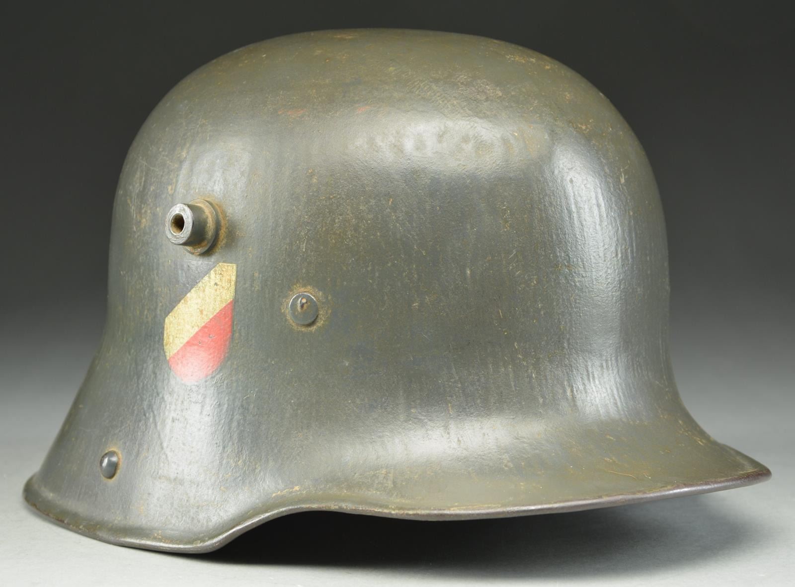This reissued helmet has a dark gray-blue painted finish on a M1916/17 shell. The left side has a Luftwaffe decal and the right has the National Colors. The inside crown of the helmet is stamped “BW326” and the inside left is stamped “_.F.64”. There is no chinstrap and the helmet retains a partial brown 3-pad WWI style liner. CONDITION: helmet finish is approx. 97%. The Luftwaffe decal is 99% and the National Colors decal is 96%. Liner shows moderate wear with minor losses and separation. PROVENANCE: From the Lifelong Collection of Glen E. Mattox. (02-18924/BF). $900-1,300.