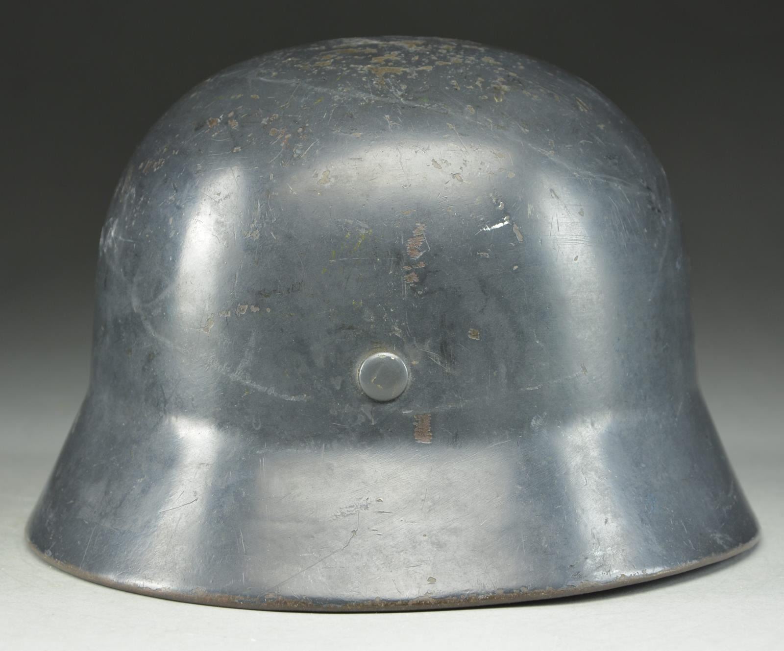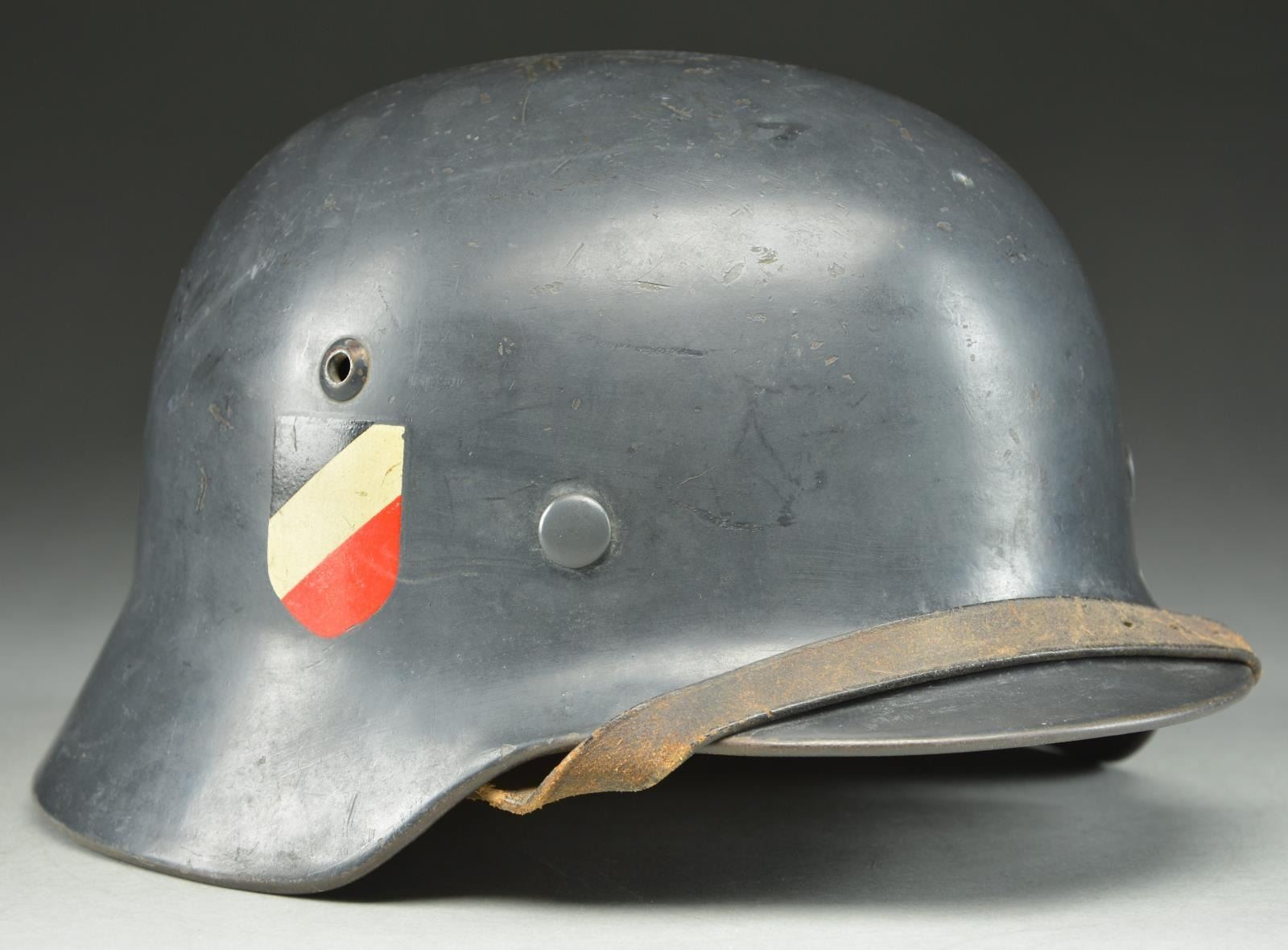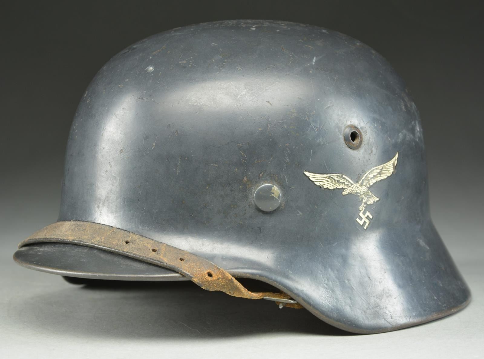This helmet has a dark gray-blue painted finish. The left side has a Luftwaffe eagle and the right has the National Colors. The inside rear of the helmet is stamped “3944” and the inside left is stamped “SF64”. Brown leather chinstrap and brown 8-tongue size “5_” leather liner. CONDITION: helmet finish is approx. 95%. The Luftwaffe decal is 90% and the National Colors decal is 99%. Chinstrap and liner show light to moderate wear. PROVENANCE: From the Lifelong Collection of Glen E. Mattox. (02-18930/BF). $800-1,100.