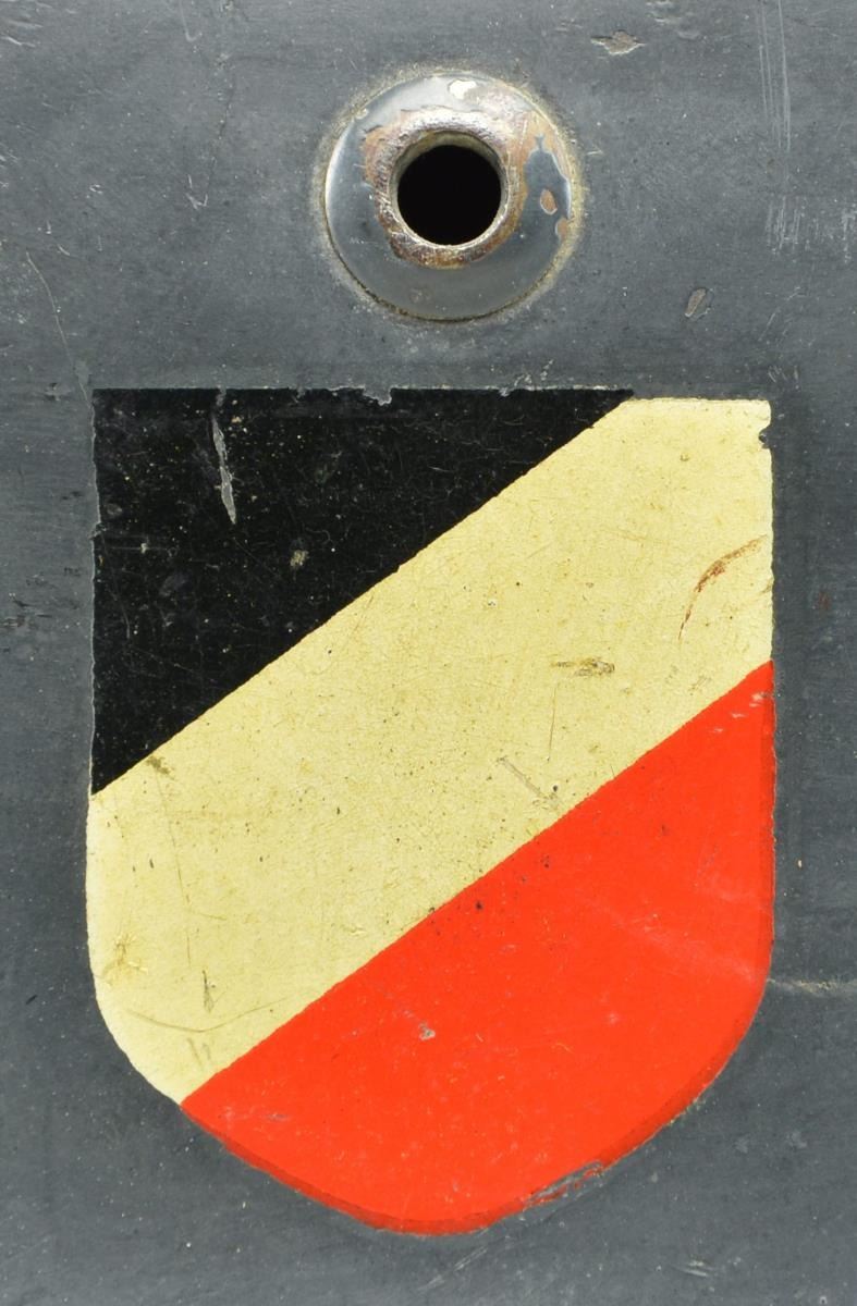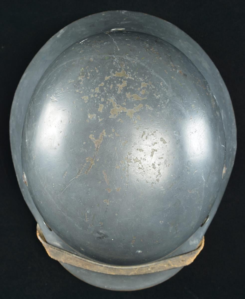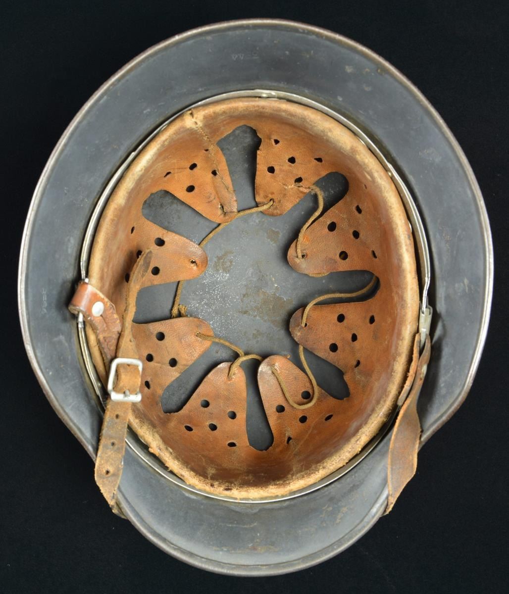 This helmet has a dark gray-blue painted finish. The left side has a Luftwaffe eagle and the right has the National Colors. The inside rear of the helmet is stamped “3944” and the inside left is stamped “SF64”. Brown leather chinstrap and brown 8-tongue size “5_” leather liner. CONDITION: helmet finish is approx. 95%. The Luftwaffe decal is 90% and the National Colors decal is 99%. Chinstrap and liner show light to moderate wear. PROVENANCE: From the Lifelong Collection of Glen E. Mattox. (02-18930/BF). $800-1,100.