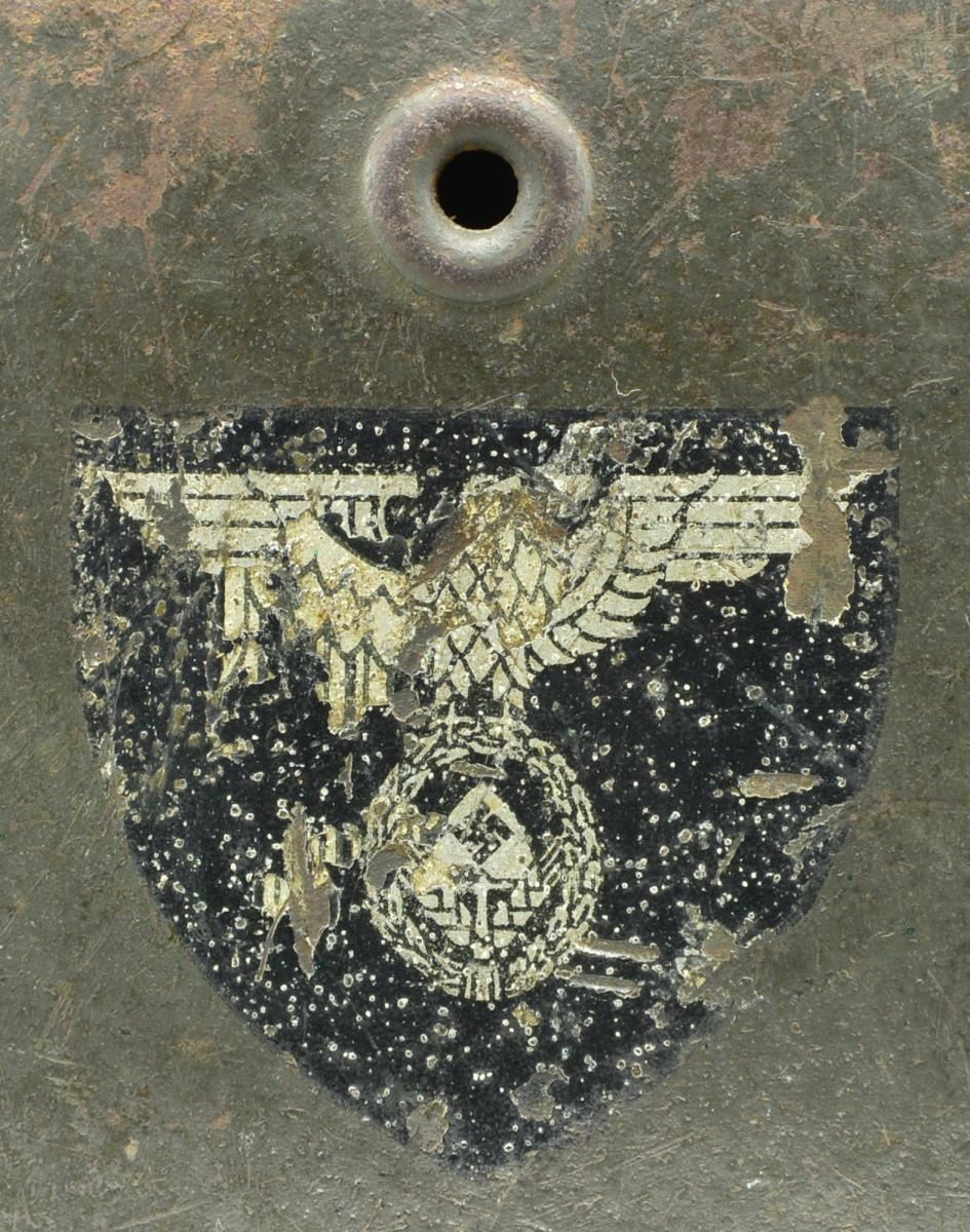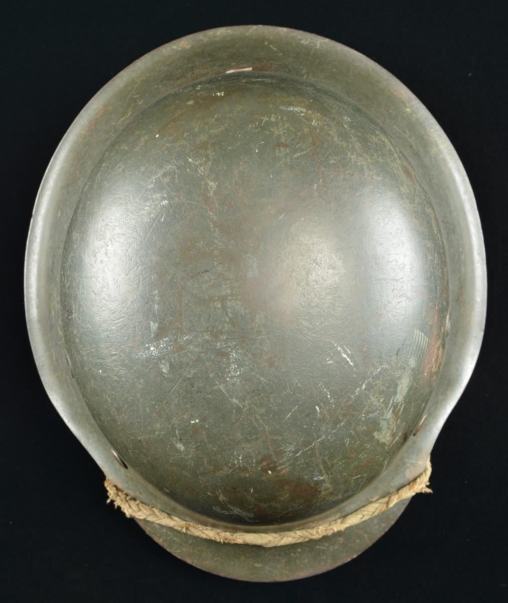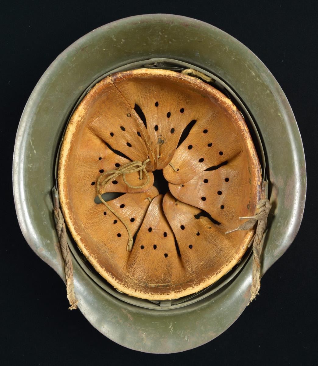 This scarce RAD helmet has embossed vents and a raw edge indicating M1942 design. It has a dark gray-green painted finish with a black & silver RAD decal on the left side. The “make-do” chinstrap was created from woven shoelaces. The 8-tongue light brown size 58 leather liner is inscribed with the name “Ovm. H. Frohlich” along with various other markings. The inside rear of the helmet is stamped “18_2” and the inside left is stamped “ET66”. A name is scratched into the inside rim of the helmet that appears to read “Schelp_ Ray”. CONDITION: helmet finish is about 95%. Decal is about 70%. Liner & “make-do” chinstrap show light to moderate wear. PROVENANCE: From the Lifelong Collection of Glen E. Mattox. (02-18243/BF). $500-750.