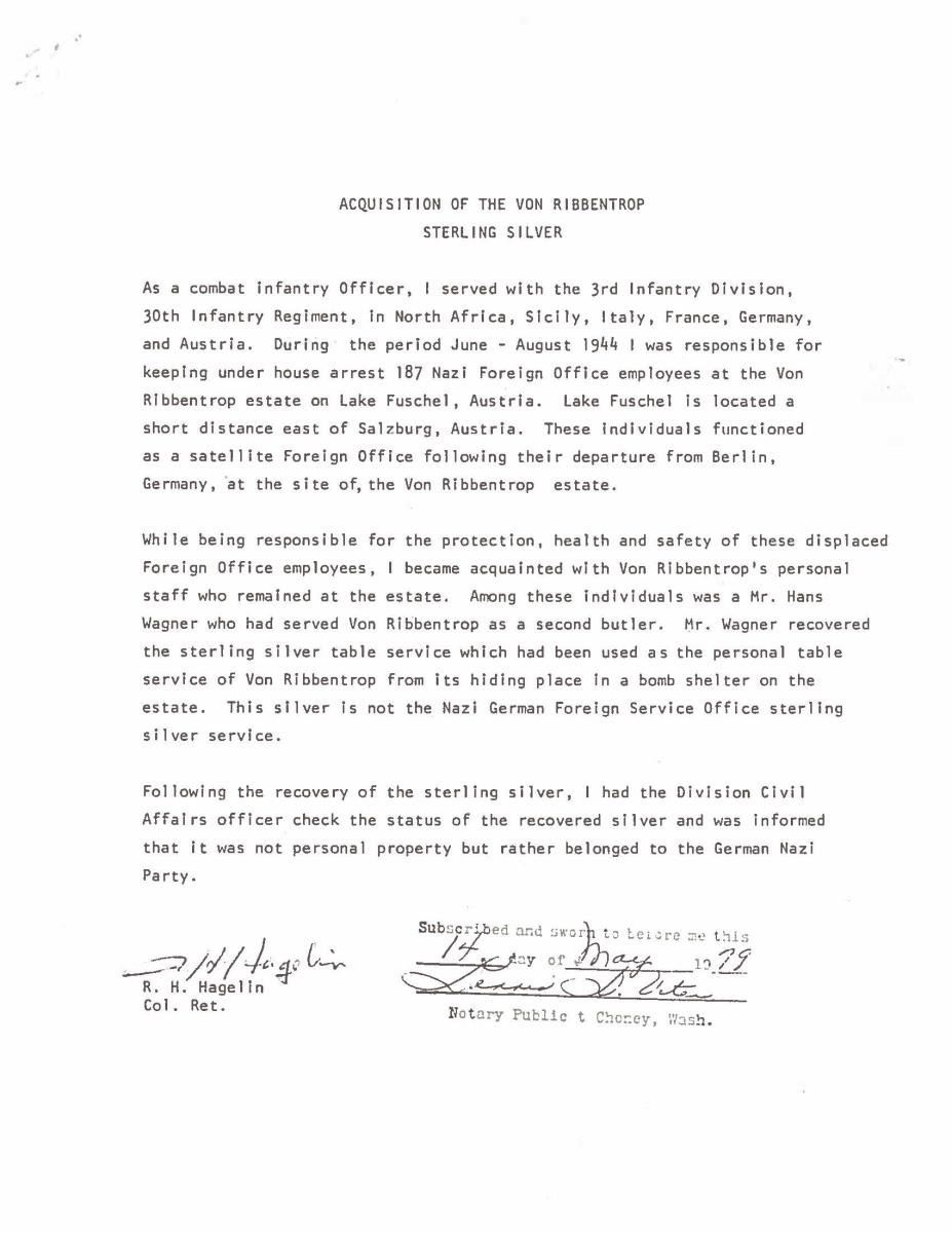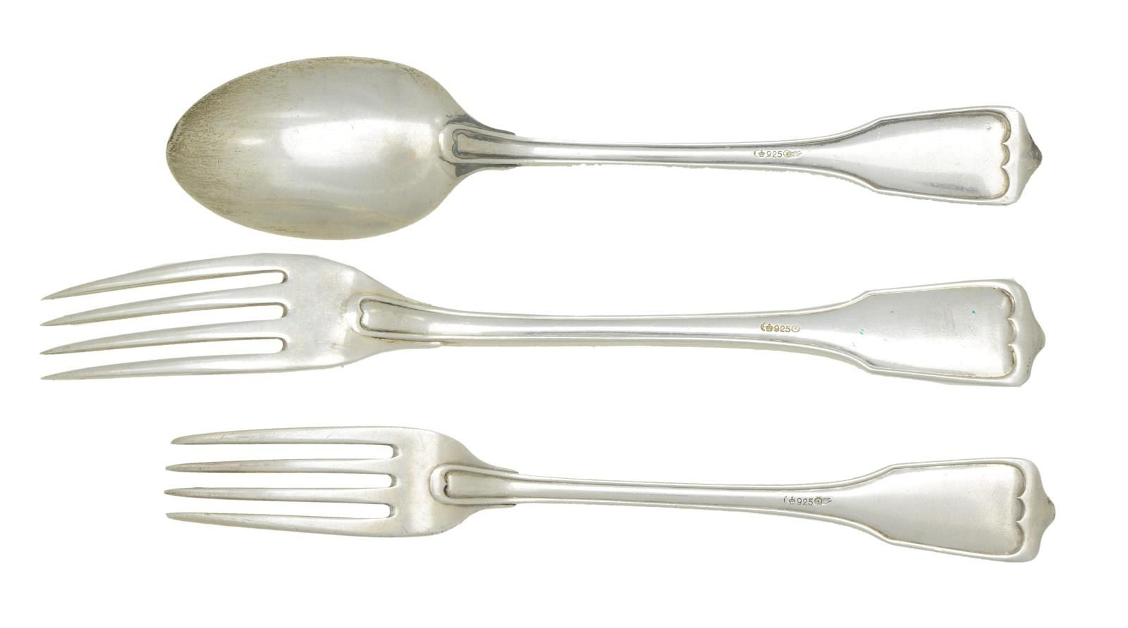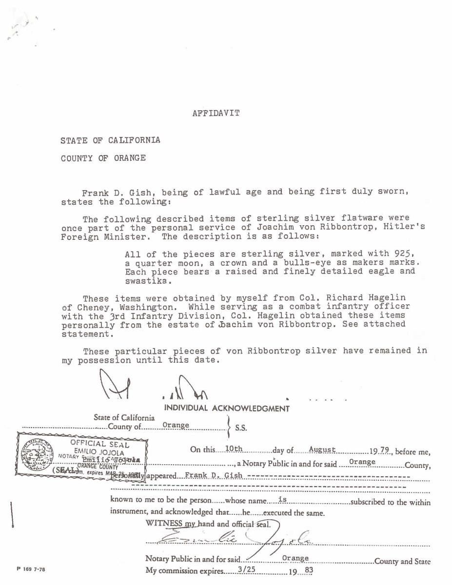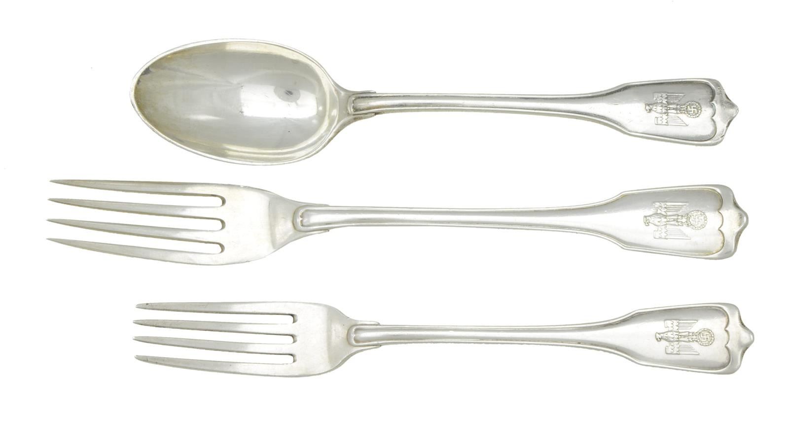 These 2 forks and spoon belonged to Joachim von Ribbentrop, the Reichs Minister of Foreign Affairs for Germany during WWII. He had a long career as a German politician & diplomat. Ribbentrop was a close friend and confidant of Adolf Hitler. He was executed by the allies as a war criminal after the Nuremberg trials. This silver flatware was part of his personal service used at home for formal entertaining and likely for diplomatic functions. The silver was made by Korner & Proll of Berlin. The 4-tined dinner fork measures 8 1/8”, the salad fork measures 7 1/8” and the table spoon measures 7 3/16”. All pieces have a relatively plain handle with an incised border and feature a diplomatic eagle atop a wreath surrounding a party symbol. The reverse of the table spoon and salad fork are marked “(crescent moon) (crown) 925 (winged wheel)” and the dinner fork is marked “(crescent moon) (crown) 925 (circle)”. This silver was recovered at Ribbentrop’s personal estate by Colonel R.H. Hagelin of the 30th Infantry Regiment of the 3rd Infantry Division. They were purchased from Hagelin by Frank Gish who supplies documentation of provenance. UNATTACHED ACCESSORIES: copies of notarized letters from R. Hagelin and F. Gish, along with related informational material. CONDITION: the 3 pieces of flatware show light overall wear with a lightly tarnished patina. (02-19034-11/BF). $1,200-1,500.