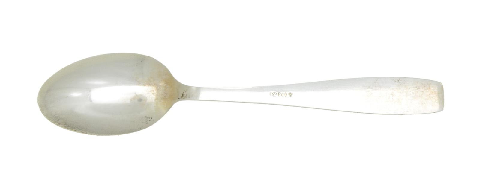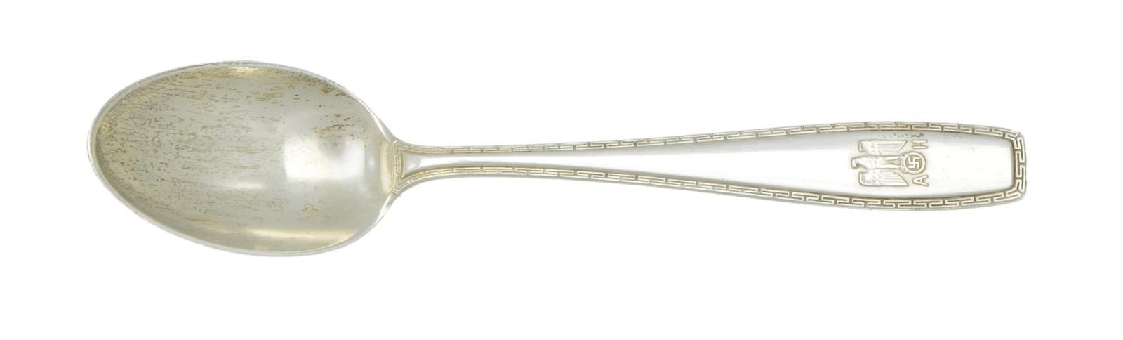 This spoon, made by Brückmann & Sohne of Heilbronn, Baden-Württemberg, measures 4 3/8" in length. The spoon has a 1 1/2" bowl and a modified Greek key-like border. The flat of the handle has a droop-wing German eagle perched on a wreath that surrounds a party symbol. The letters “A” & “H” flank the wreath. The reverse of the spoon is plain and stamped “(crescent moon) (crown) 800 (Prussian eagle)”. CONDITION: the spoon shows light overall wear with a lightly tarnished patina. (02-19034-6/BF). $1,200-1,500.