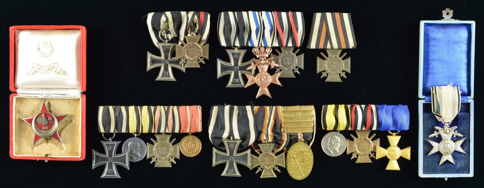 4) 3 MEDAL BAR. A 3 award medal bar consisting of a Wurttemberg Medal for Merit, a 1914-18 Cross with swords, and a Prussian Officer’s 25-Year Service Cross.