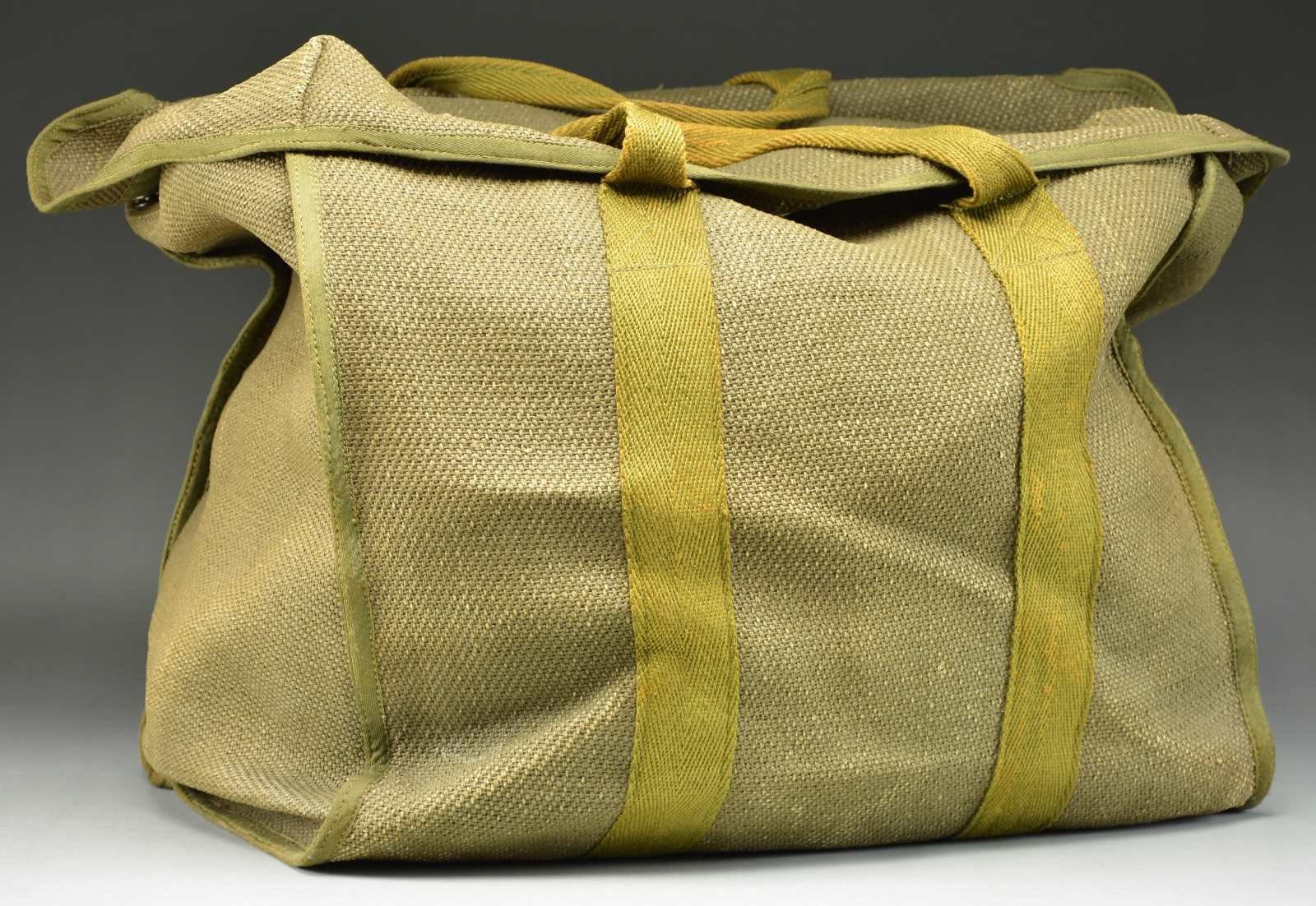 BAG. A fine example of a later war WWII German RZ-36 parachute & original carrying bag. The RZ-36 model was used by paratroopers jumping from the HE-111 and the JU-52 aircraft. They saw use late in the war primarily in airborne operations during The Battle of the Bulge. The parachute is constructed of cotton, silk & canvas and features quick release buckles. The Fallschirmjager were a branch of the Luftwaffe and fought in large scale airborne operations throughout WWII. They were commanded by General Kurt Student. General Student commanded the first large scale airborne attack in history at The Hague and subsequently the infamous airborne operations against Crete. CONDITION: parachute has not been unpacked, but appears to be in solid condition with operable buckles. The exterior carrying case shows light to moderate wear. (02-18115-3/BF). $2,500-3,500.