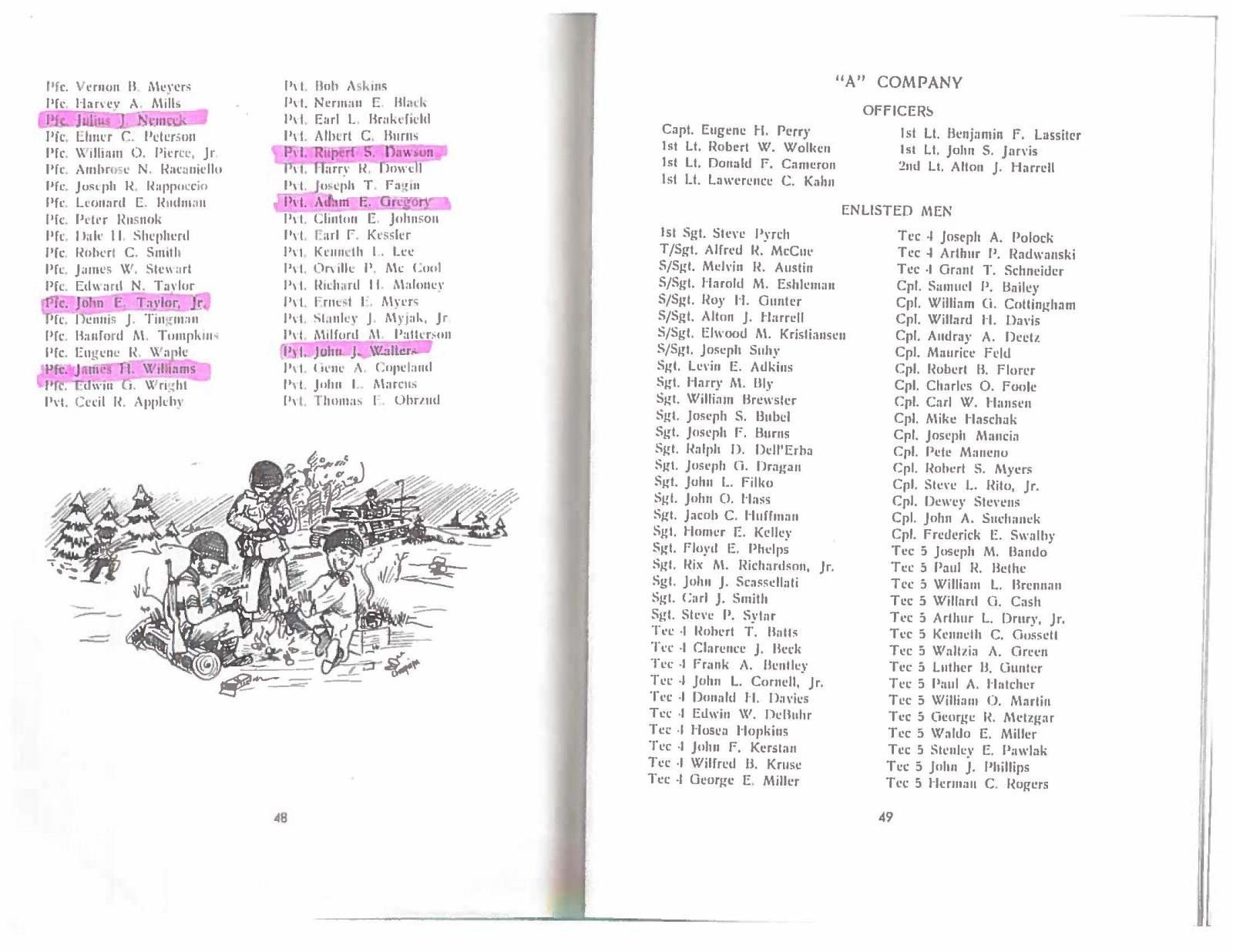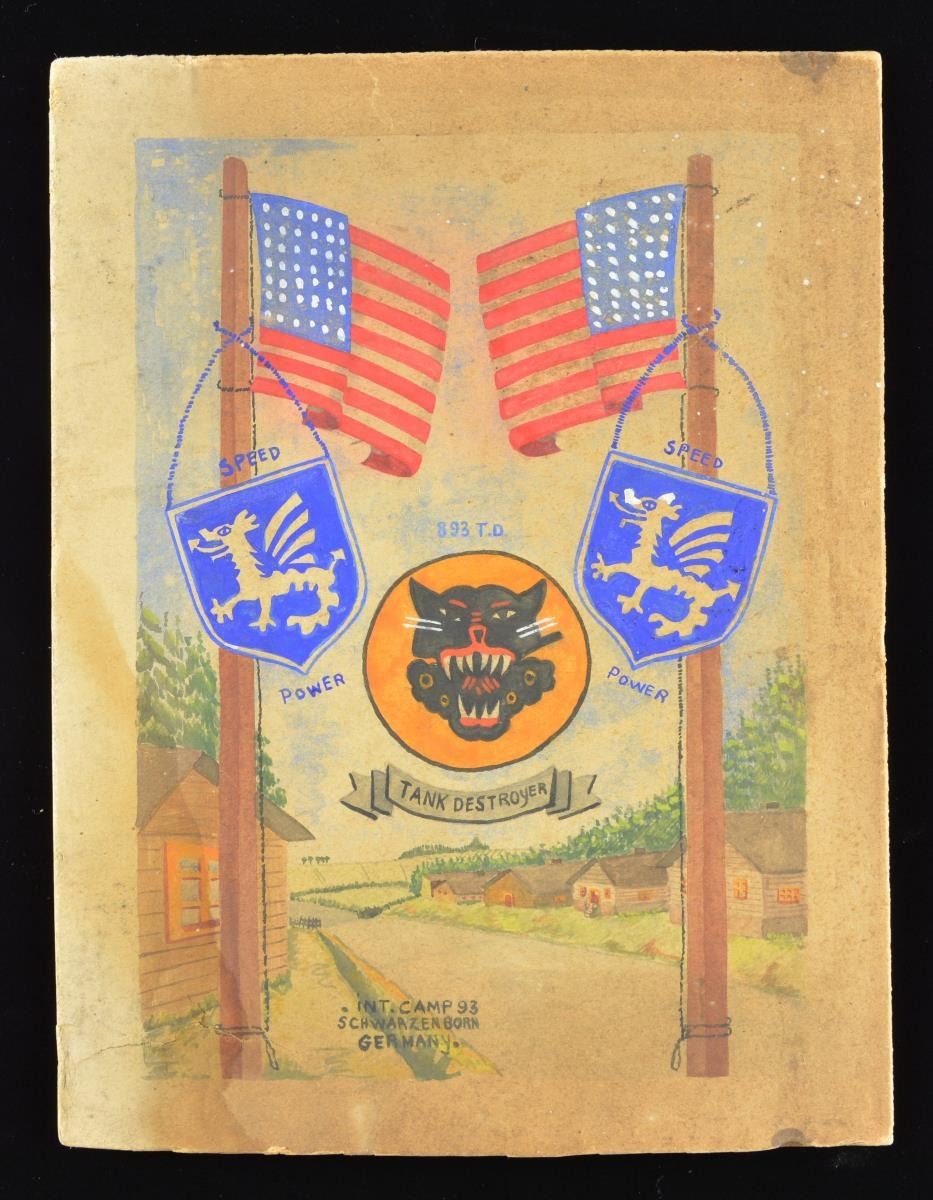 This group includes a one-sided banner of standard DAF design and measures 54” squared. The center features a printed black cogwheel with central party symbol on a sewn white cogwheel backing. The body of the banner is red and has 3” white fringe at the bottom. The central device was signed by several members of the 893rd Tank Destroyer Battalion presumably when the flag was captured in Germany. The signatures are in blue ink and appear to be mostly by the same pen. Accompanying the flag is a 10 3/4" x 8 1/4" small painting of Interment Camp 93 at Schwarzenborn, Germany, along with American flags & insignia of the 893rd Tank Destroyer Battalion. UNATTACHED ACCESSORIES: several pages of information on the 893rd and its members. CONDITION: flag & signatures have faded a bit with age, but remain quite legible. There is scattered staining and a few holes from wear. The painting has yellowed a bit, but colors remain crisp & vibrant. (02-19455/BF). $1,000-1,600.