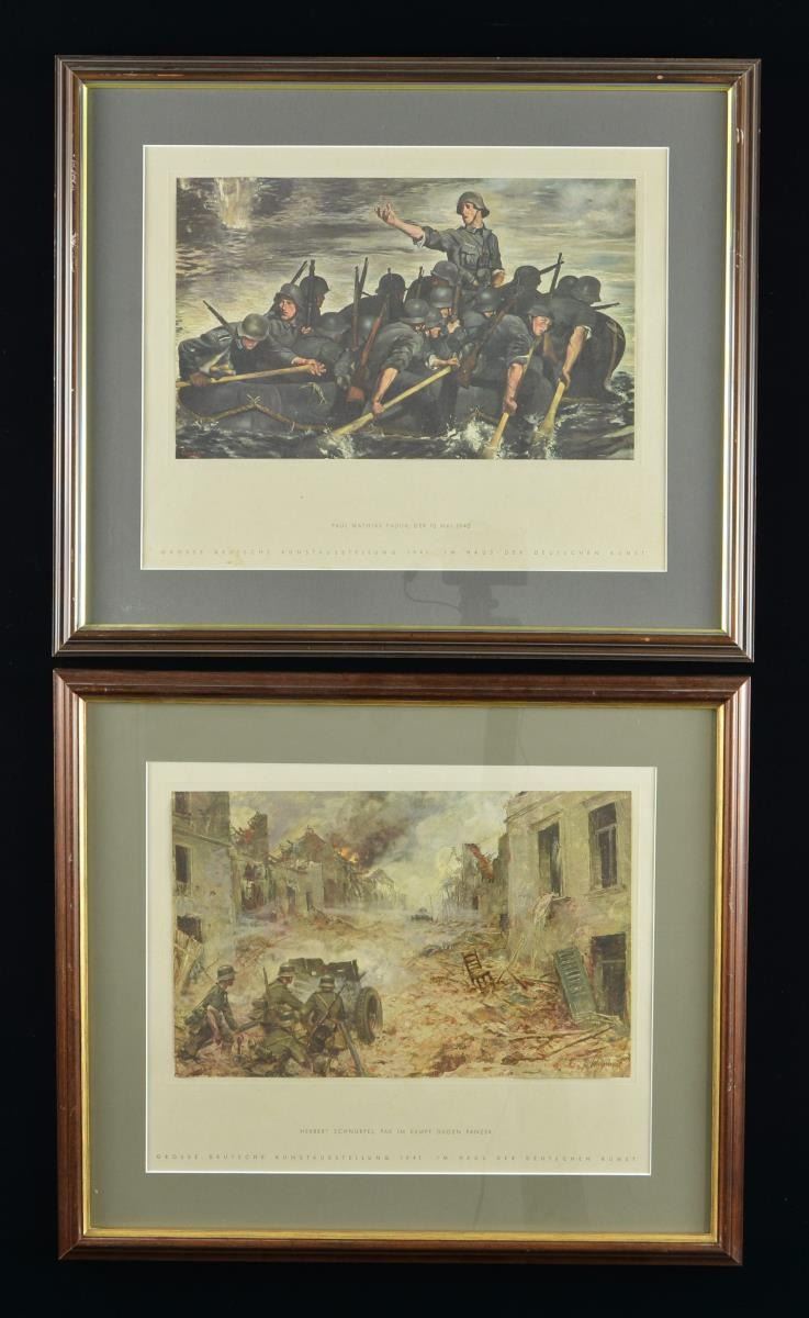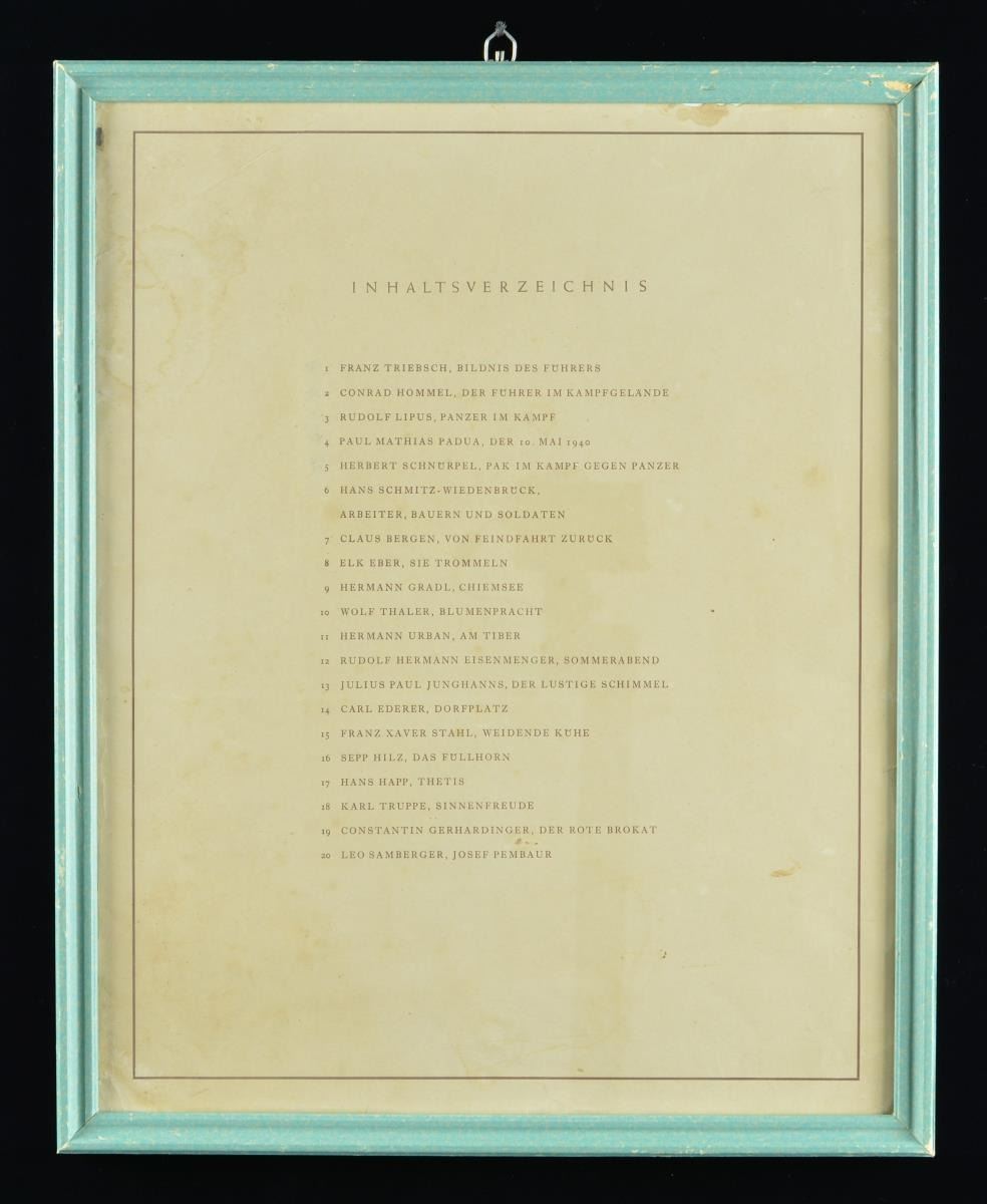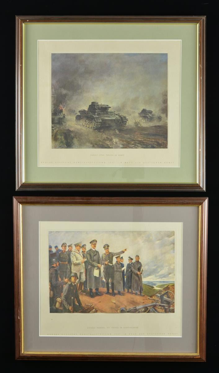 1) The framed German art prints each measure approx. 14 1/2" x 17 1/2" and are in a frame that measures 18 7/8” x 22 1/16”. They are titled “Paul Mathis Padua, der 10. Mai 1940”, “Herbert Schnurpel, Pak im Kampf Gegen Panzer”, “Rudolph Lipus, Panzer im Kampf”, “Conrad Hommel, der Fuhrer im Kampfgelande”, & “Josef Pieper, Reiter am Meer”. The final print is a list of individuals & titles of their prints. The title at the top of the list is “INHALTSVERZEICHNIS”. CONDITION: prints appear to be in beautiful condition with no damage. The framed list has water damage & losses at the edges.