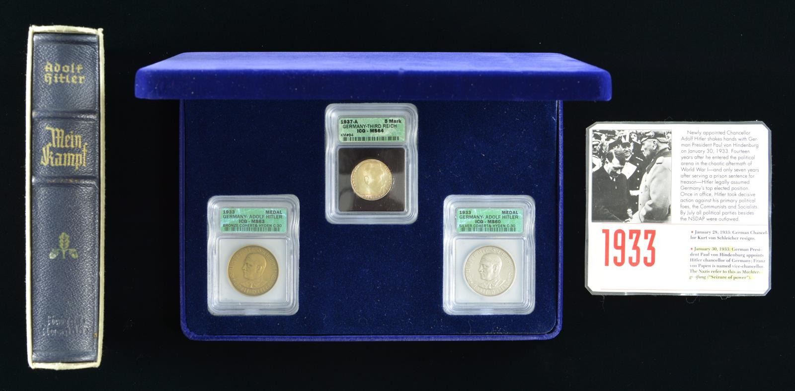 KAMPF". The coins/tokens include a silver medal dated 1933 with the face of Hitler on the front and the words “Unser die Zukunft”. The medal is graded MS60. A bronze medal dated 1933 with the face of Hitler on the front and the words “Unser die Zukunft”. The medal is graded MS63. A silver 5-mark coin dated 1937 with the bust of Hindenburg on the front graded MS64. Also included with this lot is a 1940 edition of “Mein Kampf” by Adolf Hitler. Text is completely in German. Book is housed in appears to be its original case. CONDITION: coins are graded as indicated and the book shows light overall wear. (02-17962-13/BF). $600-900.