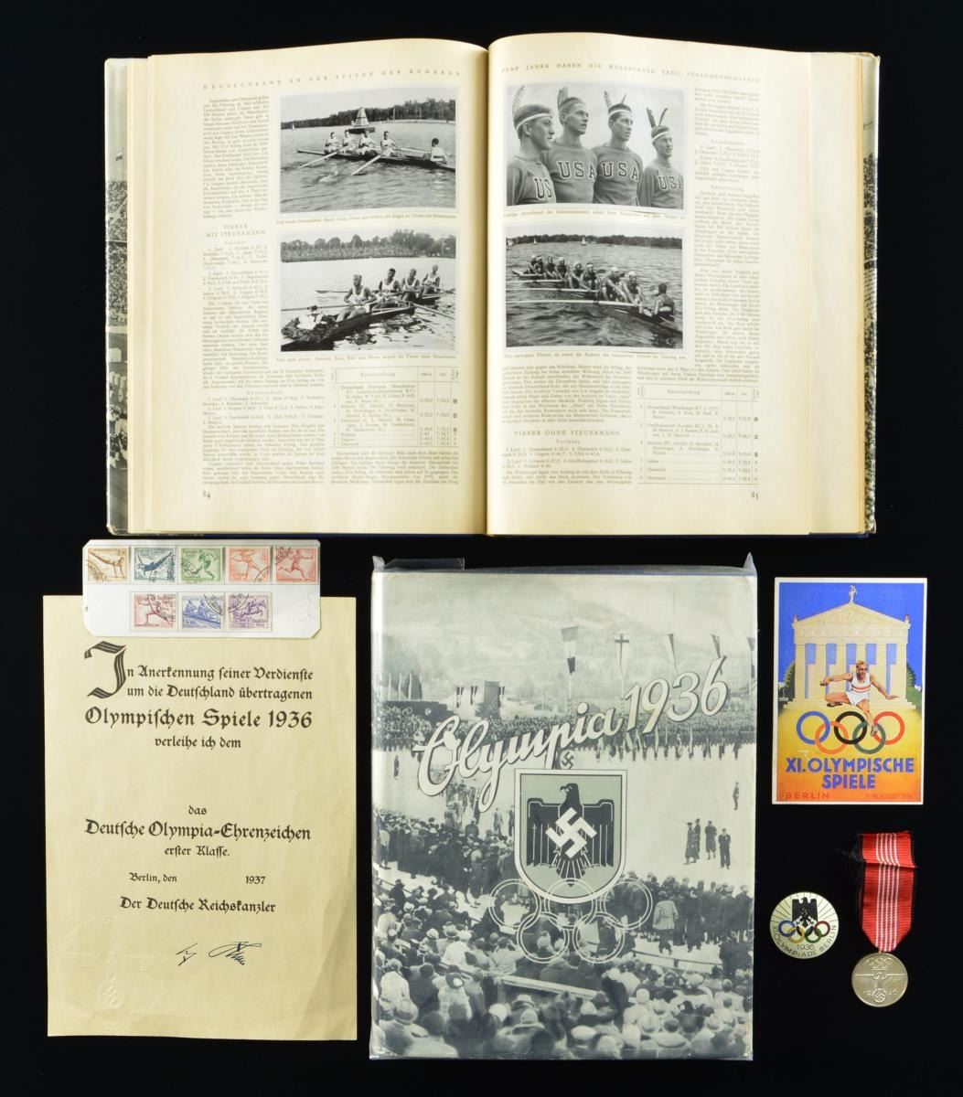 This interesting lot consists of 1 award document for the 1st Class Olympic Medal that has not been filled out but is facsimile signed by Adolf Hitler. / 1 Olympic postcard from Berlin with a 1936 postmark & Olympic stamp. / 1 Set of 8 German Olympic stamps from 1936. / 1 Large enamel badge of questionable age showing the Olympic rings with German eagle above and the words “1936 XI OLYMPIADE BERLIN”. / 1 Olympic Games 1936 German medal for service with The Olympics. / 2 Books with tipped in photos titled “Olympia 1936” with large German eagles on the front. CONDITION: all items show light wear. The books are in solid condition and the photos remain crisp & clear.(02-17962-15/BF). $500-800.