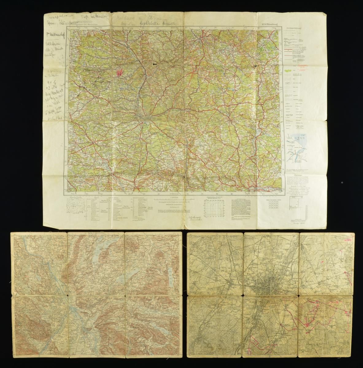 A very interesting map case which remains in “as brought back” condition and completeness. The pebble finished leather map case contains 5 pencils of varying lengths & styles. A small tin containing approximately 51 WWII era coins apparently collected around Europe by the soldier. The tin also contains 3 WWII German tinnies with pins removed. The lid of the case has a coin and 5 tinnies soldered to it. The case further contains a tape measure, whistle, leather wallet, wehrpass, several maps, several photographs, a District Savings Bank book, a transportation pass, a tin pencil box with colored pencils, and 2 bank notes. CONDITION: leather shows wear but remains supple. Included items show varying degrees of wear. Most coins show average circulation. Zinc coins show oxidation. (02-17952/BF). $400-700.