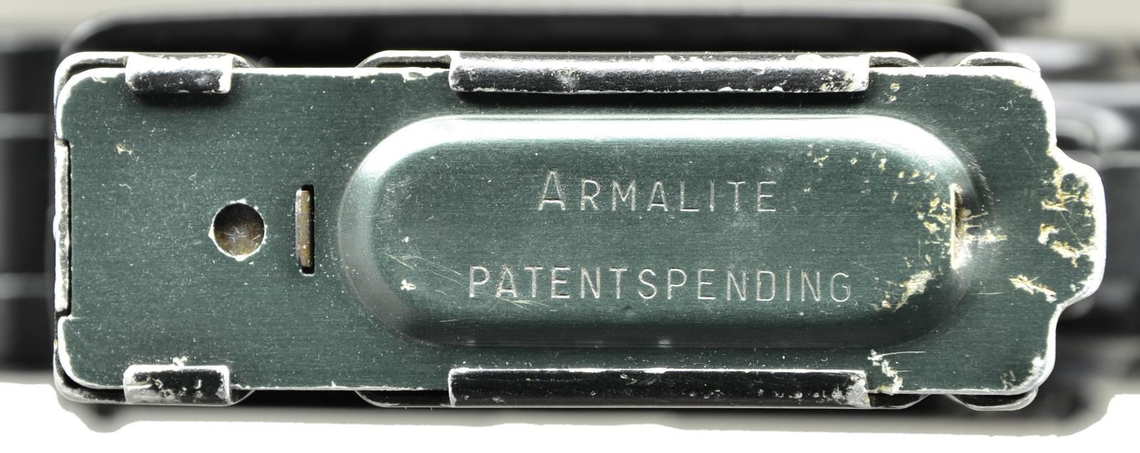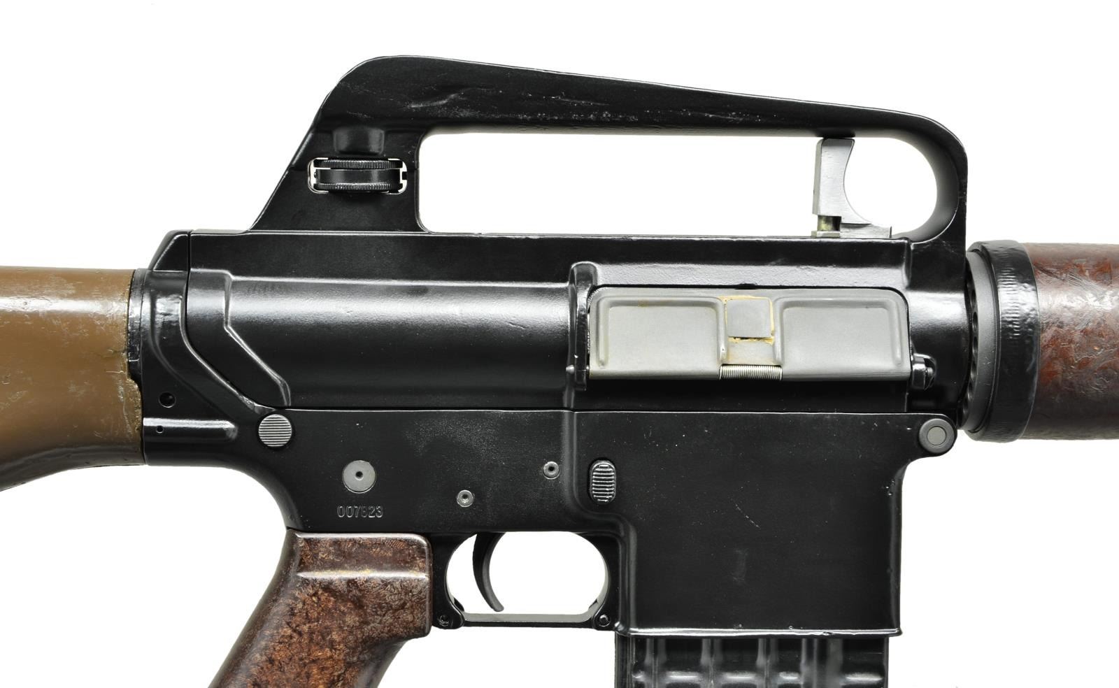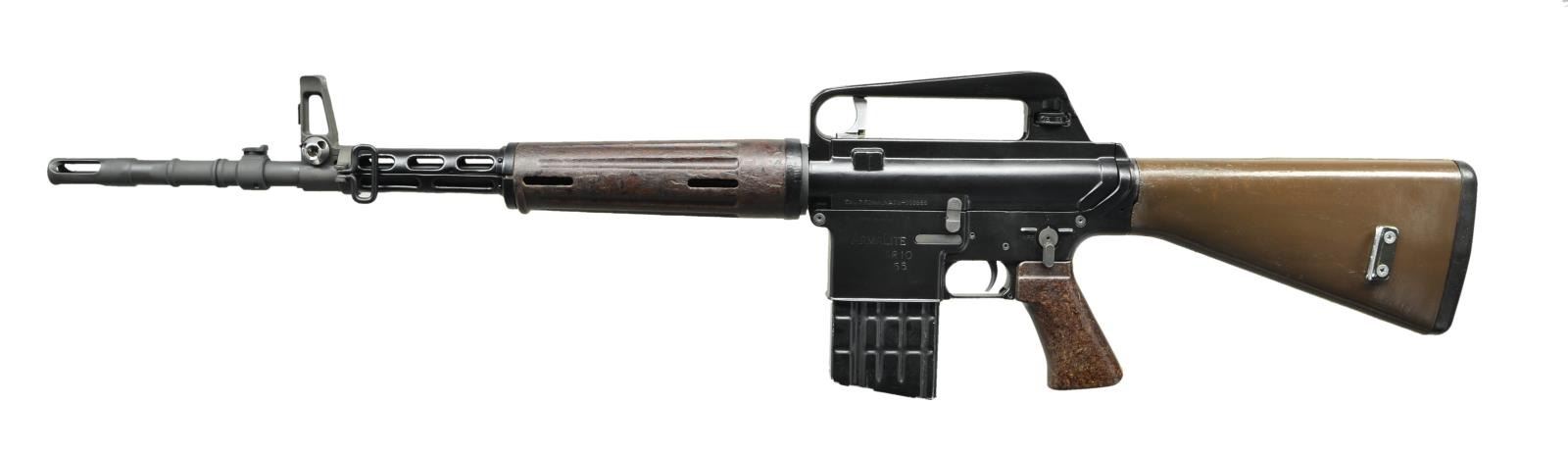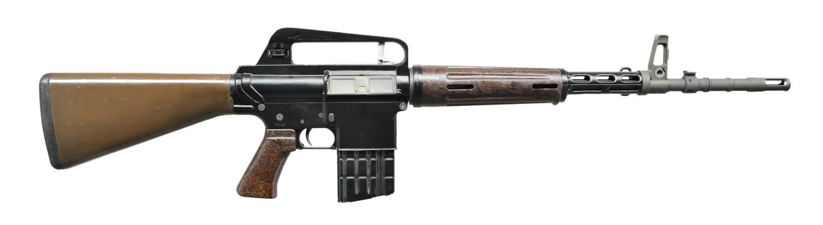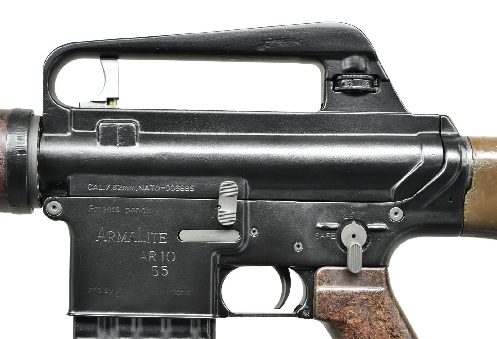 Cal.7.62 NATO. S# 55. Bbl. 21.5" Mfg. 1970's. The most popular modern sporting rifle in the United States is absolutely the AR-15. The Granddaddy of this rifle is the AR-10, chambered in 7.62 NATO & designed in the mid 1950's. It was adopted by several military units, outside the United States including Sudan, Portugal & even Cuba. ArmaLite licensed manufacturing rights to a Dutch manufacturer called Artillerie-Inrichtingen (A.I.) in 1957 where they were primarily manufactured in the early 1960s. Despite substantial sales to the governments of Sudan & Portugal, logistical problems would soon cause manufacture to cease & the focus would come back to the United States in the development of the successor, the AR-15. This particular example is a Portuguese model, originally manufactured as a Machine gun, like the majority of them were. It was imported back into the USA where it was destroyed by being disassembled & cut up. It was rebuilt as a semiautomatic rifle, rewelded & refinished by Boyd Hahn of Hahn Machine Company in St. Charles, Missouri. Dark black finish on all exposed metal surfaces aside from parkerized barrel. Barrel is terminated w/ 3 slot flash hider forward of top mounted bayonet lug. Tall, protected blade front sight coincides w/ adjustable peep sight mounted inside carry handle. Charging handle resides between carry handle & receiver, directly above the dust cover. Brown synthetic furniture. Round front handguard & pistol grip more resemble Bakelite while the shoulder stock presents a smoother surface. Hard rubber recoil pad. No forward assist or brass deflector behind spring assisted dust cover. Slab side lower receiver marked on mag well, right side; "Patents pending / ArmaLite / AR 10 / 55 / mfd by Nederland" w/ triangular AI logo. Safety selector marked; "Fire - Safe" in proper positions. Right side receiver markings include "007823" above pistol grip, below selector. Upper receiver marked on left side, above mag well; "Cal. 7.62mm, NATO - 006885". Sling swivels, front & rear on left side. MAGS: 1 Waffle pattern 20 rd. marked "ArmaLite Patents Pending" on floorplate. CONDITION: Finish coverage is complete & consistent as refinished in the 1970s. Typical of the Hahn rebuilt AR-10 examples, there are very few signs of the re-weld process, though not completely invisible. Furniture presents typical impressions w/ no outward sign of damage of any kind. Original factory markings on lower receiver are quite light from refinishing, having lost detail. Bore examination reveals extensive fine pitting & worn lands the entire barrel length. Fire control mechanism appears to function correctly when cycled by hand though charging handle binds at times at full closure. (23-847/JZ). MODERN. $8,000-12,000.