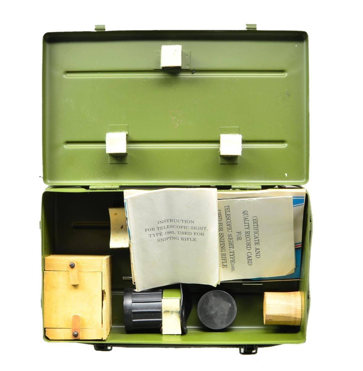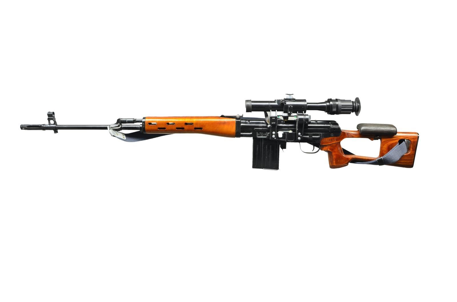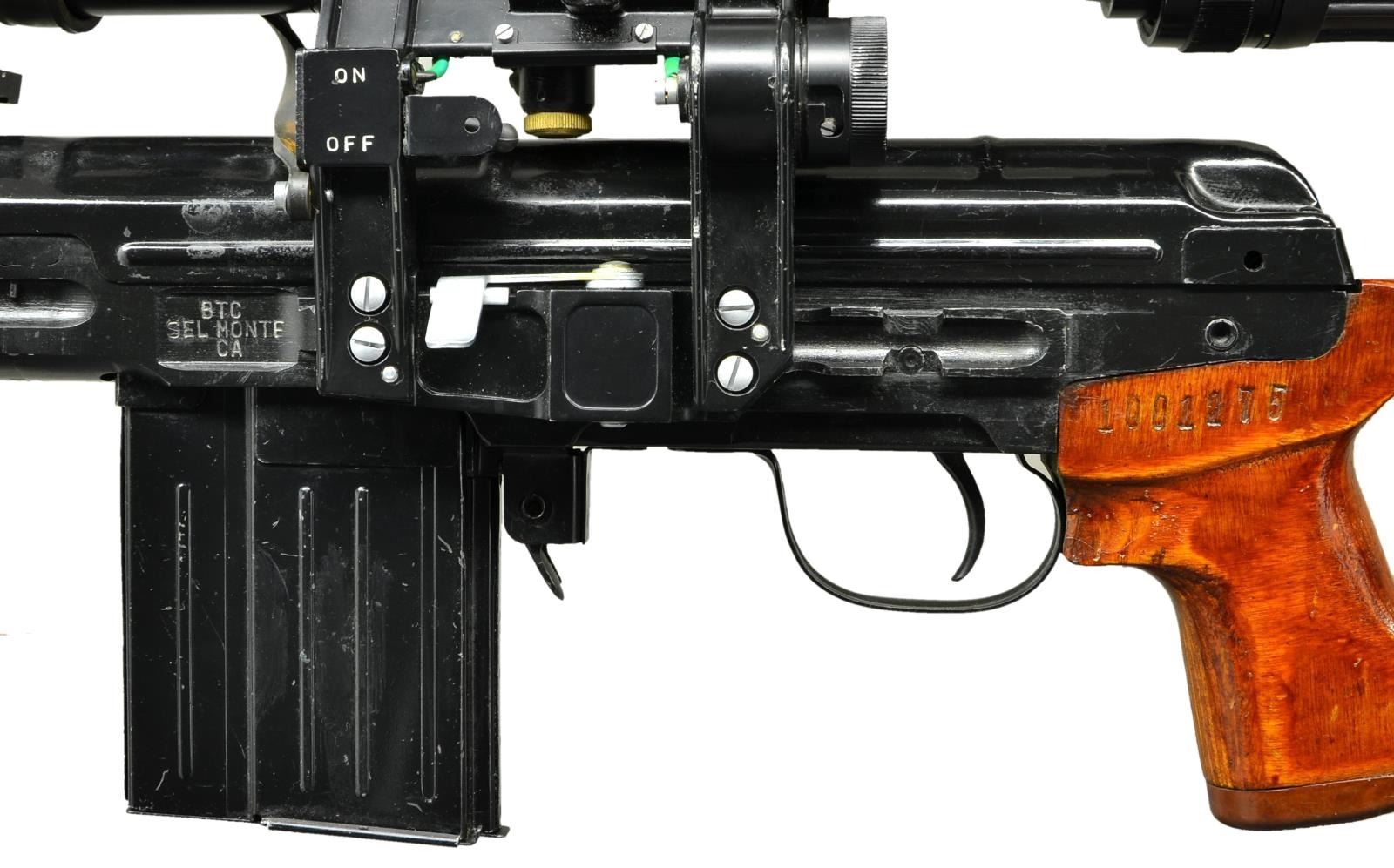 Cal. 7.62x51 S#102577 Bbl.28" An extremely rare imported Chinese Norinco commercial version of the Russian SVD Dragunov sniper rifle chambered in the popular 7.62x51 NATO cartridge. Dark black finish on exposed metal surfaces. Long barrel is terminated with a 3" flash hider. Front sight is a hooded post w/ integral bayonet lug. Tangent rear sight adjustable in elevation from 100-1,200 meters. 10.5" smooth, slot-ventilated handguards that match the color of the correct Dragunov style shoulder stock w/ factory clip-on cheek riser. Blue canvas sling on left side. Receiver markings include: on right, "NORINCO / NDM86 7.62X51MM / MADE IN CHINA" & on left, "BTC / SEL MONTE / CA". Stock numbered "1001275" on left, matching scope mount as well. Left side receiver scope rail w/ 4x24 IR scope & QD mount. MAGS: 1 steel 10rd. UNATTACHED ACCESSORIES: Paperwork for rifle & optic, green steel optic box w/ factory spare scope parts. CONDITION: Finish on exposed metal surfaces is complete and consistent w/ only some very light thinning in areas of mechanical intervention. The only area illustrating use is where ejected casings occasionally strike the top cover. Wood furniture is in beautiful condition with no obvious blemishing. Scope glass is clear with a tight reticle. Bright bore w/ sharp rifling. Fire control mechanism appears to function correctly when cycled by hand. (23-581/JZ). MODERN. $5,500-7,500
