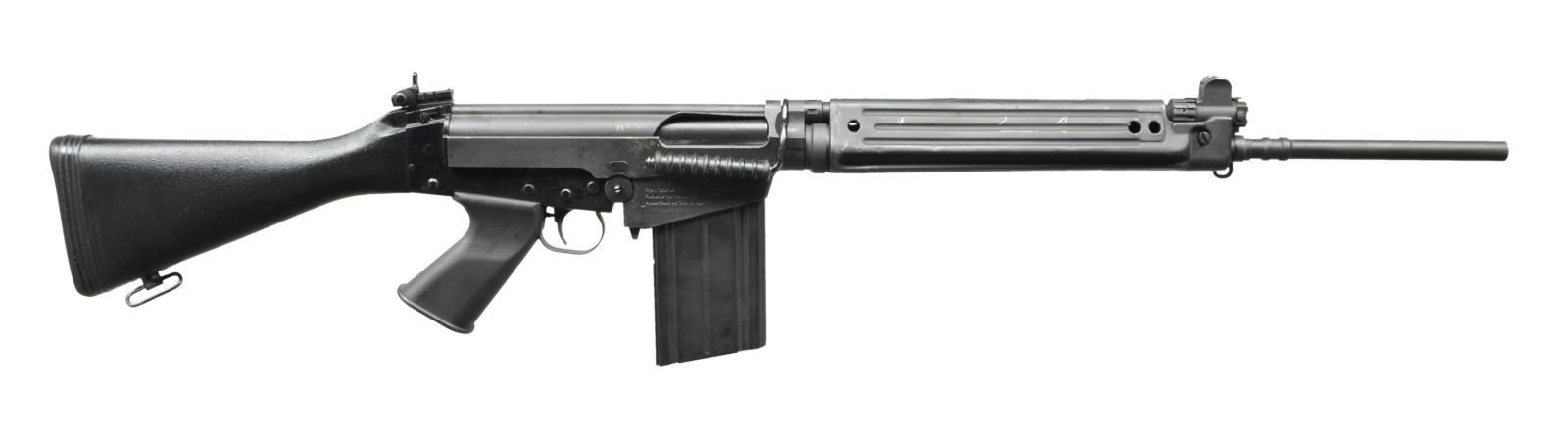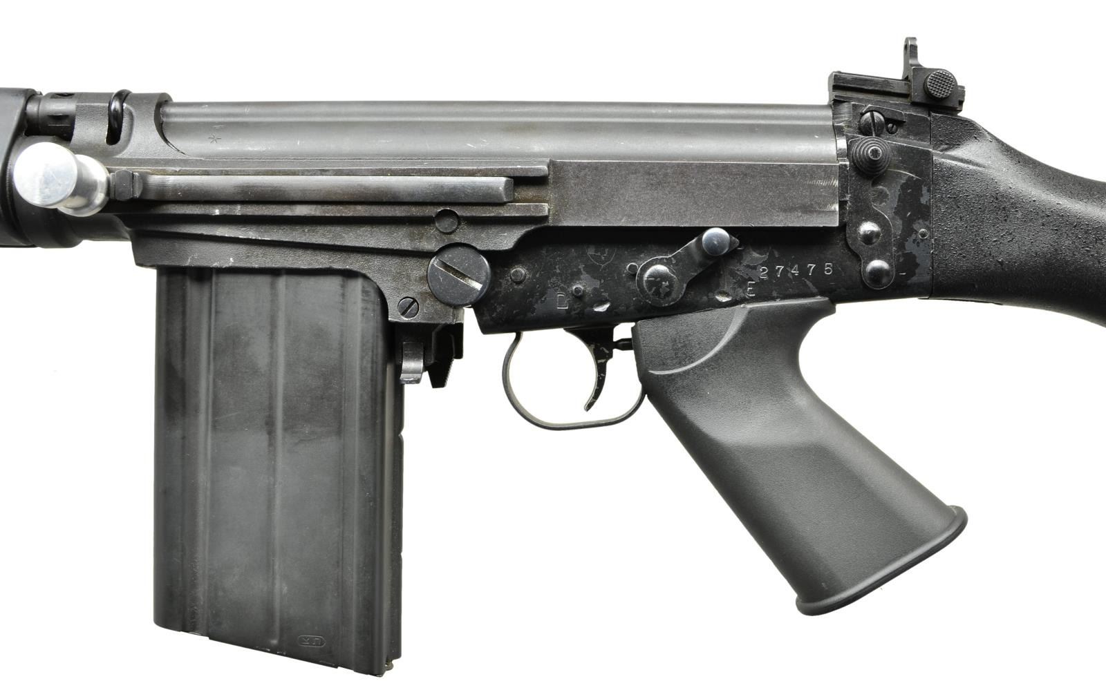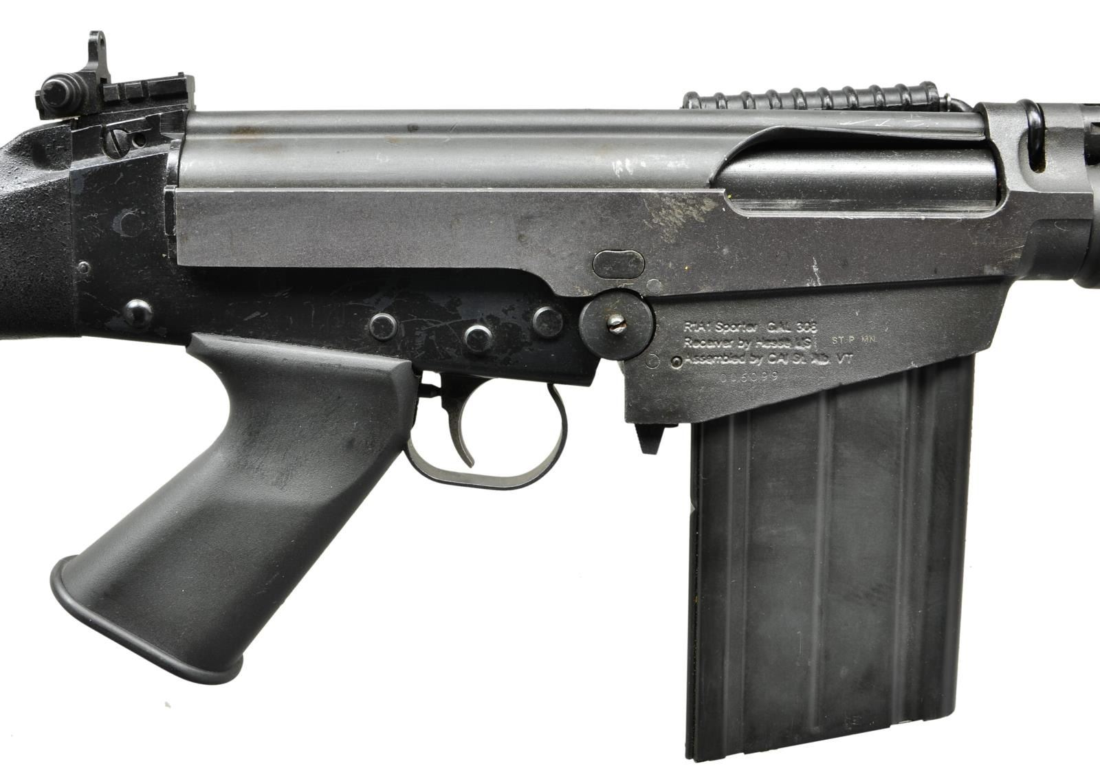 Cal. 7.62x51. S# 006099. Bbl. 20". Metric pattern Hesse receiver assembled by Century Arms International. Steel 11" handguards Protected post front sight & sliding rear peep marked from 200-600. Left side, non reciprocating charging handle. Right side folding carry handle mounted above chamber. 10" plastic shoulder stock. Sling swivels, front & rear. MAGS: 6 steel 20 rd. UNATTACHED ACCESSORIES: Gibson USA soft guitar case, FN owners manual, 2 leather double magazine pouches. CONDITION: black painted finish enjoys partial coverage. Handling marks on furniture typical of vertical rack storage. Descent bore w/ strong rifling. Fire control mechanism appears to function correctly when cycled by hand. (22-5757/JZ). MODERN. $700-1,100.