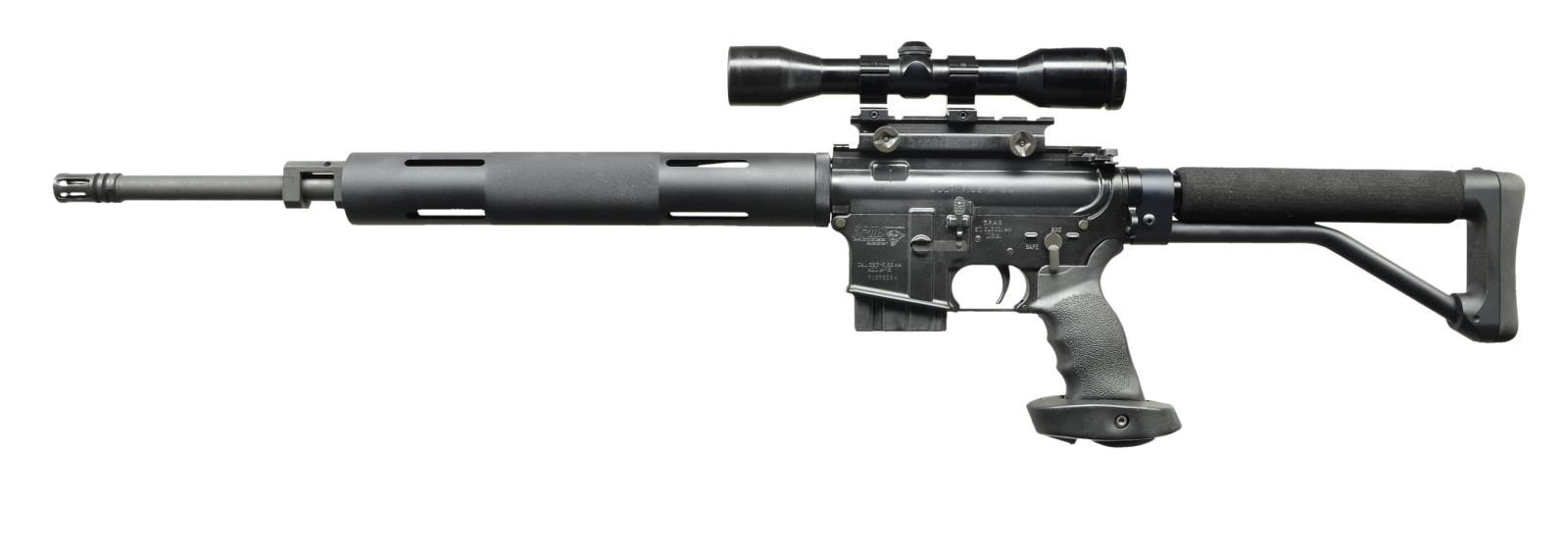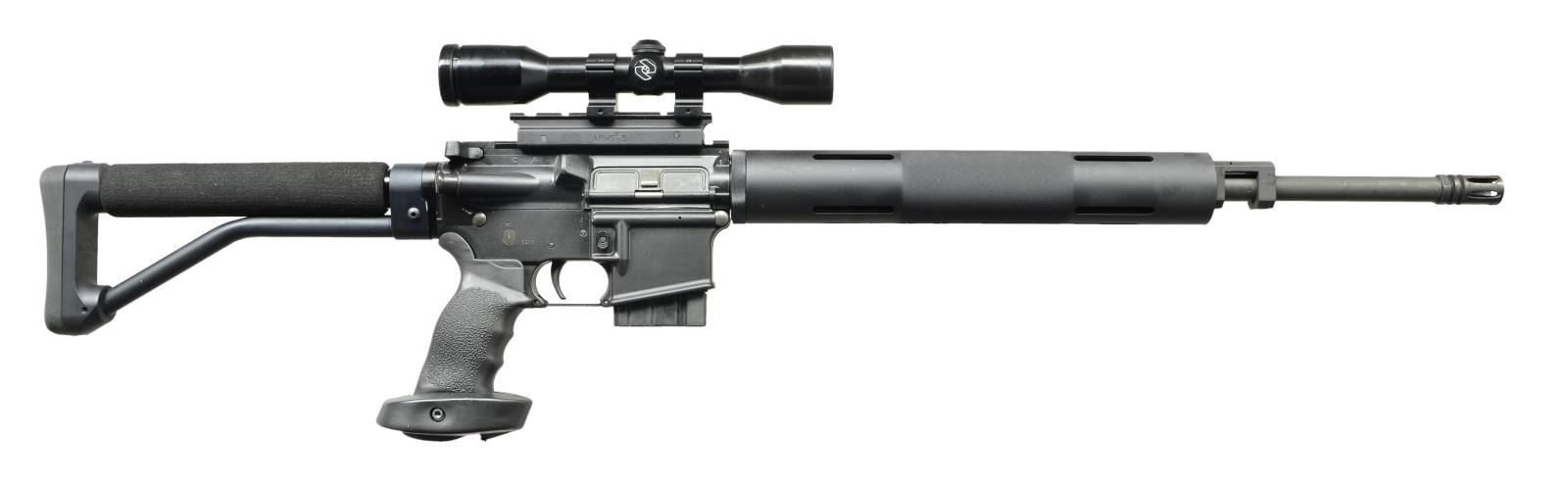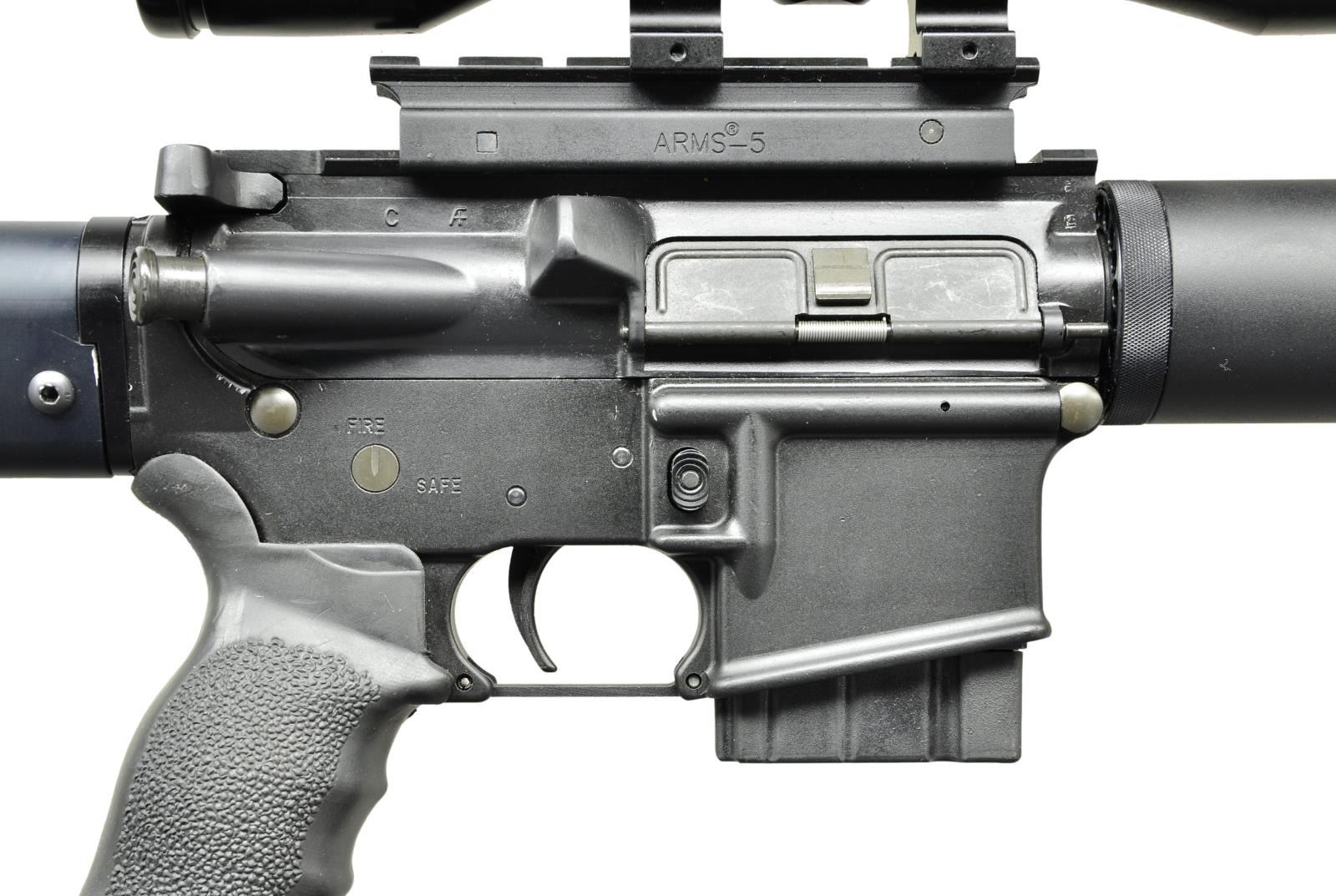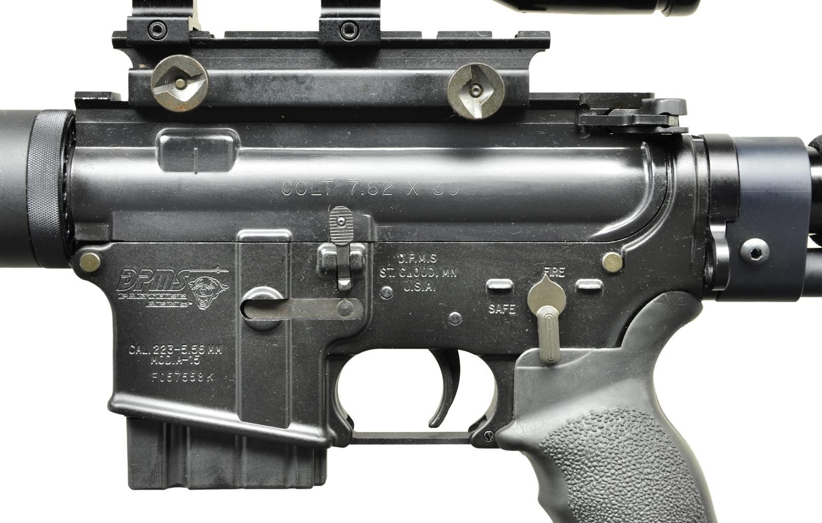 Cal. 7.62x39mm. S# F057558K. Bbl. 20". DPMS A-15 lower receiver w/ Colt 7.62x39mm barreled upper receiver. Threaded barrel terminated w/ A1 flash hider. Low profile gas block w/ no bayonet lug. 13" Tubular, free floating handguard. Flat top upper receiver has round forward assist, brass deflector & dust cover. Currently wearing ARMS-5 riser w/ Zeiss DIATAL-C 4x32 scope. Fixed tubular stock w/ rubber cheek wrap & recoil pad. Adjustable target style pistol grip. Left side single point sling attachment. Barrel marked; "CMP 7.62x39 1/12 HBAR". Upper receiver, on left side marked; "COLT 7.62x39". MAGS: 5 (3 aluminum & 2 plastic) 10rd. UNATTACHED ACCESSORIES: foam lined plastic Gun Guard rifle case. CONDITION: finish is complete & consistent. Some drag lines typically indicative of vertical rack storage. Scope glass clear w/ sharp reticle. Bright bore w/ strong rifling. Fire control mechanism appears to function correctly when cycled by hand. (22-5700/JZ). MODERN. $1,000-1,500.