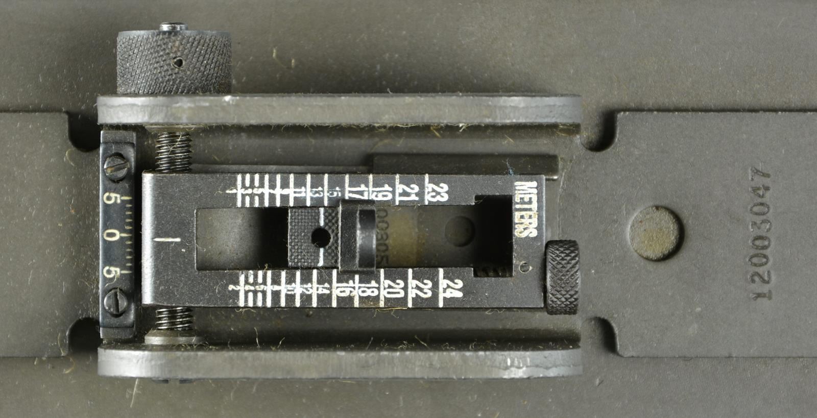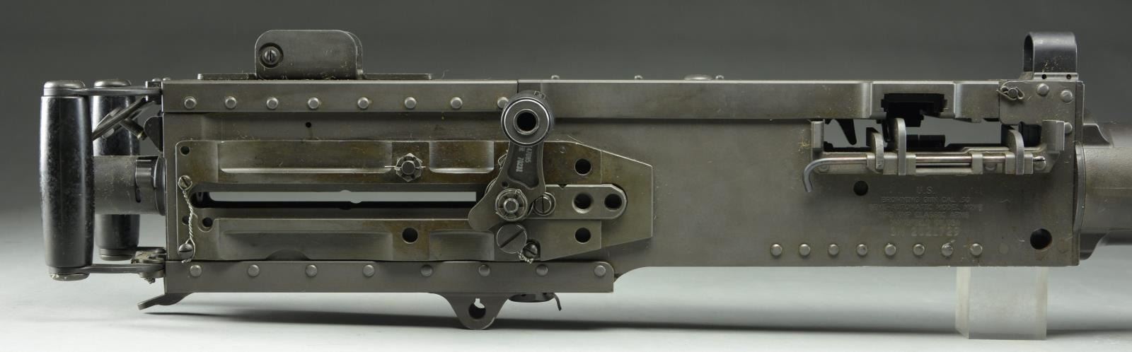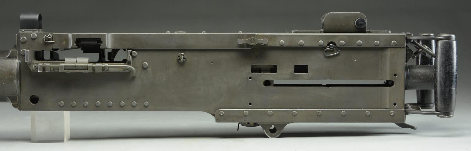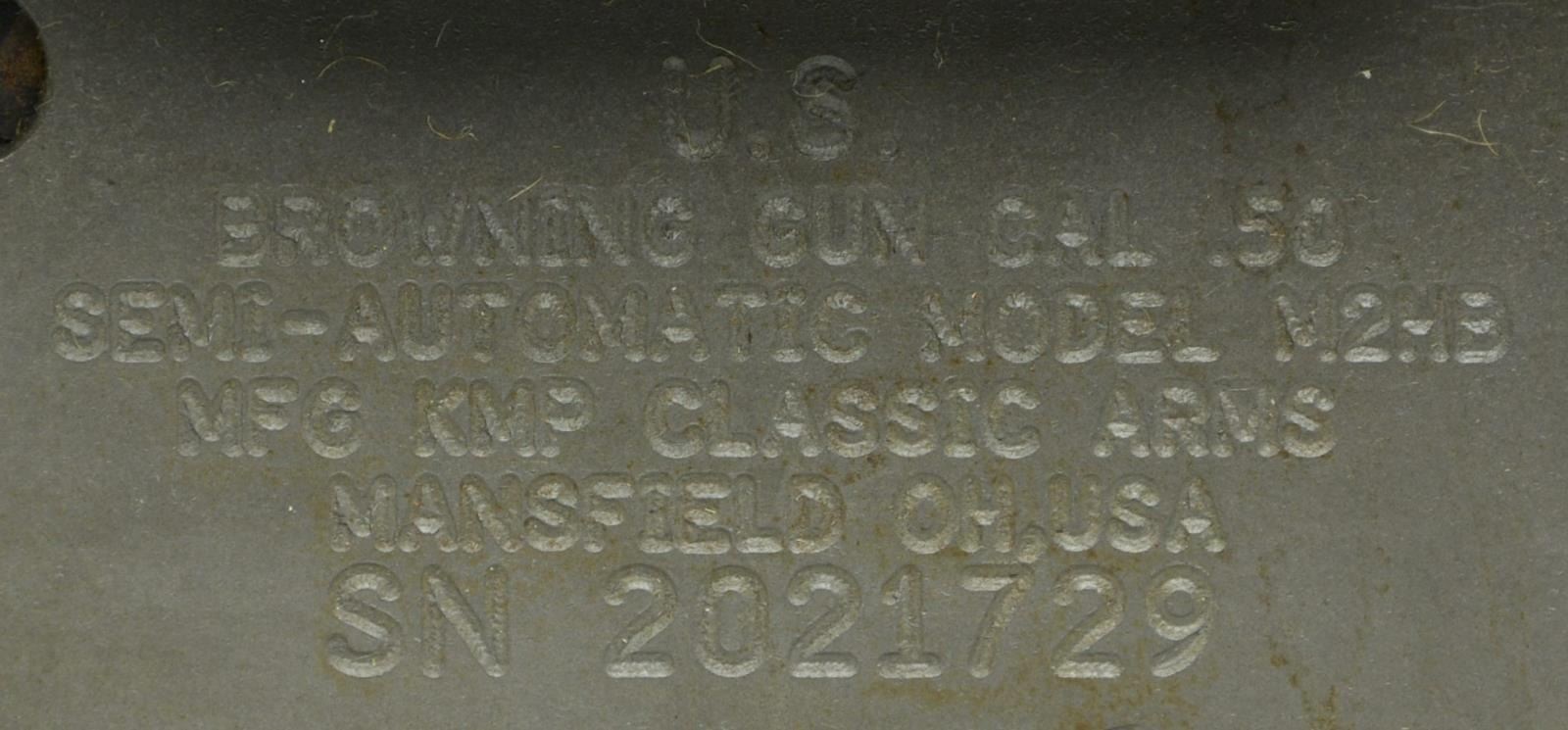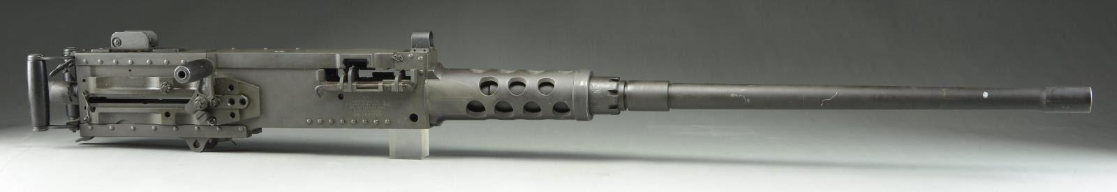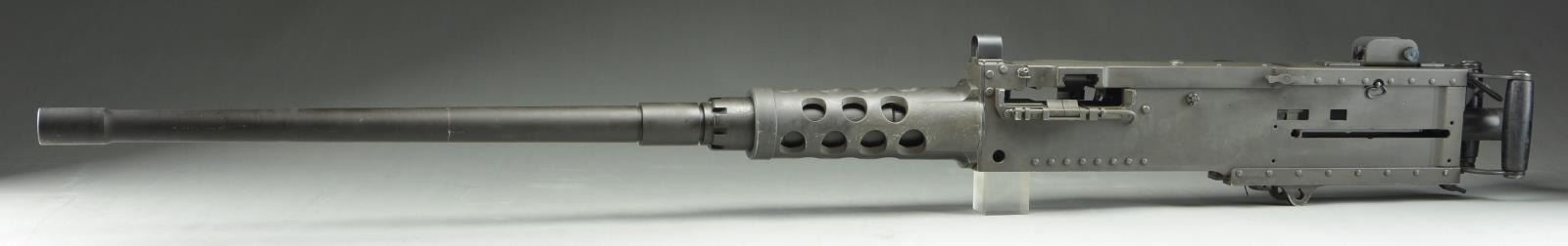 Cal. 50 BMG. S# 2021729. Bbl. 45". The Browning M2HB, affectionately referred to in military circles as "Ma Duece" is another evolution of the successful John Browning designed, recoil operated & belt fed guns that populated the battlefields during WWI. In an effort to build a gun that was comparable to the French 11mm Hotchkiss, w/ a primary purpose of defeating observation balloons & aircraft, the .50 BMG was designed and introduced for the M1921A1, which was quickly modified & reintroduced as the M2. Barrel heating issues would lead to the heavy barrel version that we now know as the M2HB. This example was manufactured by KMP Classics and redesigned as a closed bolt, semiautomatic version. Outwardly it looks the same as the fully automatic original, actually sharing several common parts, while internally, it isn't capable of accepting the original military internals. Dark parkerized finish. Hooded front w/ coinciding rear ladder sight adjustable to 2400 meters. CONDITION: Finish on exposed metal surfaced complete & consistent. No signs of heavy use. Bore is bright w/ very strong rifling. Fire control mechanism appears to function correctly when cycled by hand. (23-911/JZ). MODERN. $6,000-9,000.