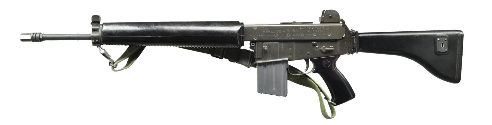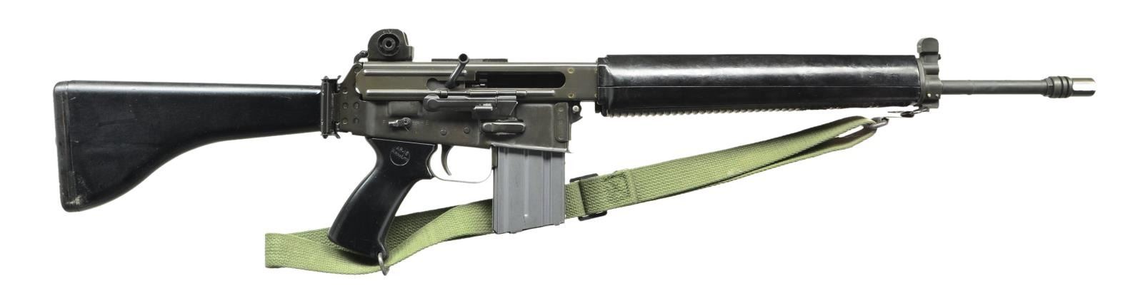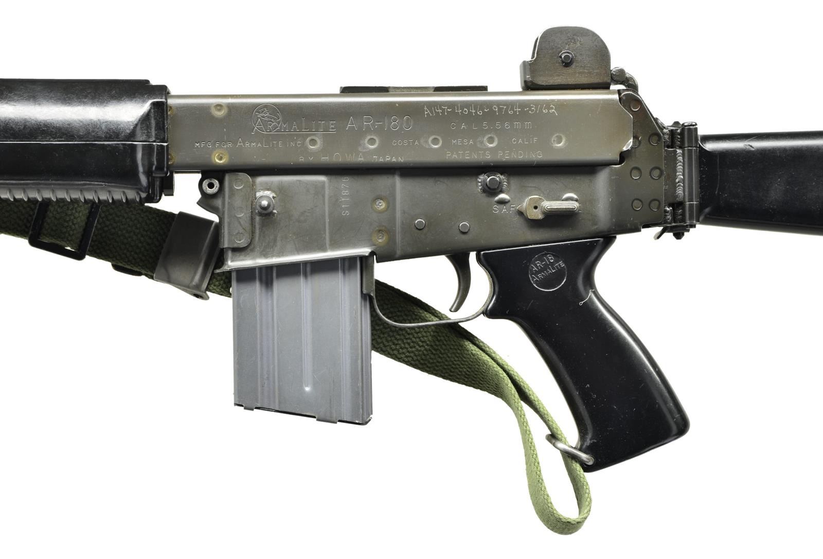 Cal. 5.56mm. S# S11876. Bbl. length 18". Manufactured Feb. 1974. The original ArmaLite AR-18 was designed in 1963 in CA. as a potential alternative for the U.S. military. When it started to look as though it would not be adopted as a standard service rifle, production was licensed to Howa Machinery Co. in Japan where they began production in 1967. Because military sales to U.S. were effected by American-Japanese treaty agreements that forbid Japan in selling to arms to "belligerent nations", it was determined rifles could not be sold to the U.S. due to our involvement in Vietnam. In 1974 ArmaLite & Sterling Ltd. in England signed a production agreement to manufacture both the AR-18 (Select-Fire version) & the AR-180 (the semi automatic commercial version) & started manufacturing rifles in 1975. This particular example was mfg. for ArmaLite Inc. in Costa Mesa, CA. by Howa Japan under ArmaLite patents. Serial number located on lower receiver. It is a gas operated piston driven semi auto rifle w/ a left side folding stock. Front sight is an elevation adjustable protected post. Rear sight is a windage adjustable dual aperture peep sight marked 200 & 400. The rifle is charged by a reciprocating handle on the right side of the rifle. Ambidextrous safety selector controls, black plastic furniture. Proper muzzle brake & the bayonet lug w/ attached green canvas sling. MAGS: 1 aluminum 20 rd. w/ ArmaLite AR-18 floorplate. CONDITION: bluing is complete on all exposed metal surfaces w/ some gentle thinning in areas of moving parts. Left side of receiver has been scratch engraved w/ unknown 16 digit number below rear sight. Stock locks tightly in open & closed positions. Magazine body appears to be a Colt era AR-15 magazine but the follower, spring & floorplate appear to be original Armalite. Bore is bright w/ strong rifling. Fire control mechanism appears to function correctly when cycled by hand. (23-524/JZ). MODERN. $1,200-1,800.