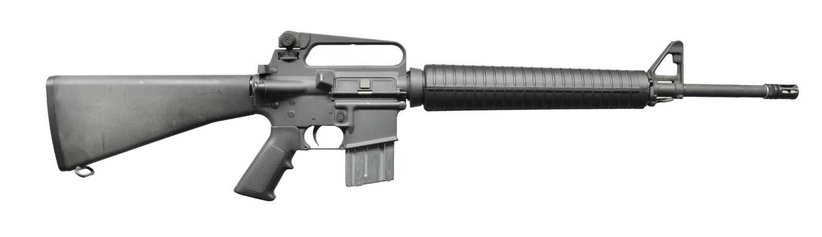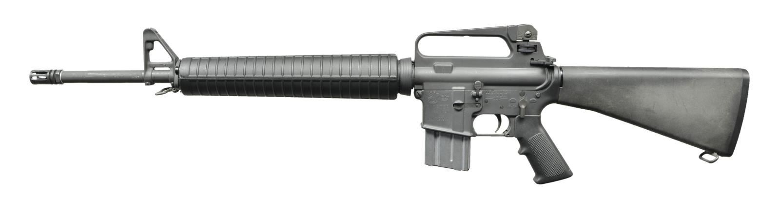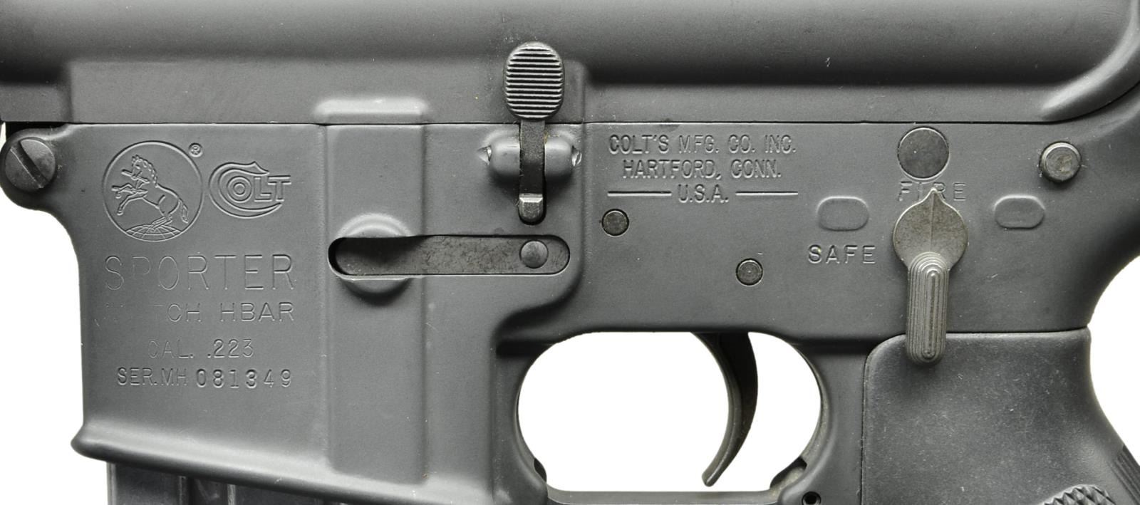 Cal. 223. S# MH081349. Bbl. 20". Mfg. 1977. Colt AR-15 Sporter in correct early configuration. Barrel marked; "C MP 5.56 NATO 1/7 HBAR", terminated w/ A2 flash hider. Protected post front sight / gas block / no bayonet lug w/ front sling swivel. Round, rifle length A2 handguards secured w/ tapered delta ring. E2 dual aperture windage & elevation adjustable rear sight on carry handle. Upper receiver w/ round forward assist & brass defector. Lower has fence around mag release on right side. Left side marked "COLT'S MFG. CO. INC./ HARTFORD CONN. / U.S.A." above trigger. Slotted bolt carrier marked "C" on left side, to coincide w/ factory pinned receiver block above selector. Standard rifle buffer. 10.5" trap door buttstock. MAGS: 1 aluminum 20 rd. marked "COLT AR-15" on floorplate. CONDITION: finish coverage is complete & consistent w/ only light scuffing marks typically encountered in vertical storage. Furniture is free of any noticeable blemishing. Bright bore w/ strong rifling. Fire control mechanism appears to function correctly when cycled by hand. (23-492/JZ). MODERN. $2,000-$3,000.