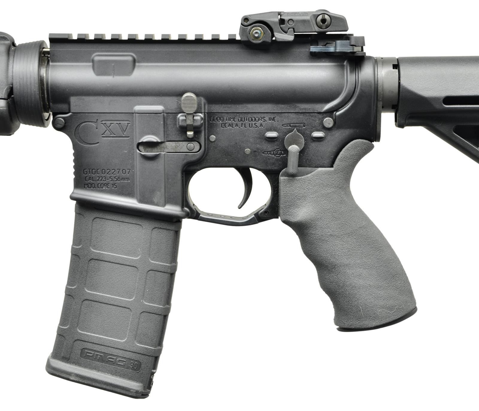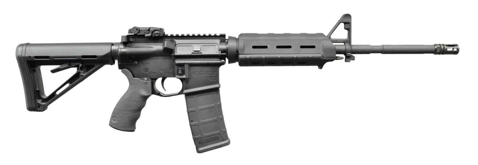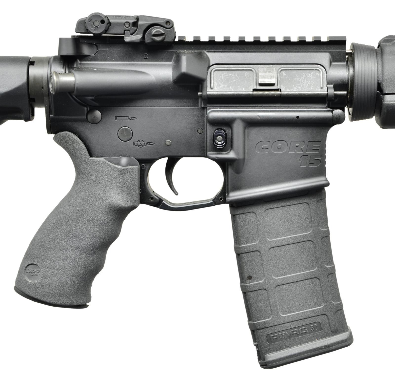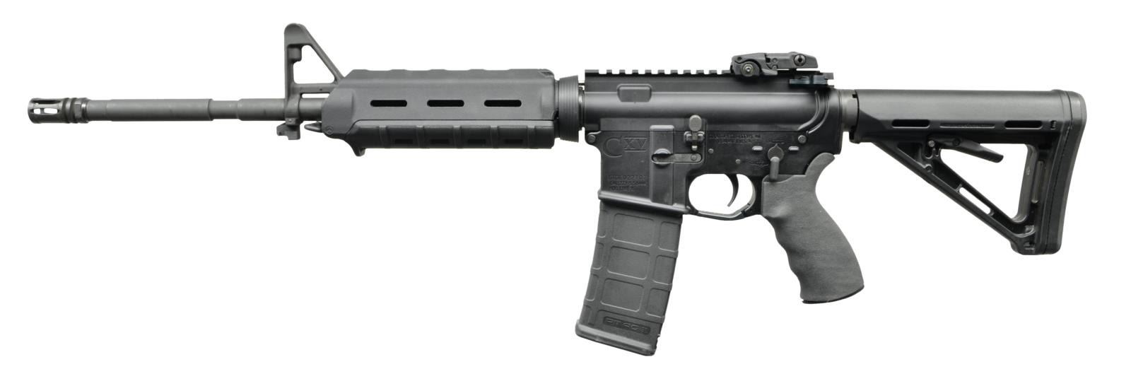 Cal. 223. S# GTOC022707. Bbl.16" M4 profile barrel marked "C15 5.56 1/7 Chrome". Threaded muzzle terminated w/ A2 flash hider. Traditional protected post front sight / gas block / bayonet lug w/ sling swivel. 7" MAGPUL MOE black plastic handguard. Tapered delta ring. Flat top upper receiver w/ MAGPUL MBUS folding rear sight. Round forward assist, brass deflector & dust cover. Left side controls. Black rubber ErgoGrips pistol grip. 6 Position collapsible MAGPUL MOE stock. MAGS: 1 Gen M2 MagPul 30rd. UNATTACHED ACCESSORIES: foam lined black plastic rifle case, lock & paperwork. CONDITION: all aspects indicate very little use if any. Finish is complete & consistent w/ no obvious wear or blemishing. No strike marks on brass deflector which happens immediately. Bright bore w/ strong rifling.Fire control mechanism appears to function correctly when cycled by hand. (22-5756/JZ). MODERN. $600-900.