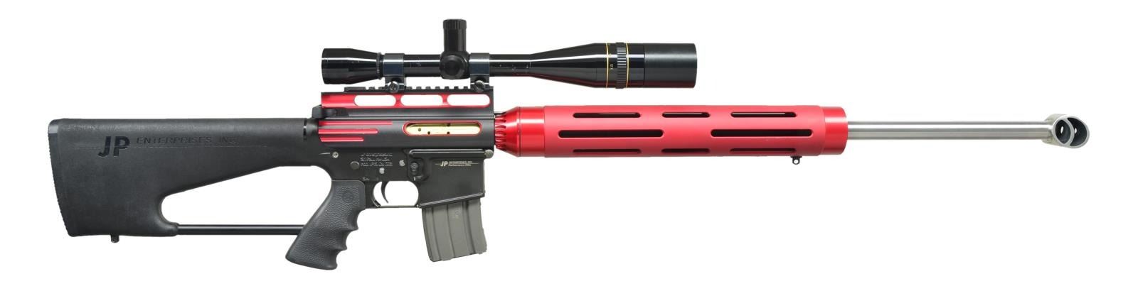 Cal. 223 Rem. S# 1119. Bbl. 26" Cryogenic Super Match. Barrel terminated w/ JP signature permanent muzzle brake. Heavy target rifle weighing in at 11# 6oz. 14" red anodized tubular handguard. High rise flat top upper receiver, anodized to match lower receiver w/ red anodized lightening cuts to match handguard. No brass deflector, forward assist or dust cover. Left side controls. Gold anodized, lightweight bolt carrier. 10.5" JP Enterprises shoulder stock w/ integral pistol grip. Currently sporting Leupold 12x 40mm scope w/ duplex reticle & target turrets. Sling swivels front & rear. MAGS: 1 Bravo Company 20 rd. aluminum. CONDITION: exterior finish enjoys complete & consistent coverage illustrating gentle thinning at some high spots. Scope glass appears clear w/ sharp reticle. Exterior of scope tube demonstrates some light marring from previous mounting. Bore is bright w/ sharp rifling. Fire control mechanism appears to function correctly when cycled by hand. (22-5702/JZ). MODERN. $1,500-2,500.