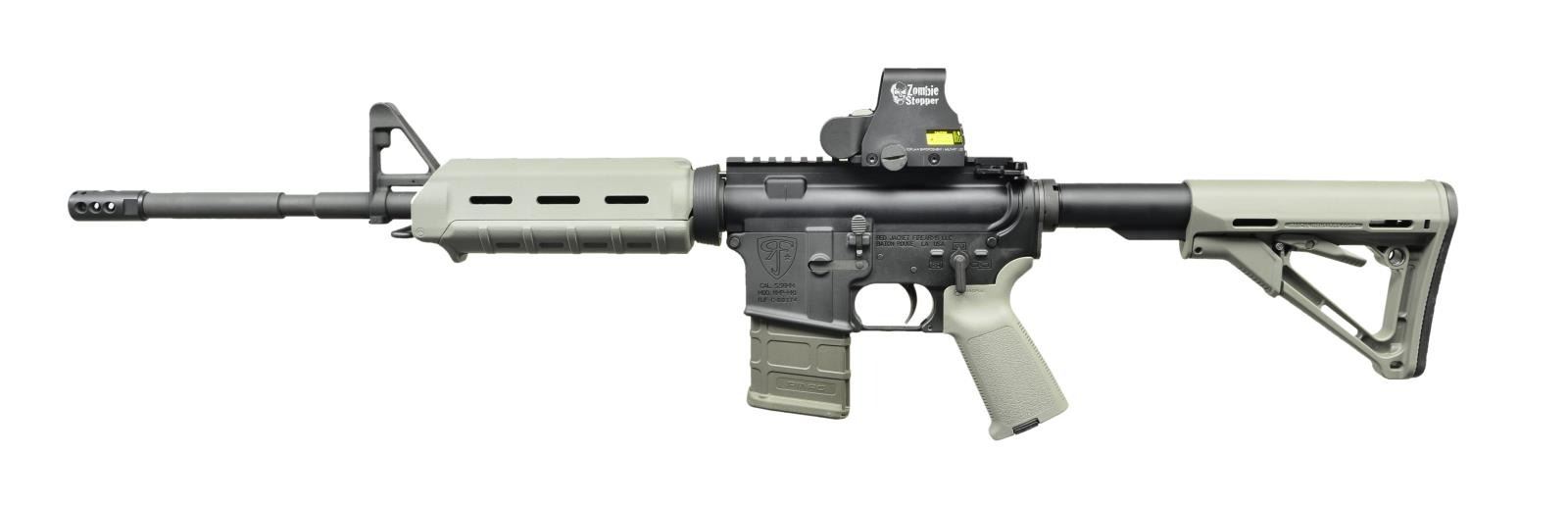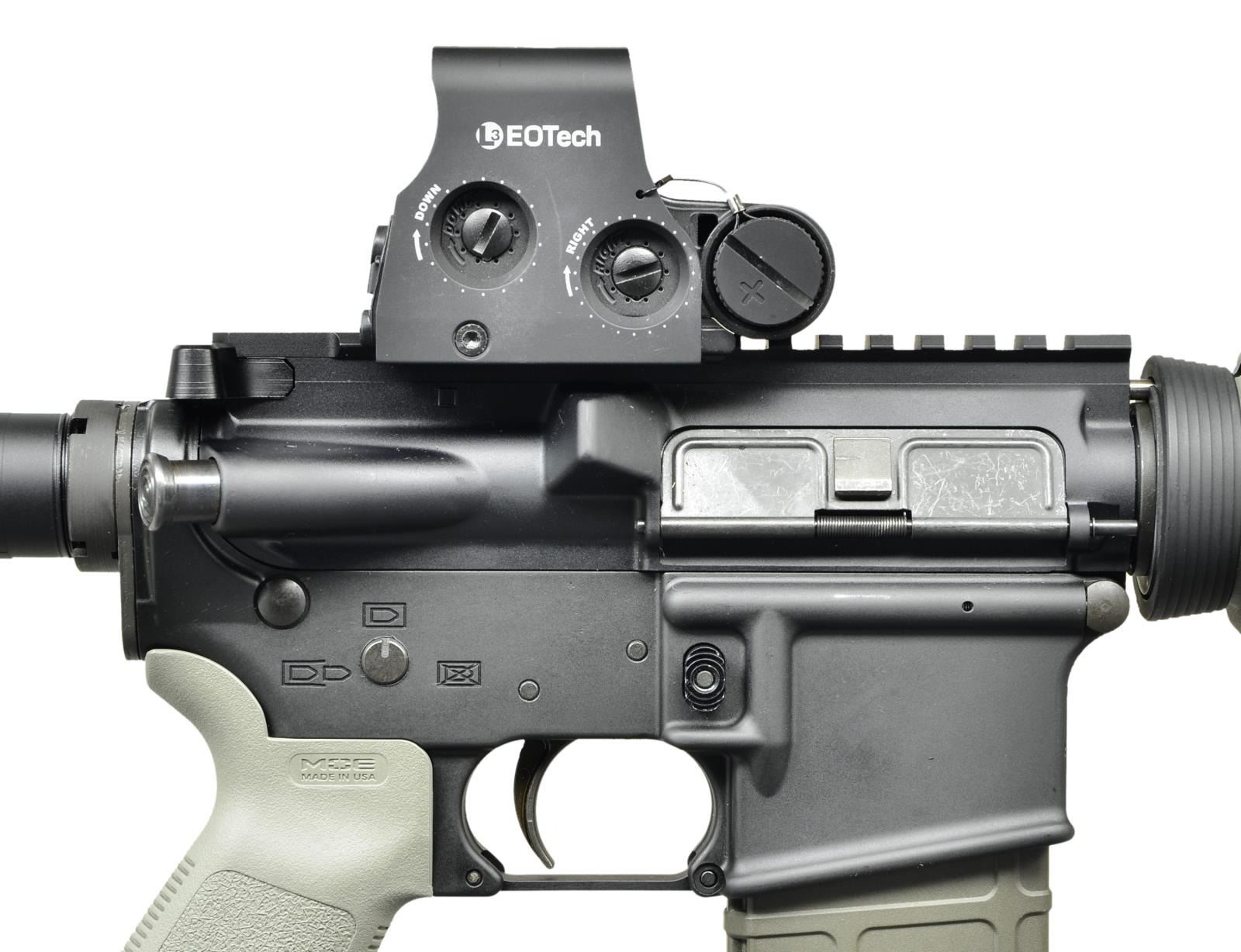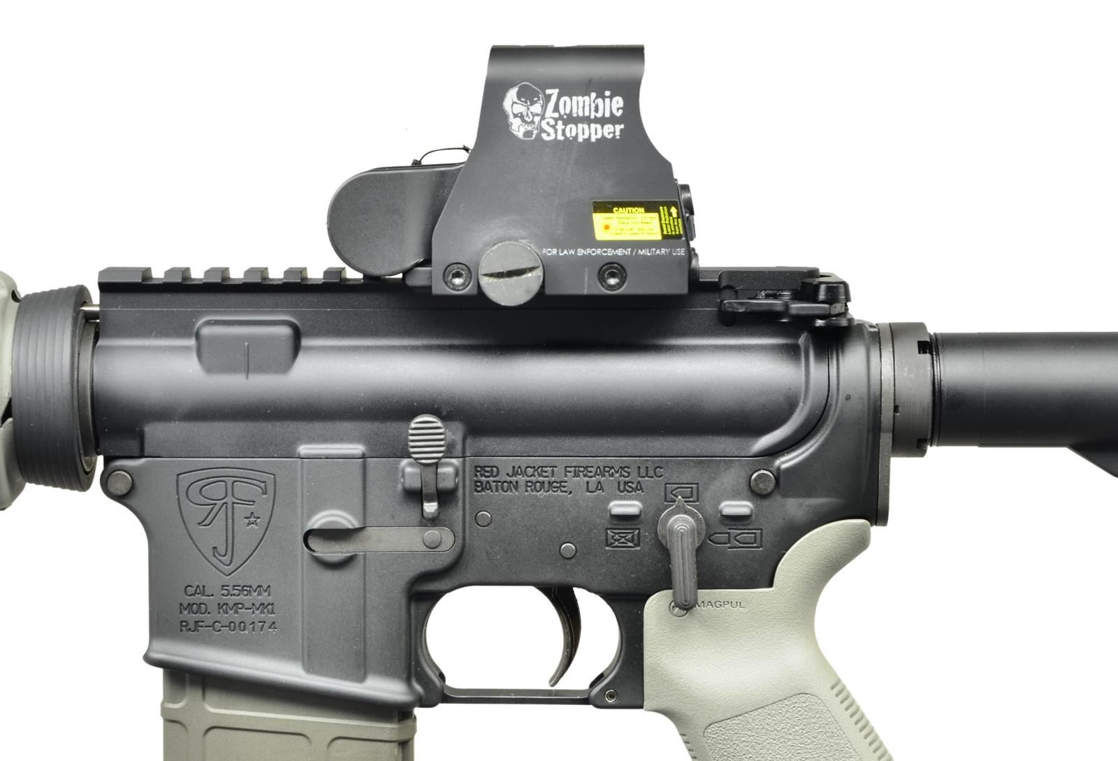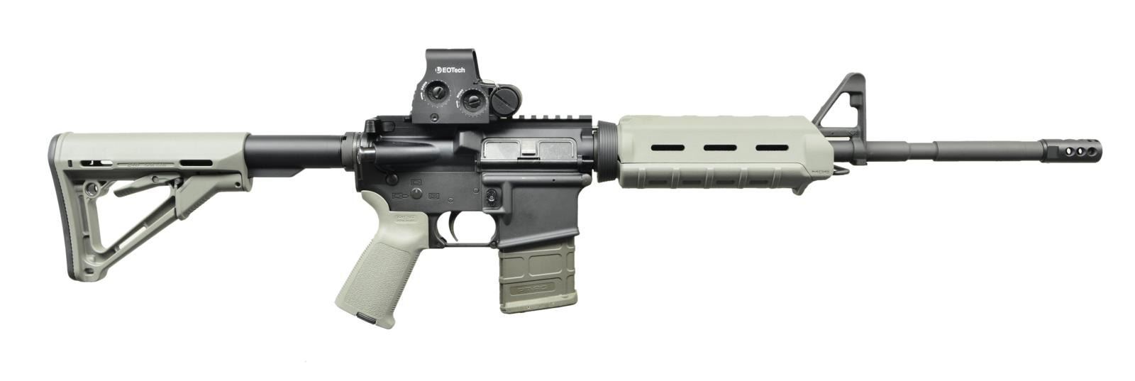 Cal. 5.56mm. S# RJF-C-00174. Bbl. 17.5" over pinned muzzle device. Classic M-4'gery variant of the popular AR-15 carbine. M4 profile barrel marked; "5.56 NATO 1x7 CHROMED". Dark black anodized finish on all exposed metal parts w/ parkerized finish on barrel. Protected post front sight / gas block / sling swivel. Light green MagPul MOE handguard secured w/ tapered delta ring. Matching colored MOE pistol grip w/ storage compartment & CTR fixed (collapsible style) MagPul stock. Flat top upper receiver w/ round forward assist & brass deflector. Lower receiver has left side controls w/ pictogram selector markings on both sides. Currently sporting EOTech Zombie Stopper electronic sight. MAGS: 4 Magpul 20 rd. (1 OD green & 3 Tan). UNATTACHED ACCESSORIES: Black nylon Blackhawk Sportster travel case. CONDITION: All aspects indicate very little use, if any. No ejection marks on brass deflector which happens almost immediately. No noticeable blemishing of any kind. EOTech sight appears to function correctly. Bore is bright w/ strong rifling. Fire control mechanism appears to function correctly when cycled by hand. (23-836/JZ). MODERN. $700-1,000.