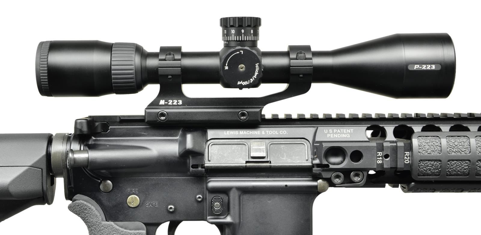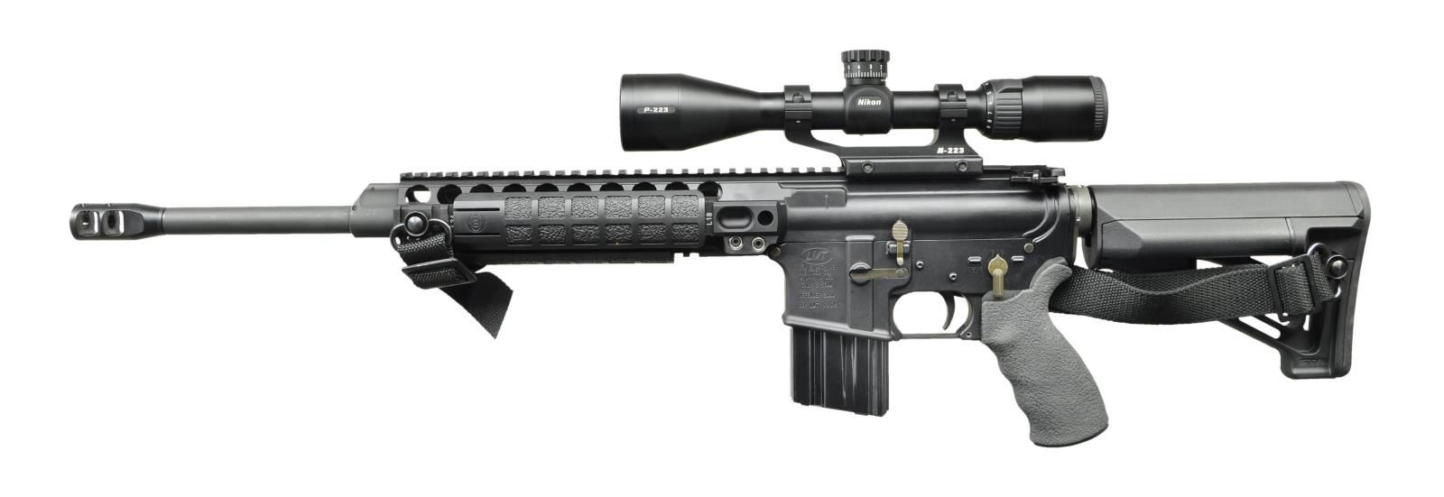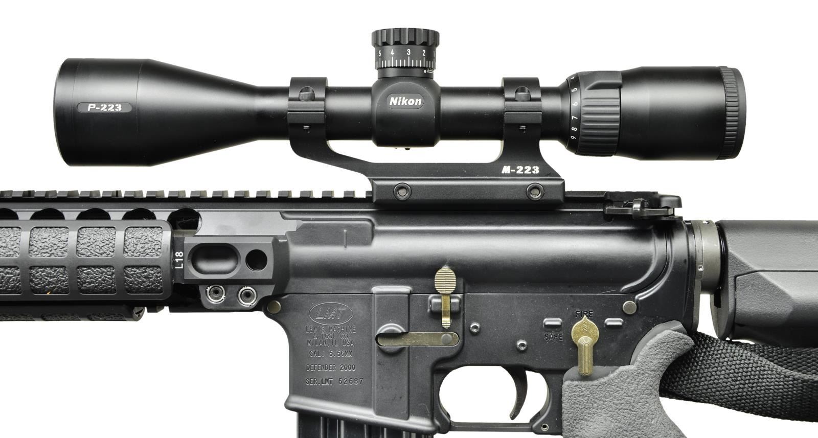 Cal. 5.56mm. S# LMT62687. Bbl. 16" chrome lined target barrel marked "MP 5.56 NATO 1/7 CB" terminated w/ threaded muzzle brake. Low profile gas block under LMT monolithic rail system. Top rail provides over 16" of real estate for optics mounting. Side & bottom rails are 8" in length, sporting LMT rail covers. Receiver has round forward assist & brass deflector w/ dust cover. Tactical charging handle. LMT lower receiver has left side controls. Stippled rubber pistol grip w/ storage compartment. 6 position, Magpul STR collapsible stock. Currently sporting M-223 scope mount & Nikon P-223, 3x9x40 BDC scope w/ BDC 600 reticle. MAGS: (9 total) 3 steel E-Lander 30rd., 4 Aluminum 30 rd., 1 aluminum 20rd., 1 steel 20rd. UNATTACHED ACCESSORIES: 42" black DRAGO rifle case, black nylon 2-point sling, spare LMT fixed stock, front & rear open sights, micrometer adjustable torque wrench, Cabela's cleaning kit, original Nikon scope box. CONDITION: all aspects indicate very little use, if any. Finish coverage is unblemished and normal tell-tale signs such as brass markings on deflector are absent. Scope glass appears clear w/ well defined reticle. Bright bore w/ strong rifling. Fire control mechanism appears to function correctly when cycled by hand. (22-5542/JZ). MODERN. $1,200-1,800.