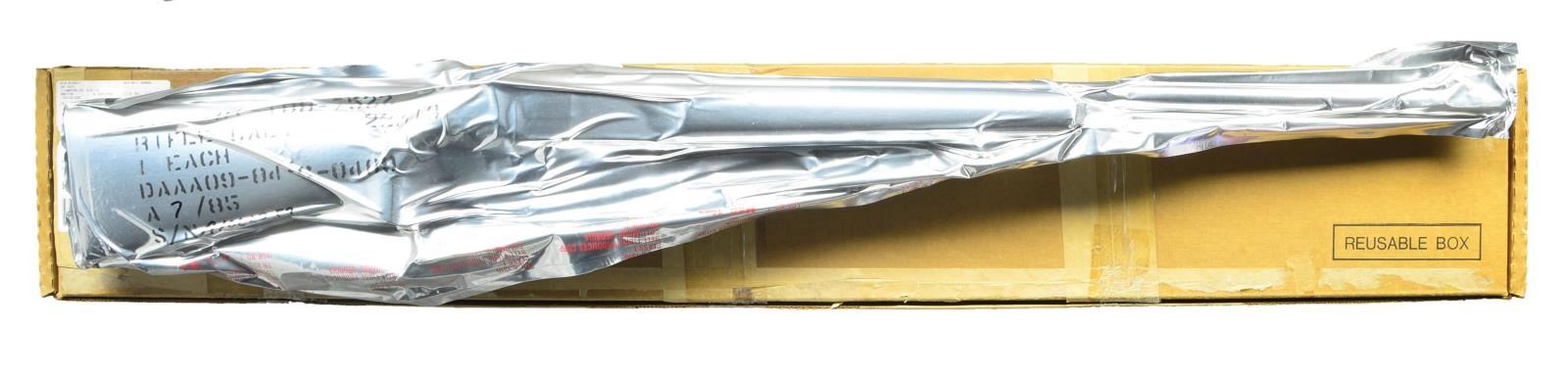 Cal. 22LR. S# A1066253. Bbl. 27". Mfg. 1984-1986. These Remington rifles were manufactured for the US Military for marksmanship training and later sold to the public through the Civilian Marksmanship Training Program. This rifle is exactly as shipped from CMP, still vacuum sealed in the foil package, as well as the bolt & sights, sealed in their own silver vacuum packaging. UNATTACHED ACCESSORIES: Original cardboard box as shipped from CMP to original purchaser. Sights & bolt, also vacuum sealed in separate packaging. CONDITION: Presumed new. Unable to verify condition due to its being vacuum sealed in foil packaging as shipped from CMP. Date of packaging July, 1985. (23-487/JZ). MODERN. $1,000-1,500.