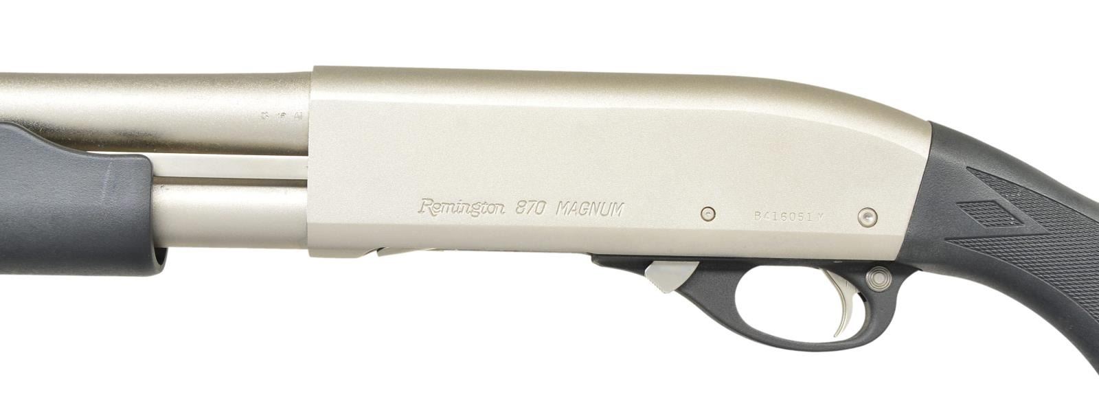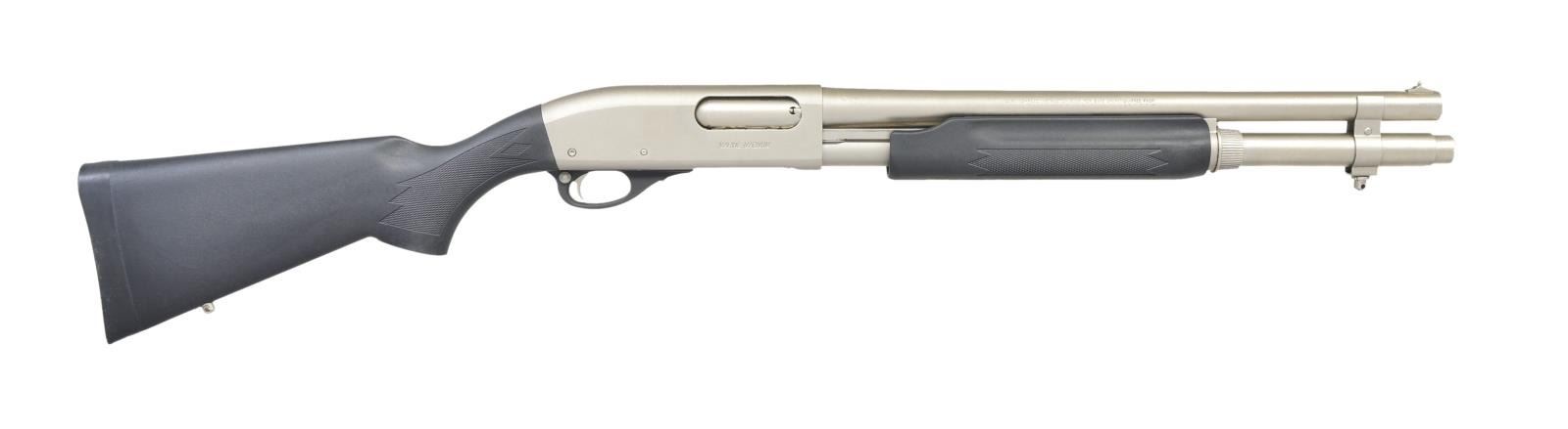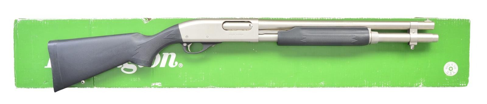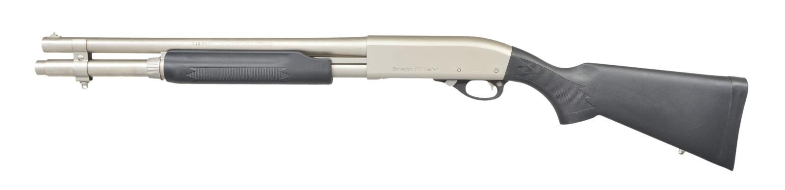 Cal. 12 Ga. S# B416051M. Bbl. 18". Mfg. 1988. Electroless Nickel finish on all exposed metal surfaces w/ black synthetic furniture. Sling studs front & rear. Silver bead front sight. Rubber recoil pad. Full length magazine tube. UNATTACHED ACCESSORIES: green factory box & paperwork. CONDITION: all aspects indicate very little use. No obvious degradation of any kind. Bright, shiny bore. (23-498/JZ). MODERN. $500-800.
