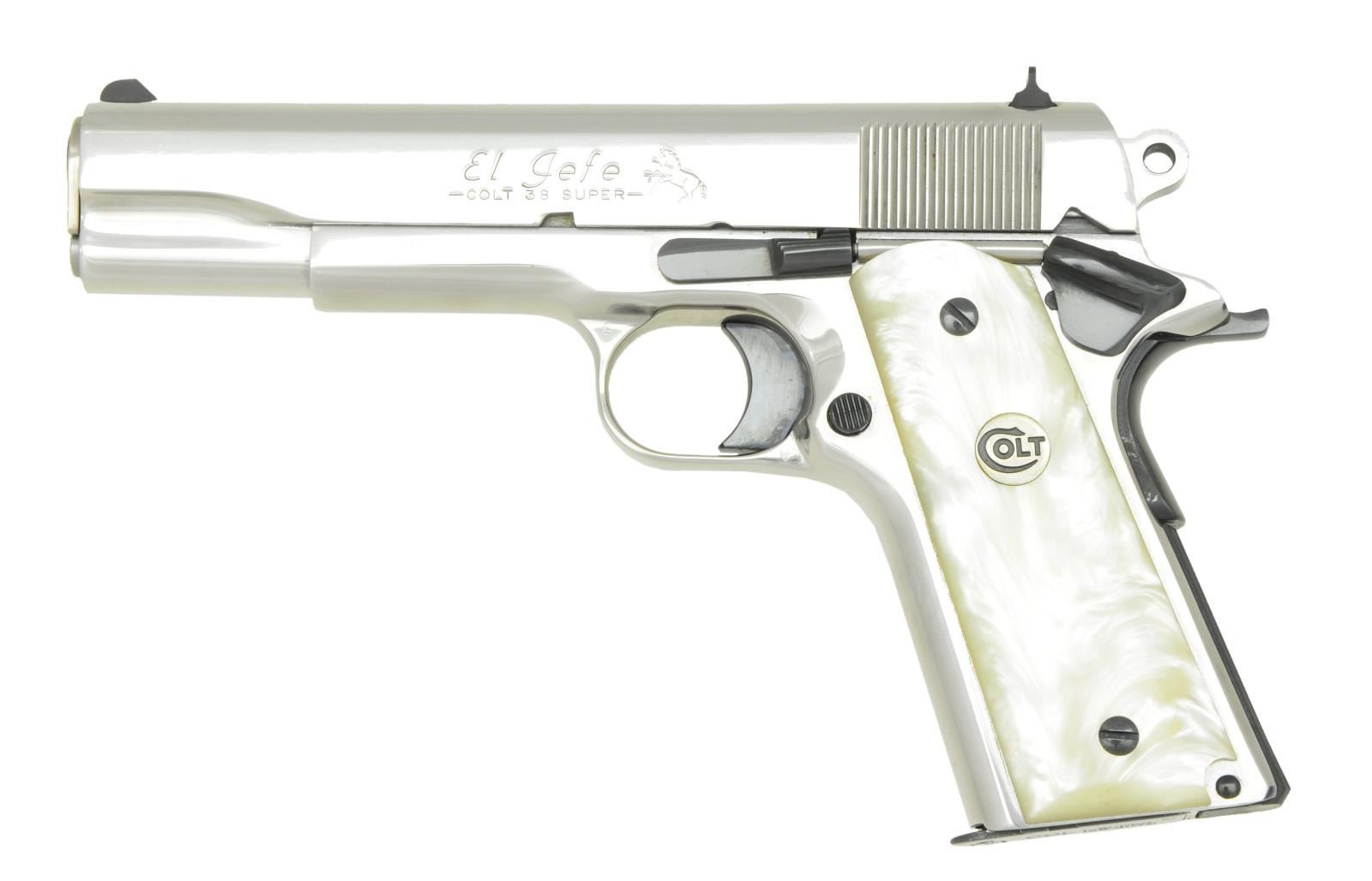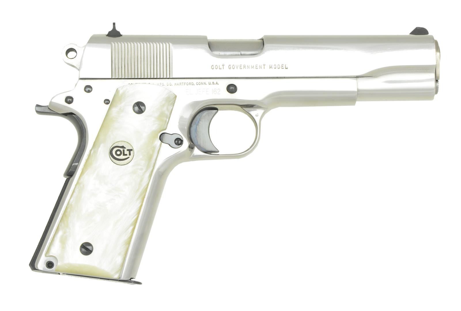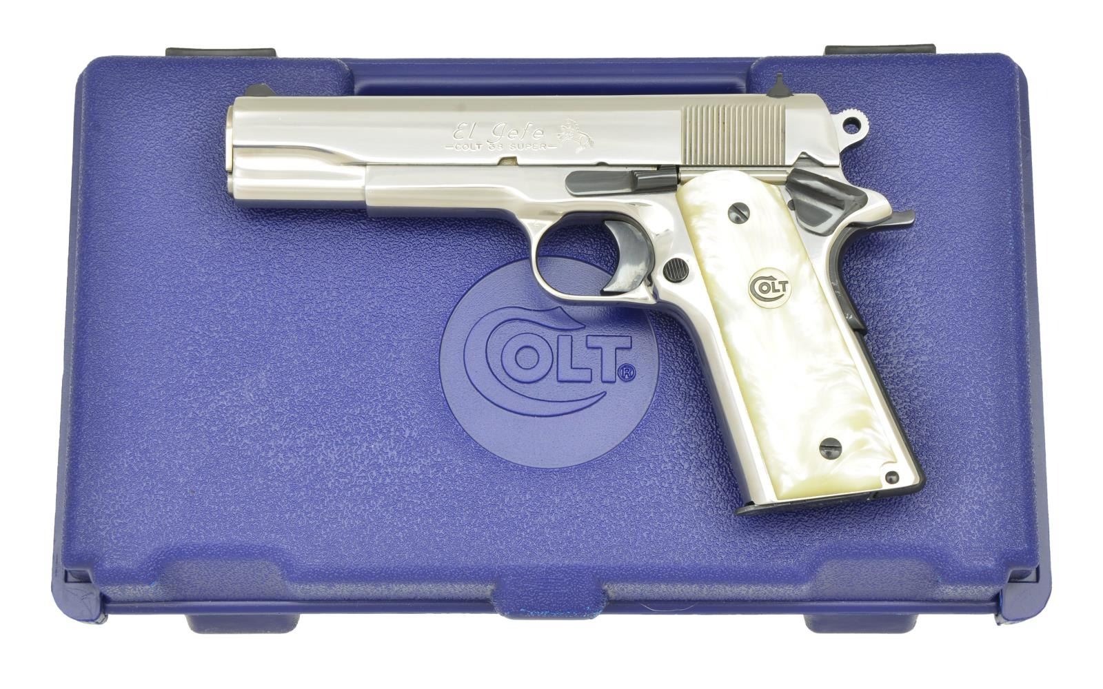Cal.38 Super. S# ElJefe162. Bbl. 5". Mfg.1992. 1 of 500 special edition pistols manufactured for Lew Horton Distributors. Highly polished stainless steel finish. Serrated slide. 3 dot sights. Left side controls. Small parts including trigger, backstrap safety, mag release, slide release & thumb safety are polished blued finish. Bevelled mag well. Serrated backstrap w/ smooth front strap. Pearlite grips w/ Colt medallion. MAGS:1 factory 9rd. UNATTACHED ACCESSORIES: Colt numbered cardboard box w/ factory fitted blue plastic carry case & paperwork. CONDITION: All aspects indicate as new. No noticeable blemishing of any kind. Finish has a high luster w/ no sign of prior use beyond test firing..Bright bore w/ strong rifling. 23-741(/JZ). MODERN. $3,250-4,250.