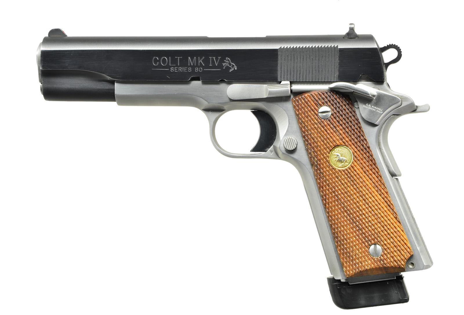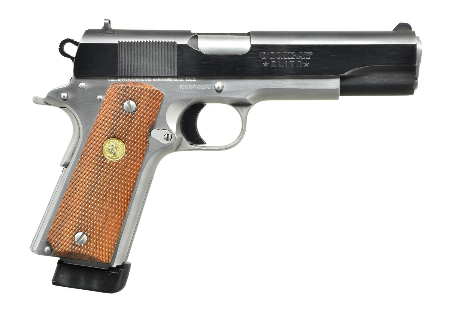 Cal. 45 ACP. S# CG02686. Bbl.5". Mfg. 1986. Colt MKIV Series 80 Combat Elite. 2 tone finish, blued serrated slide w/ stainless frame. Skeletonized, serrated hammer spur. Serrated thumb safety, slide release & mag release. Beavertail safety. Serrated front strap & backstrap. Smooth, solid trigger. Gently beveled mag well. 3 dot sights. Checkered hardwood grips w/ gold Colt medallion. MAGS: 1 Wilson Combat 8rd. CONDITION: finish on exposed metal parts complete & consistent. A few handling marks under close inspection, mostly limited to areas of mechanical intervention. Grips in very nice condition, free from any noticeable blemishing w/ bright medallions. Bore is bright w/ strong rifling. (23-25/JZ). MODERN. $800-1,200.