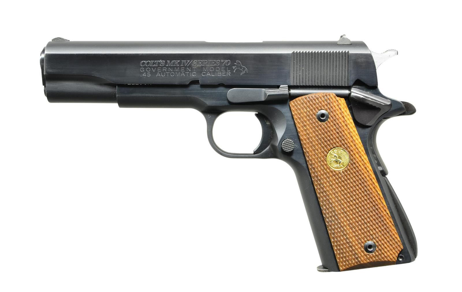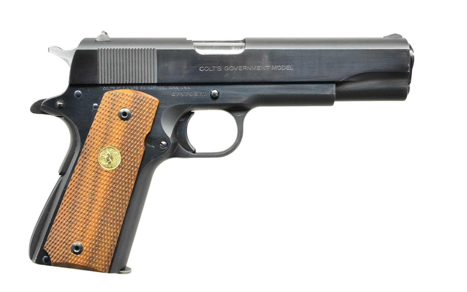 Cal. 45 ACP. S# 47576B70. Bbl. 5" Series 70 w/ finger bushing. Mfg. 1980 (1970-1983) w/ fully checkered walnut grips having gold Colt medallions. All standard Government Model features including checkered mag. release plus grooved items of: arched mainspring housing, short steel trigger, spur hammer, slide stop & thumb safety. Replacement Allen head grip screws. Fixed sights; serrated angled front & square notched drift adjustable rear. MAGS: 1 good factory marked 7 rd. CONDITION: all aspects near excellent including bore & grips. (23-484/NW). MODERN. $900-1,400.