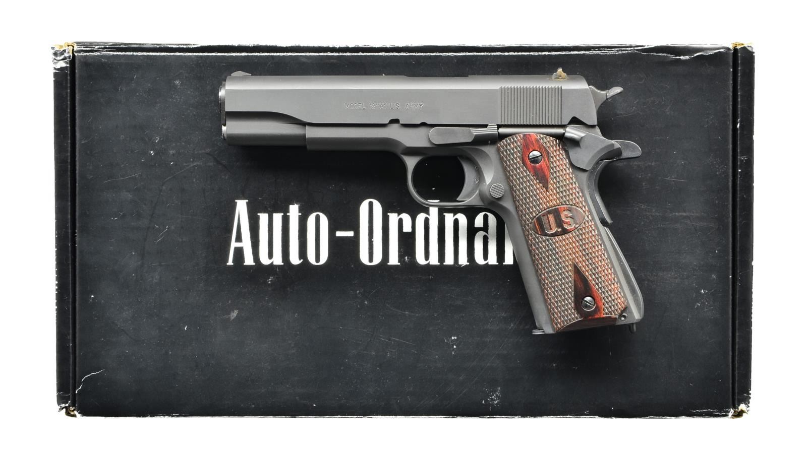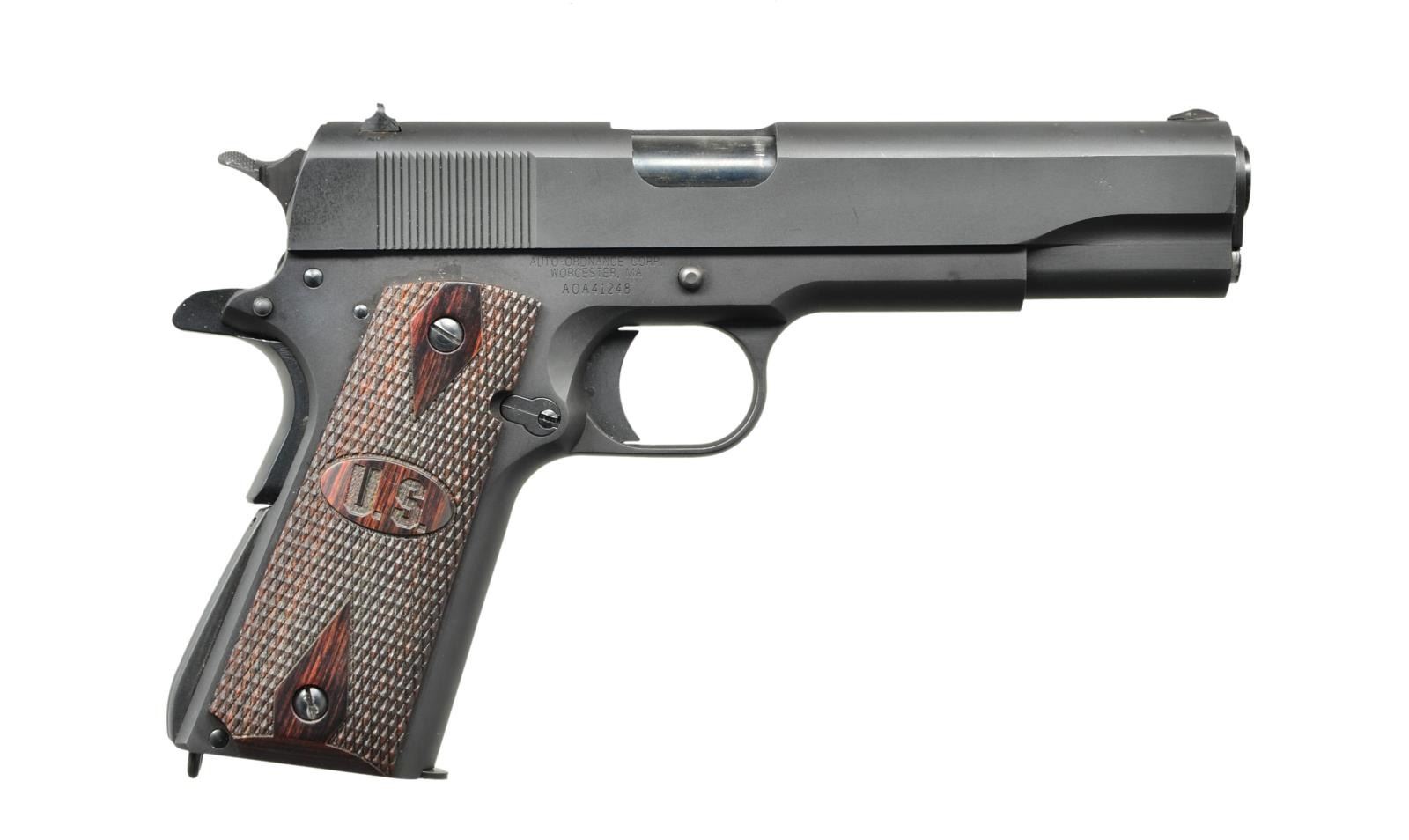 Cal. 45 ACP. S# AOA41248. Bbl. 5". Serrated slide w/ ramp front & rear drift adjustable sights. Black parkerized finish. Slide engraved "Model 1911A1 U.S. Army" on left side. Checkered hammer spur & mag release. Serrated rear mainspring cover & smooth front strap. Serrated slide release. Lanyard loop below pistol grip. Dark checkered hardwood double diamond grips w/ "US" engraved in oval in center. MAGS: 2 steel 8rd. UNATTACHED ACCESSORIES: factory foam lined cardboard box, paperwork, lock & spare set of faux bone grips. CONDITION: finish on frame & slide enjoy complete & consistent coverage w/ a few light drag lines in areas of mechanical intervention. Finish thinning on barrel & hammer face from mechanical intervention. Bright bore w/ strong rifling. (22-5527/JZ). MODERN. $500-700.