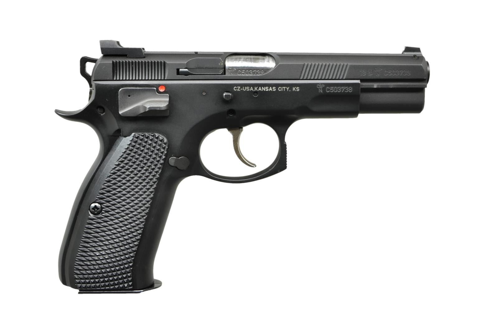 Cal. 9mm. S# C503738. Bbl. 4.5". Traditional double action pistol w/ steel frame however this defensive pistol has a tuned trigger system with a shorter single-action reset and Pre-B style slide. Matte black finish. Front & rear serrated slide w/ Trijicon front blade & serrated Combat II rear sights. Left side controls including serrated slide release, extended mag release & ambidextrous thumb safety. Full length stainless steel guide rod. Extended beavertail. Serrated & skeletonized hammer. Aggressively checkered aluminum 2 piece grips. MAGS: 3 steel 16rd. UNATTACHED ACCESSORIES: Black, foam lined, factory case, lock & paperwork. CONDITION: Finish is complete & consistent w/ some thinning primarily in areas of mechanical intervention. All aspects indicate very little use. Bright bore w/ strong rifling. (23-854/JZ). MODERN. $800-1,200.