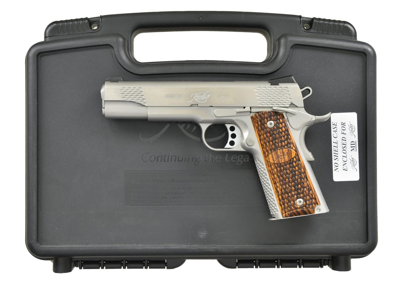 II STAINLESS SEMI AUTO PISTOL. Cal. 45 ACP. S# K459796. Bbl. 5”. Custom shop mfg. stainless barrel, frame and slide with scales atop the slide and on the sides of the slide also on the front gripstrap. Night sights marked MH3 still work but are fading in intensity. Ambidextrous thumb safety, beavertail grip safety and checkered mainspring housing. Anodized trigger and scaled wooden grips with Kimber logo. MAGS: 1-7 rd. factory. UNATTACHED ACCESSORIES: Factory black plastic hardcase serial numbered to the pistol with manual, safe chamber indicator, lock, bushing wrench, oil and paperwork. CONDITION: All aspects are near excellent, showing little evidence of use. Bore is near excellent, bright and strong. (22-2928/CW) CURIO. $800-1,200.