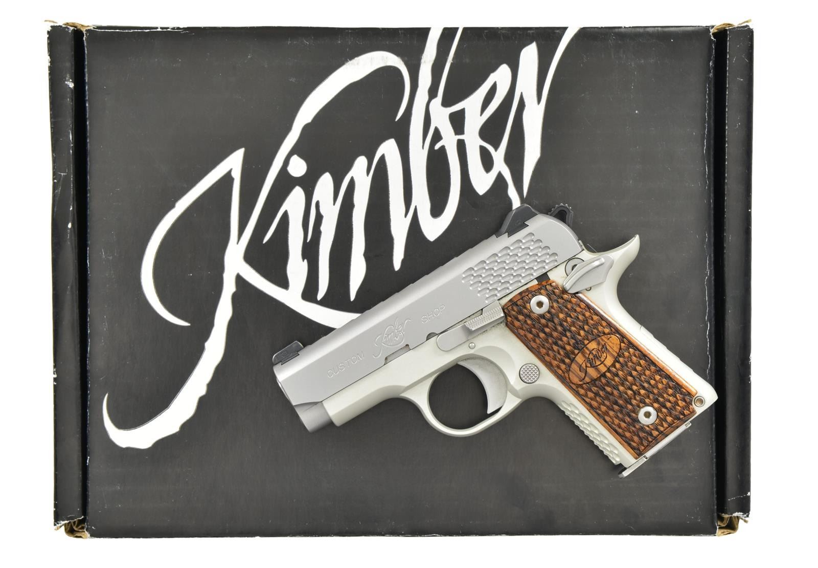 Cal. 380 ACP. S# P0001615. Bbl. 2 3/4". Stainless steel barrel and slide with an aluminum frame. Full length guide rod with decorative scaling on back sides of slide along with front and backstrap serrations. Zebra wood grips with Kimber logo and scale pattern. MAGS: 1-6 rd. factory. UNATTACHED ACCESSORIES: factory cardboard box serial numbered to the pistol includes a factory zippered soft case, manual, lock, safe chamber indicator, oil and paperwork. CONDITION: all aspects near excellent, showing light use only. Bore is near excellent, bright and strong. (22-2944/CW). MODERN. $400-600.