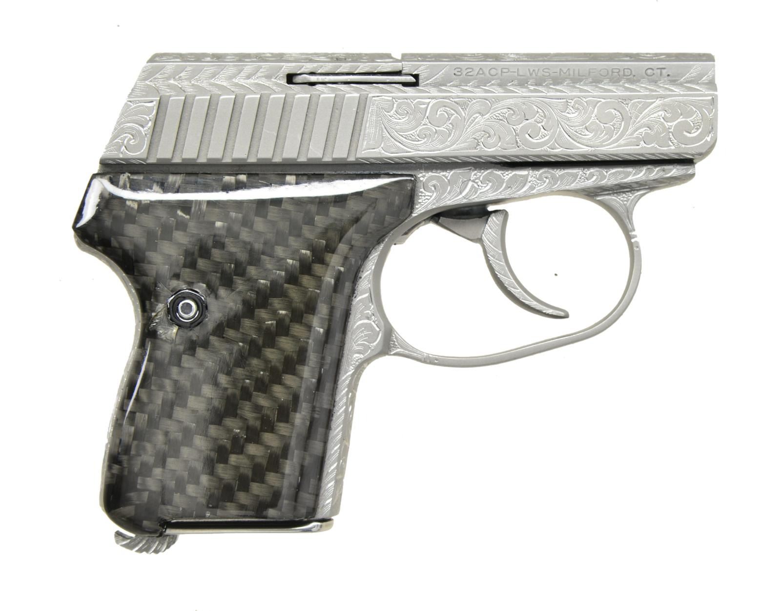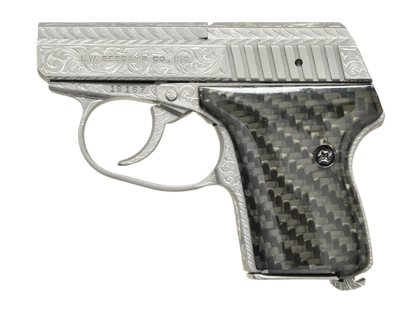 Cal. 32 ACP. S# 19167. Bbl. 2". As if the Seecamp pistols aren't desirable enough, this one has been completely engraved by Master Engraver Robert Valade in a scroll type vine pattern. From the top of the slide to the magazine floorplate(s) all but the inside of the trigger guard and serrated portion of the slide has full coverage. Robert Valade was a very well-known engraver with a client list including Clint Eastwood, Burt Reynolds, Ronald Reagan & John Wayne boasting almost 13,000 engravings before his passing in 2016. His name is signed in the scroll work below the barrel of this example. The Seecamp is a tiny, double action only, matte finish, stainless steel pistol. As these pistols were made for deep concealment, w/ a very small footprint, there are no sights. Serrated slide. Bottom mag release. Smooth carbon fiber grips. MAGS: 2 factory 6rd. UNATTACHED ACCESSORIES: factory cardboard box, paperwork, original grips, single mag pouch & 2 spare magazine floorplates (1 fully engraved). CONDITION: It is unclear if this has been fired beyond test firing. All aspects are as new. Bright bore. (22-5997/JZ). MODERN. $800-1,200.