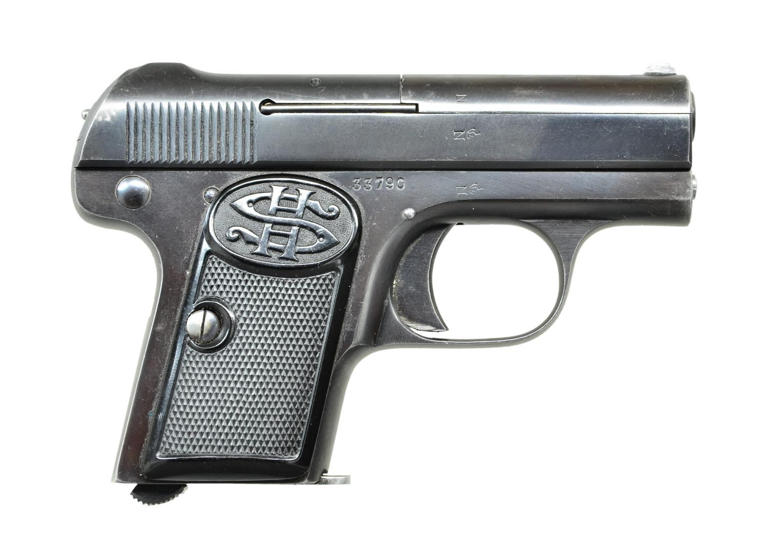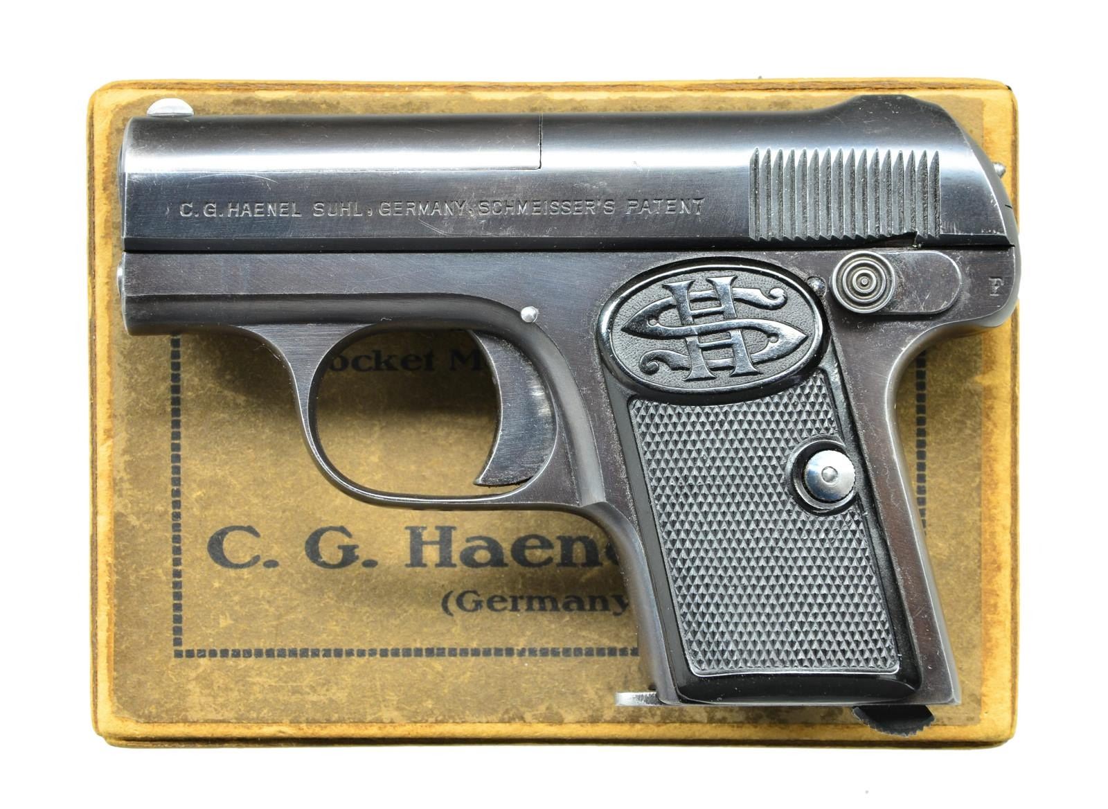 Cal. 25 ACP. S# 33790. Bbl. 2". Mfg. 1922-1930 by C. G. Haenel in Suhl, Germany. Often referred to as Schmeisser Pistol; HS logo border checkered hard rubber grips. First variation w/ safety lever, mag. safety & cocking indicator; known for its quality workmanship. Mag. can only be changed when safety lever is on safe. German pre-war crown N proofs on frame, slide & bbl. Box designates it as "Pocket Model". MAGS: 1 very good factory 6 rd. UNATTACHED ACCESSORIES: very good original 2 piece box having metal reinforced corners. Bottle style bore brush. CONDITION: overall near excellent w/ very slight thinning of finish at left front near muzzle. Near excellent bore & grips. (23-56/NW). CURIO. $450-600.