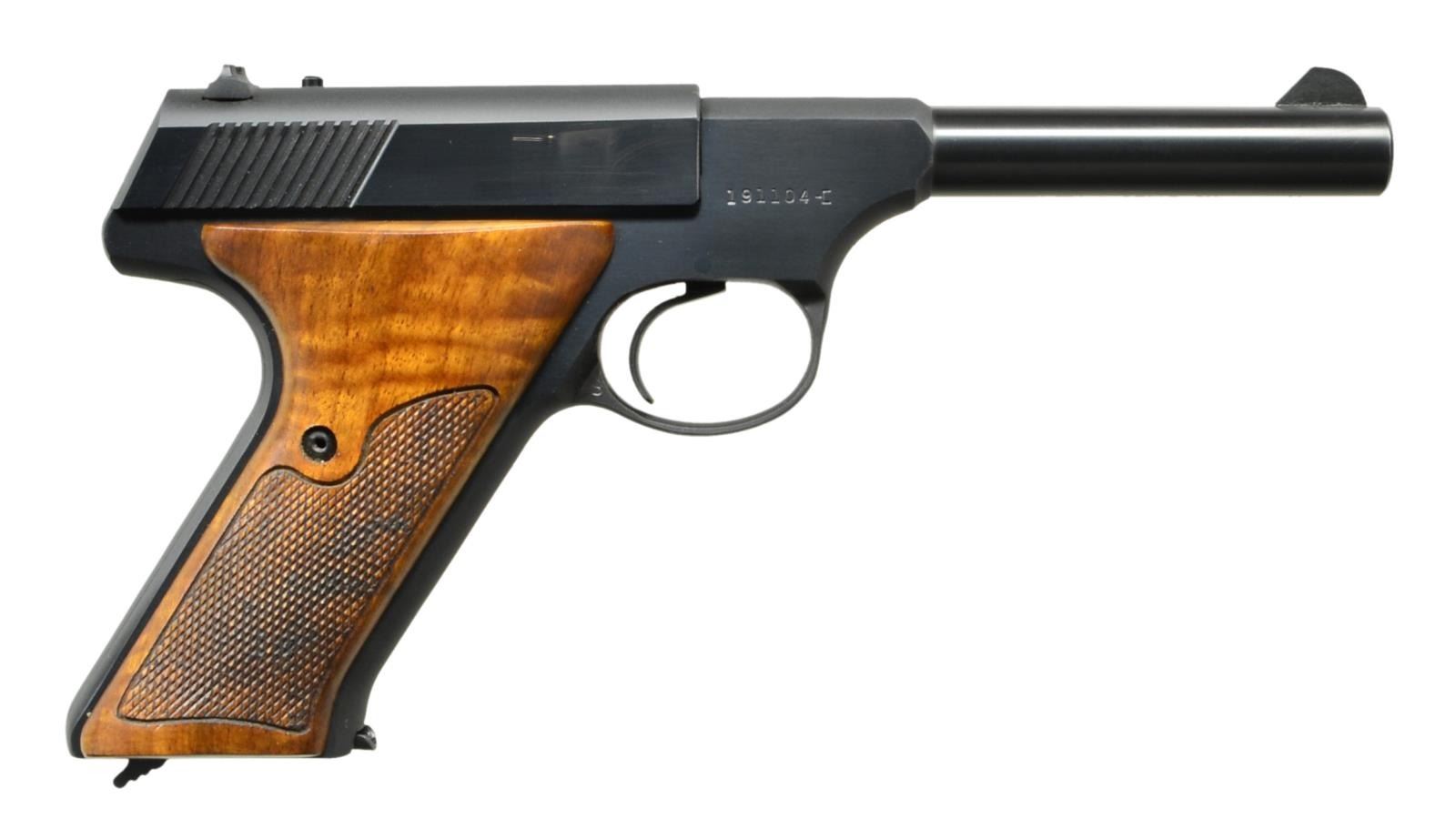 Cal. 22 LR. S# 191104-C. Bbl. 4.62". Mfg.1955-1977. Blued finish. Round barrel w/ blade front & drift windage adjustable rear sights. Serrated slide. Left side slide release. Bottom mag release. 2 piece Walnut checkered grips. Smooth front strap & backstrap. Consigner states; "This firearm was purchased by me while I was employed at Colt Firearms and other than the usual test firing, it remained unfired." MAGS: 1 steel 10rd. UNATTACHED ACCESSORIES: numbered factory cardboard box & paperwork. CONDITION: finish is complete & consistent w/ little sign of use. Gentle thinning in areas of mechanical intervention, which happens almost immediately. Bright bore w/ strong rifling. (23-240/JZ). MODERN. $700-1,000.