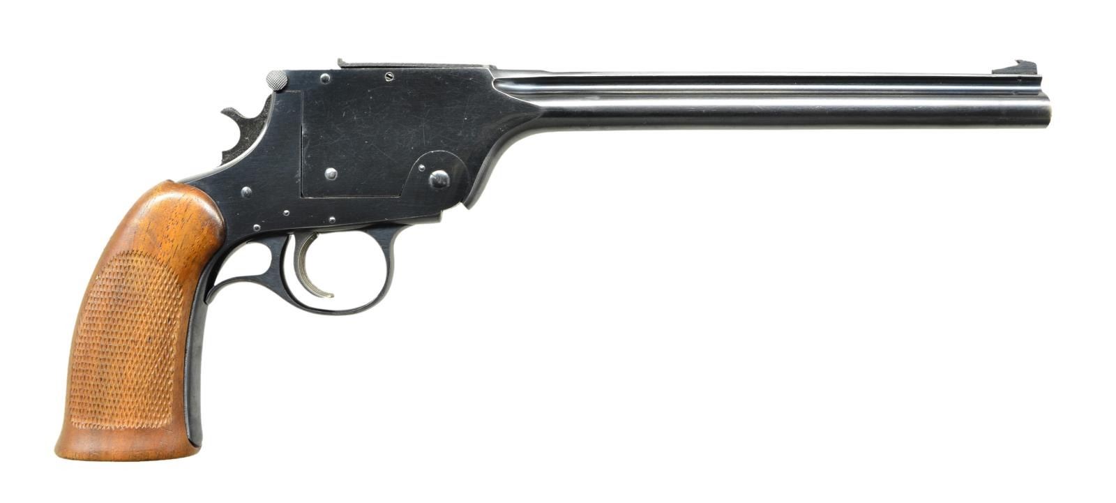 Cal. 22 LR. S# 926. Bbl. 10". Fine early example w/ fixed front & adjustable rear sights. Grooved trigger, round extractor & single piece walnut checkered grip. CONDITION: metal retains about 95% original blue w/ numerous fine to light handling marks, scratches & fine dings. Top of rear sight has some deep scratches w/ rust in them. Grip screw slot is buggered. Base of grips show numerous fine dings; balance is fine w/ strong checkering. Bore is very good, bright & strong. (23-761/CW). CURIO. $700-1000.