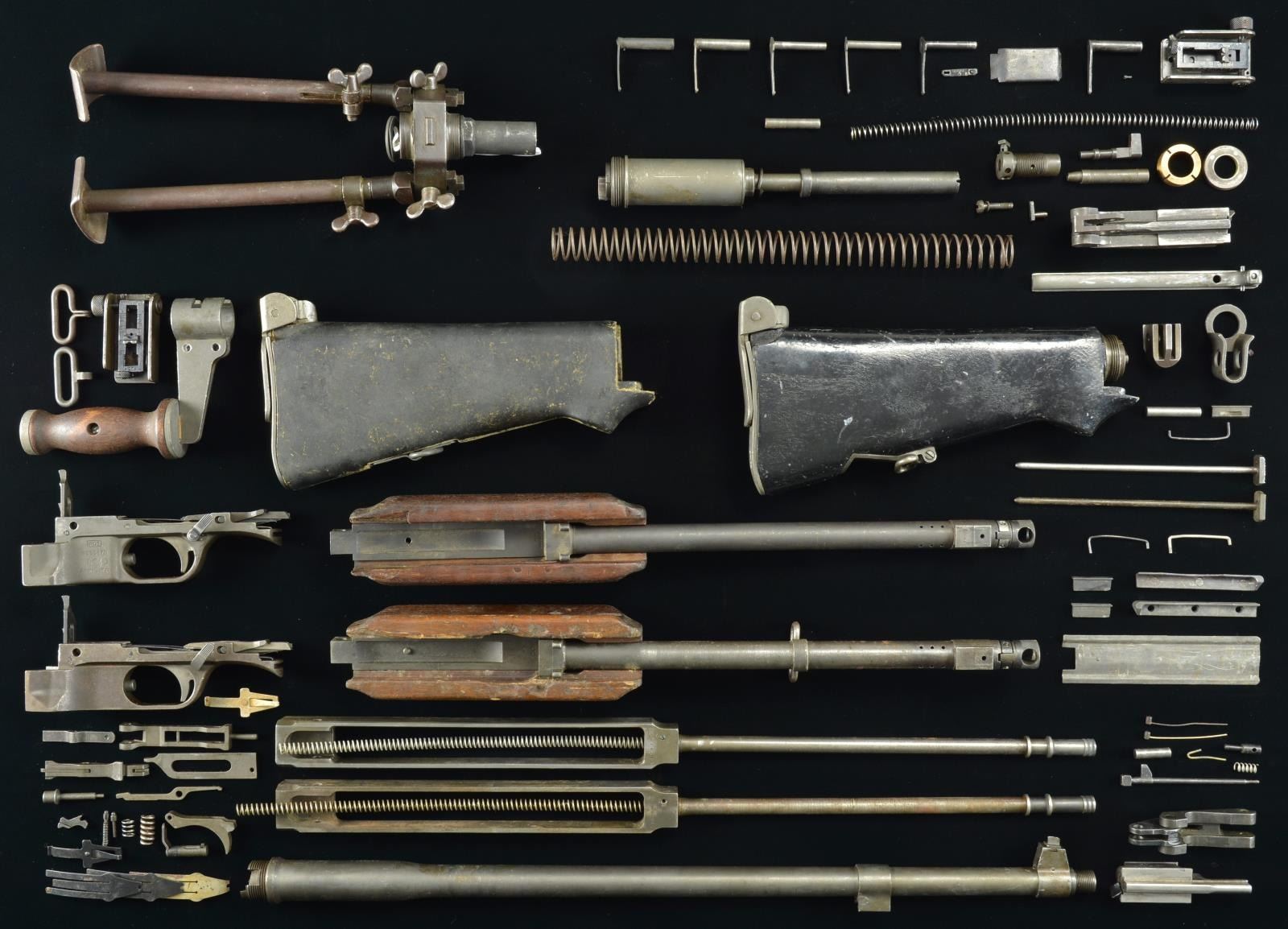 Cal. 30-06. Bbl. 24". Grouping of parts appearing to be a complete parts kit, for the Browning 1918A1, less receiver, w/ multiples of numerous parts. 1 barrel, manufactured by NESA, dated 11-43, w/ ordnance flaming bombs. Bore is bright w/ sharp rifling. Lots of small parts & springs w/ doubles of some. Doubles include stock, buffer, forend, bolt, trigger group, gas piston & gas cylinder tube assembly. CONDITION: all parts are used, military surplus, all appearing serviceable. (02-18036/JZ). NON-GUN. $3,000-4,000.
