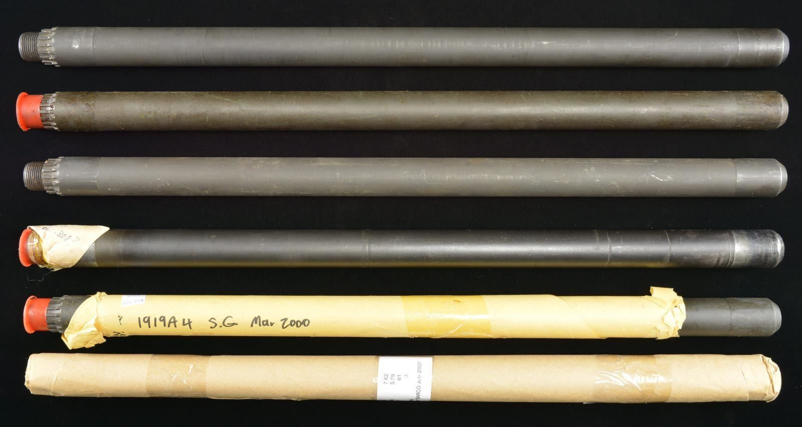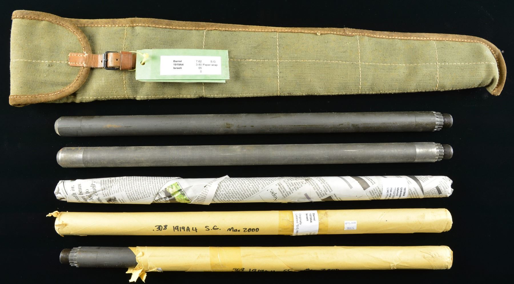 1919A4. Cal. 308. Bbl. 24" Mfg. Israeli. 11 browning 1919A4 barrels chambered in 7.62 NATO. Black parkerized exterior finish. UNATTACHED ACCESSORIES: 5 barrels packaged in PVC tubes. 2 barrels in 1 canvas / leather carry bag. CONDITION: Two sample barrels cleaned to evaluate bore condition w/ shiny bore & strong rifling. Remainder coated in cosmoline, internally. Rifling appears strong but would necessitate thorough cleaning to individually evaluate. (02-18109-21; 02-18109-22/JZ). $1,100-2,200.