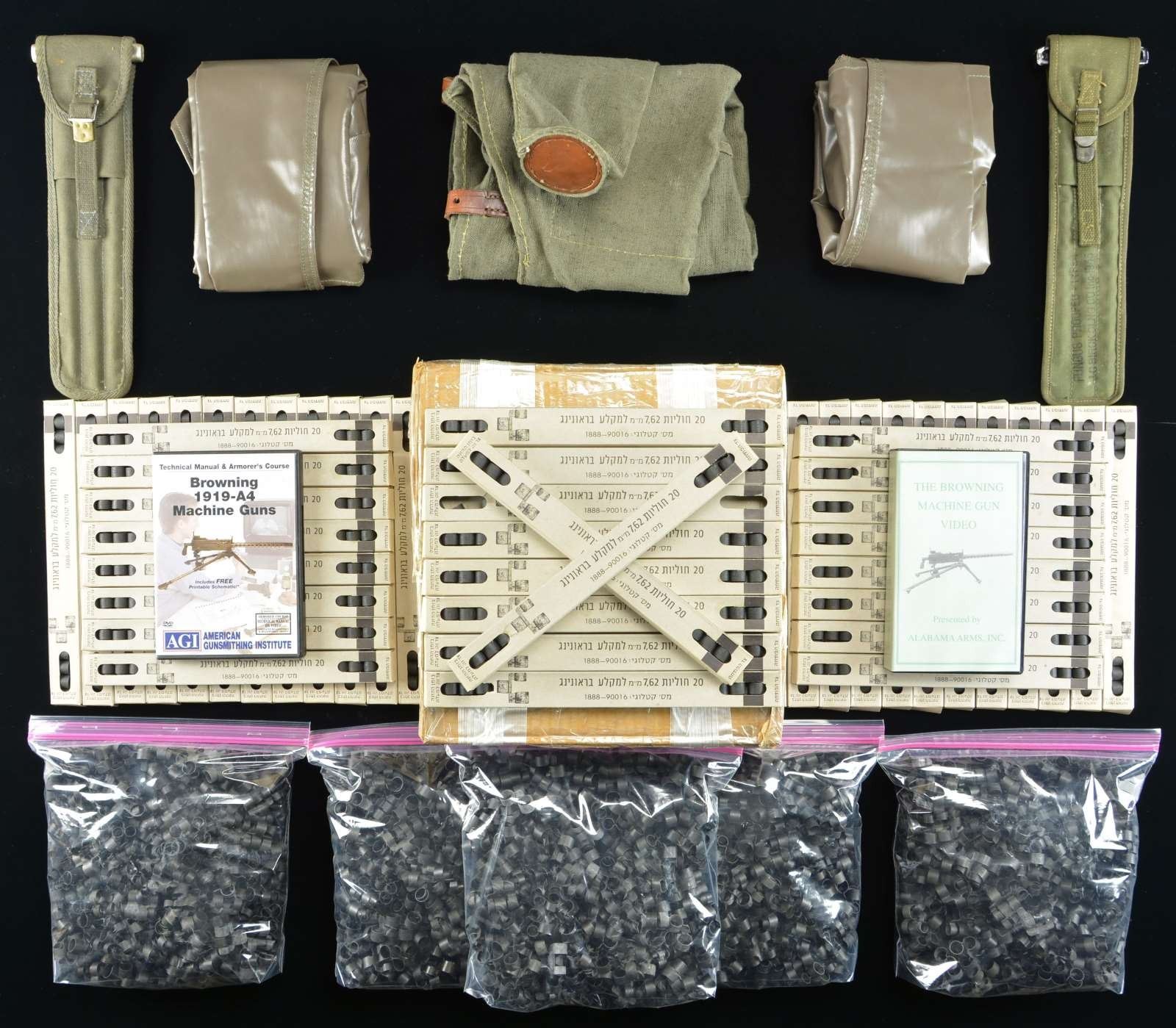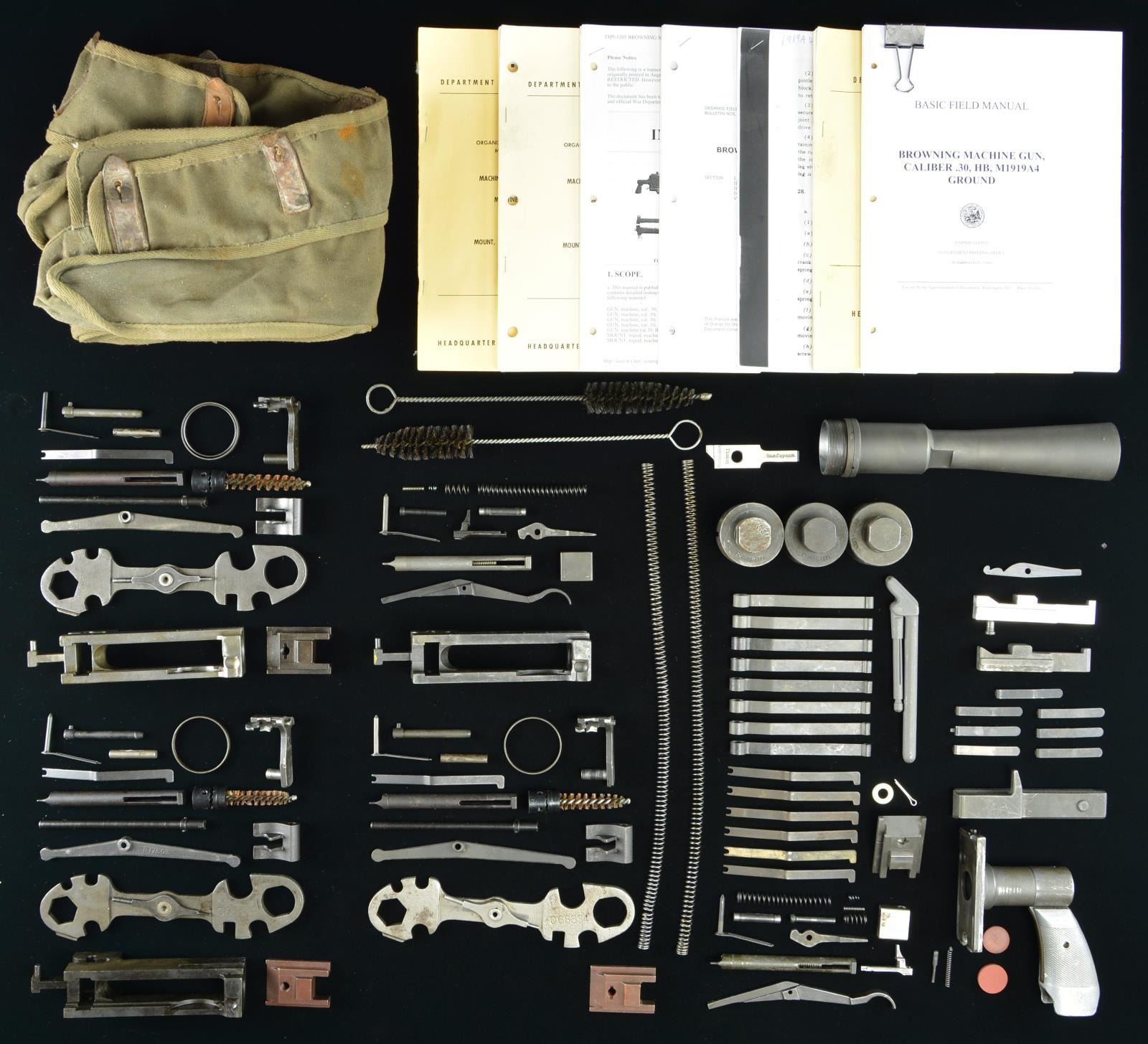 PARTS & ACCESSORIES. • Books & videos include Browning Machine Gun 1919A4 Basic Field Manuals, Technical Manuals, Browning Machine Gun Video (VHS) & AGI Browning Machine Gun Armorer's Course (DVD). • Parts & tools include 1 Browning 1919 Chamber brush, 8 belt starter tabs, 2 M1 cleaning rods in green canvas cases, backplate & pistol grip, top cover latch, 1919A6 flash suppressor, timing & headspace gauge, barrel bearing wrenches, broken shell extractor, belt filling machine spare parts, extractors, 3 barrel extensions, several springs, rings, brushes, pins & wrenches. 2 green canvas & 2 green rubber gun covers. 50# of 308 links. (02-18109-7, 02-18109-13, 02-18109-14, 02-18109-16/JZ). $300-600.