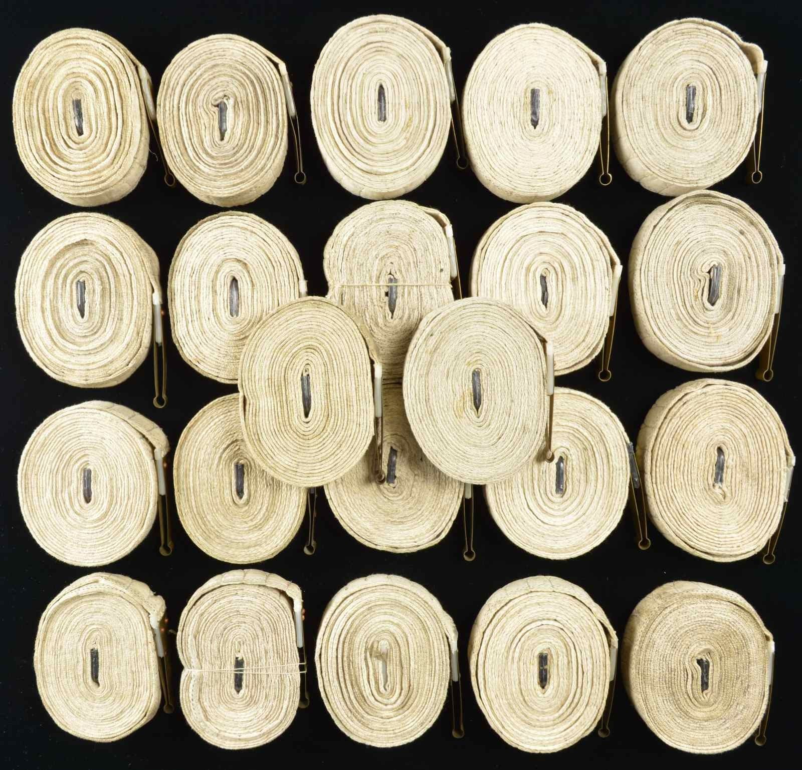 Lot of 50 cloth belts for feeding Browning Model 1919 MG. 8 cloth 100 rd. belts, white w/ black stitching, each end terminated w/ brass grommet. Most appear as new or very lightly used at most. 37 of the 250 rd. belts are white cloth and have a brass starter tab at one end. 5 of the 250 rd. belts are OD green w/ black stitching & steel starter tabs. All appear lightly used w/ no abnormal stretching visible. (02-18109-4, 02-18109-5 & 02-18109-16/JZ). $1,100-1,700.