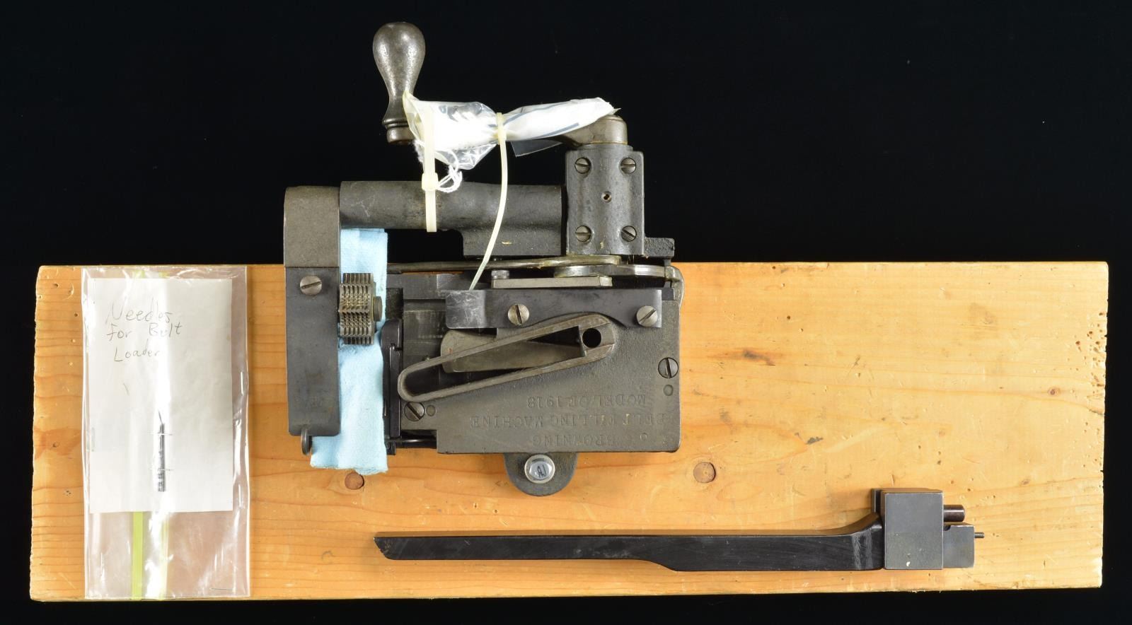 Steel construction. Utilized to place the rounds in a fabric belt in precisely the right position for feeding. The model 1918 saw heavy use for all models of the 30 cal. Browning MG's. This early design utilizes needles to open the fabric belt pockets so the cartridge would be properly positioned. Later & more common versions utilized a shuttle for this purpose. Marked "BROWNING BELT FILLING MACHINE MODEL OF 1918". Currently mounted on 7"x23" board. CONDITION: the belt loading machine appears to function correctly when cycled by hand. All moving parts are fluid & smooth. (02-18109-6/JZ). $600-1,000.