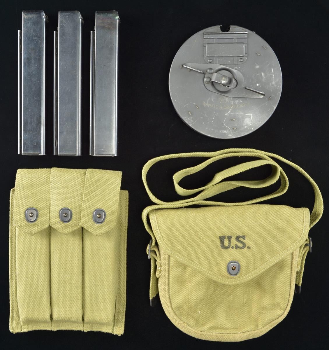 4 MAGS total. 1 steel 50 rd. Drum. Backplate marked "AUTO-ORDNANCE COPR. / BRIDGEPORT, CONNECTICUT / REGISTERED IN THE / U.S. PATENT OFFICE" above "U" for United Specialties. Front plate marked: "MAGAZINE TYLE "L" / THOMPSON SUBMACHINE GUN / 50 CARTRIDGES CAL. 45 / FOR 1928 MODEL WIND TO / 9 OR 11 CLICKS". Drum in tan pouch marked "U.S." on front flap & on inside of flap; "R M CO / 1942". 3 steel 30rd. stock mags w/ blued finish. 2 manufactured by Seymour & 1 by Crosby w/ 3-cell tan mag pouch marked ; "U.S.M.C." above "R.M. CO. / Nom-45412 / 1944". Both magazines carriers are in great condition. (02-19463/JZ). $500-800.
