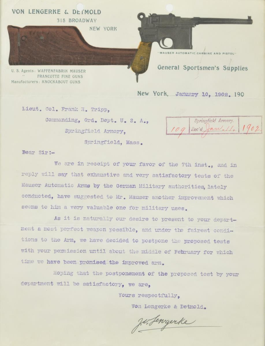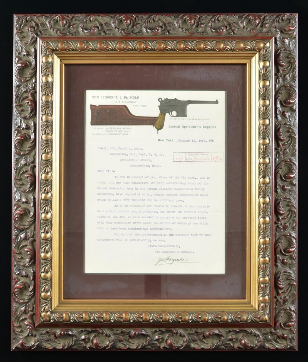 Rare & historic letter from Von Lengerke & Detmold to Springfield Armory stating reason for delay in shipping "Mauser Automatic Arms" to be evaluated by US Military. Letter is dated January 10, 1902 & received on 11th at Springfield stating "Mr. Mauser" had input from German military of suggested improvement which he wished to incorporate so it would be "a most perfect weapon possible". Most notable is Von Lengerke's signature. VL & D were US agents for Mauser & Francotte located at 318 Broadway in NYC. Letter is framed & matted in classic style of the period. Fine addition to early Mauser or military collection. (02-16947-1/NW). $350-500.