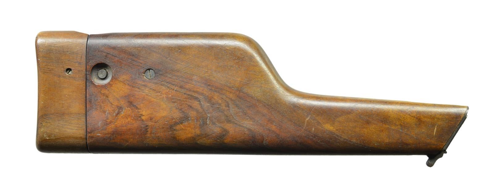 Clear, distinctive Mauser banner in front of hinge base having strap staple. Main portion of stock is slightly figured walnut; cover is lighter colored w/ plain grain & assembled from 2 pieces having faint joining line running top to bottom. Attaching iron is not numbered & noticeably recessed at top tang. Stock has 2 cracks; going through bottom of banner to hinge base (about 3") & top left corner of banner forward (about 1 1/4"). Good overall appearance w/ proper mechanical functioning. (02-16945-25/NW). $250-400.